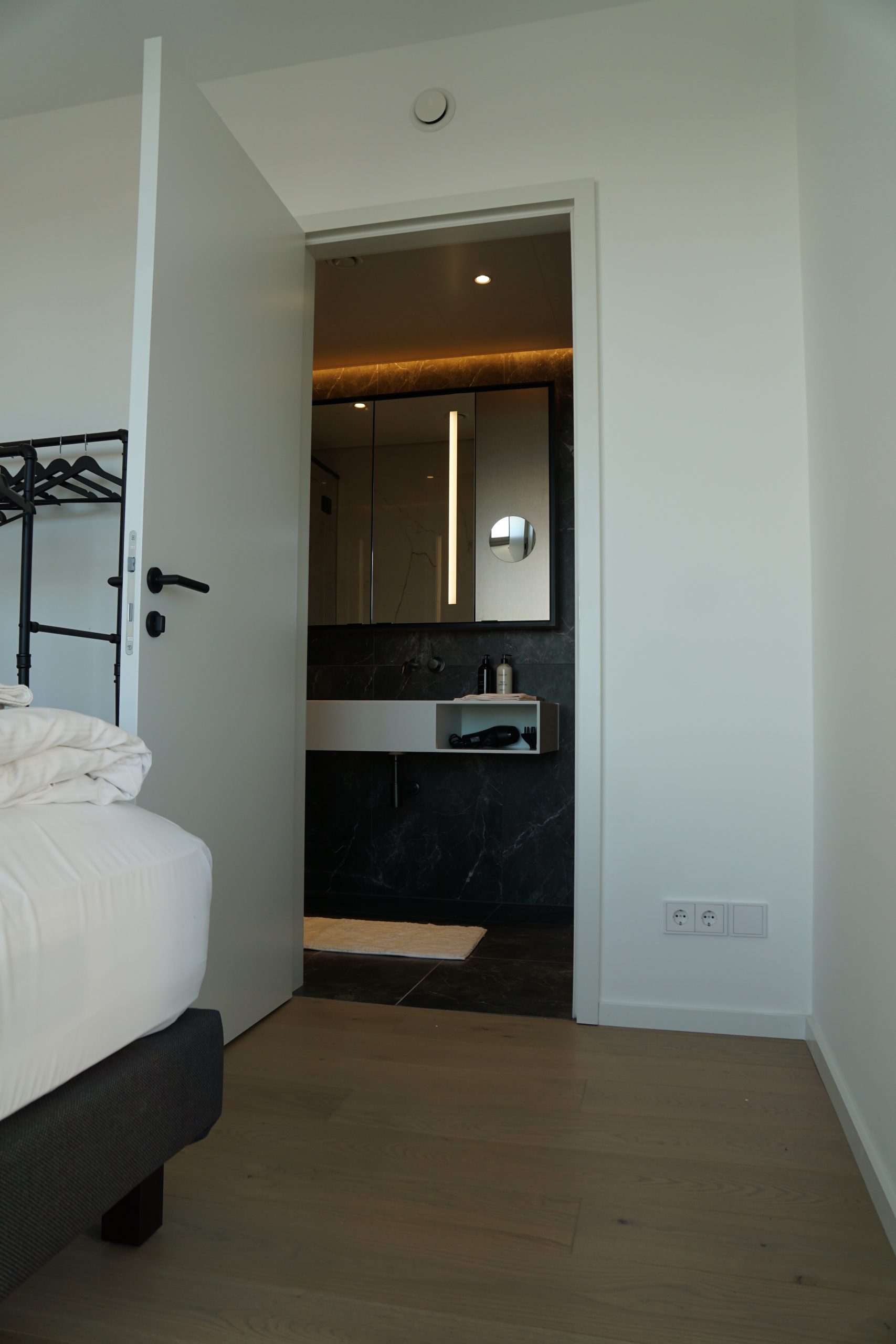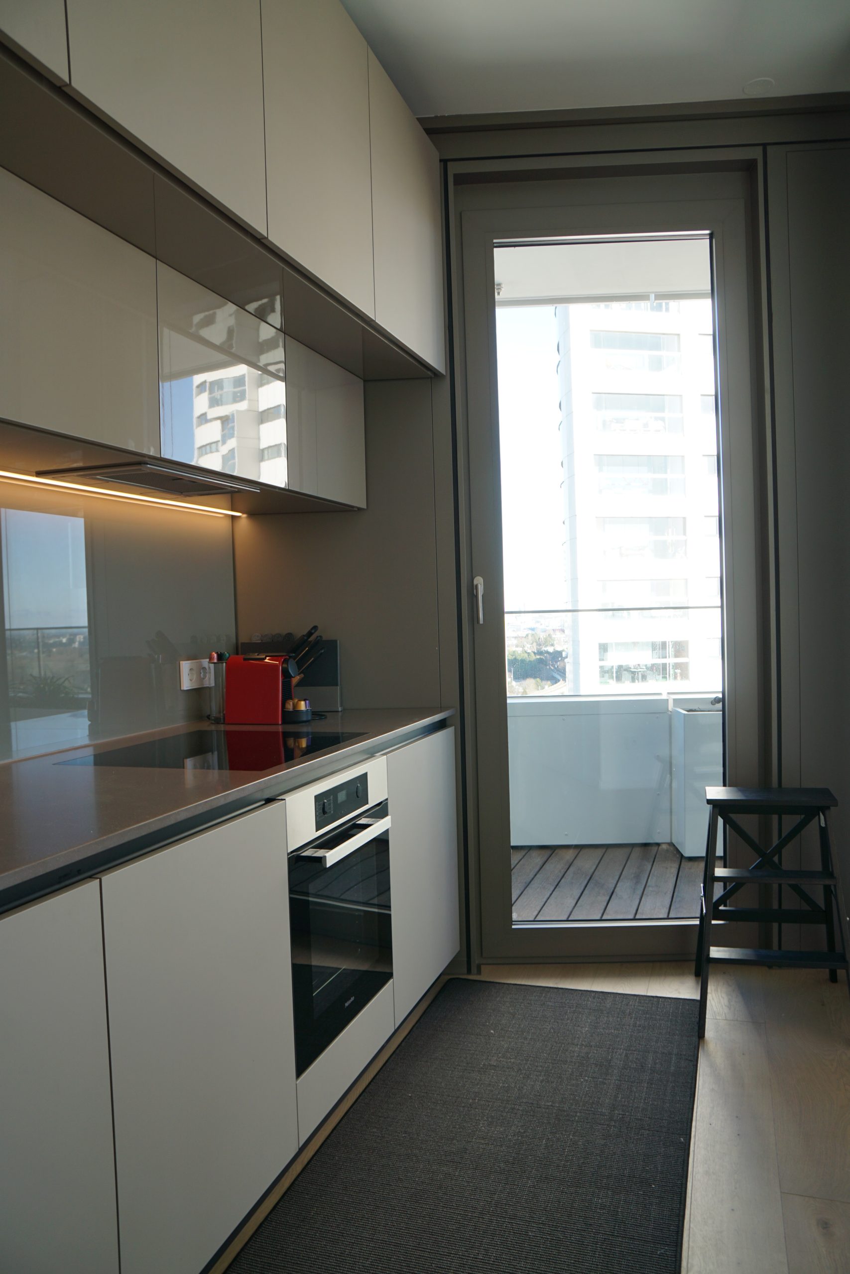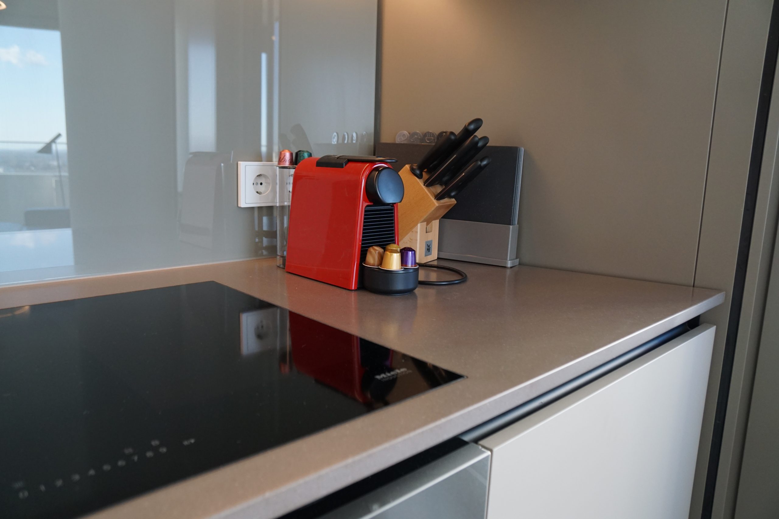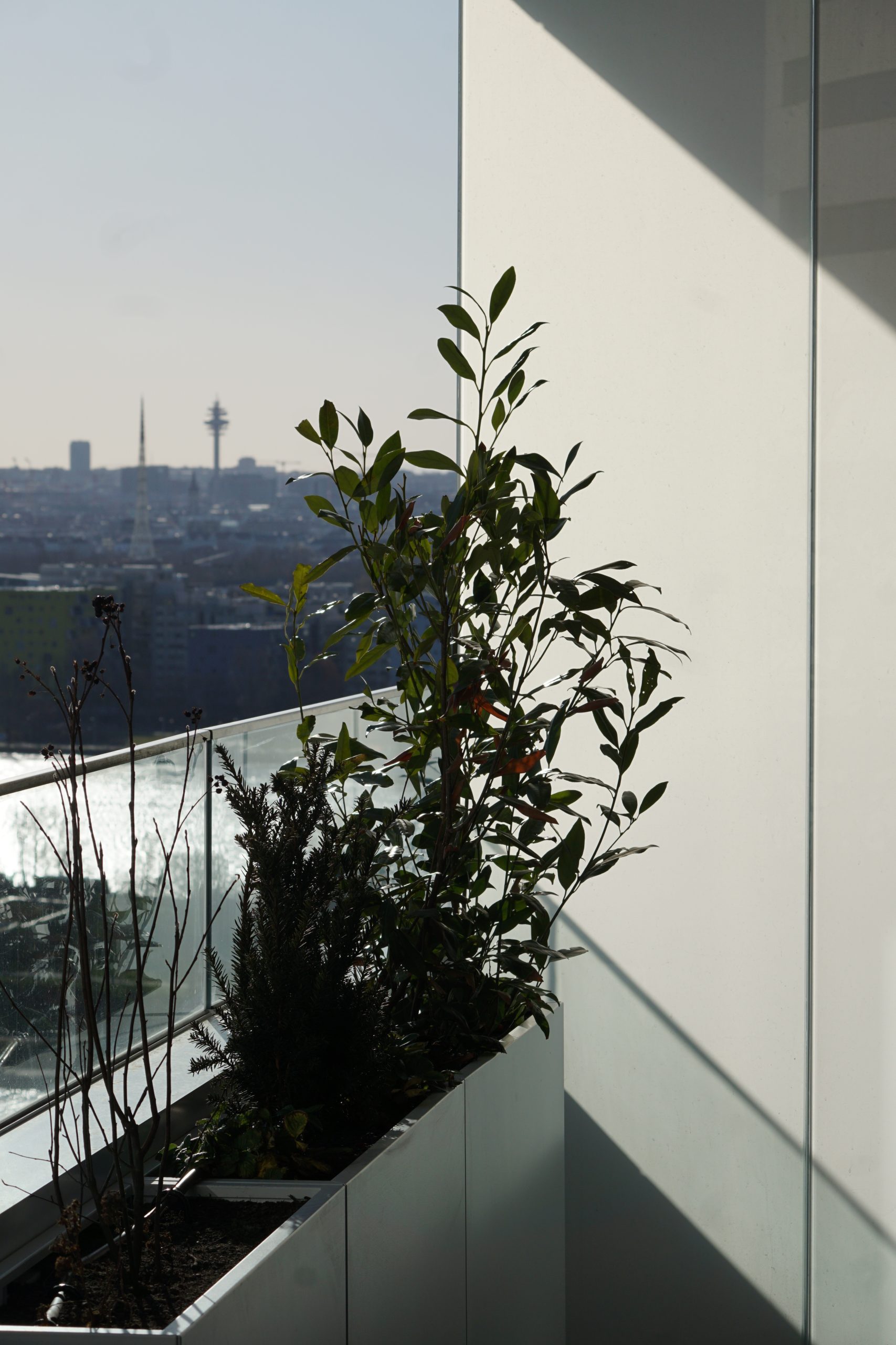 Luxurious bathroom with underfloor heating and kitchen with first-class appliances, floor-to-ceiling windows, electronic control of lighting, blinds, ventilation, heating and cooling, planted troughs with automatic irrigation system on the balcony.