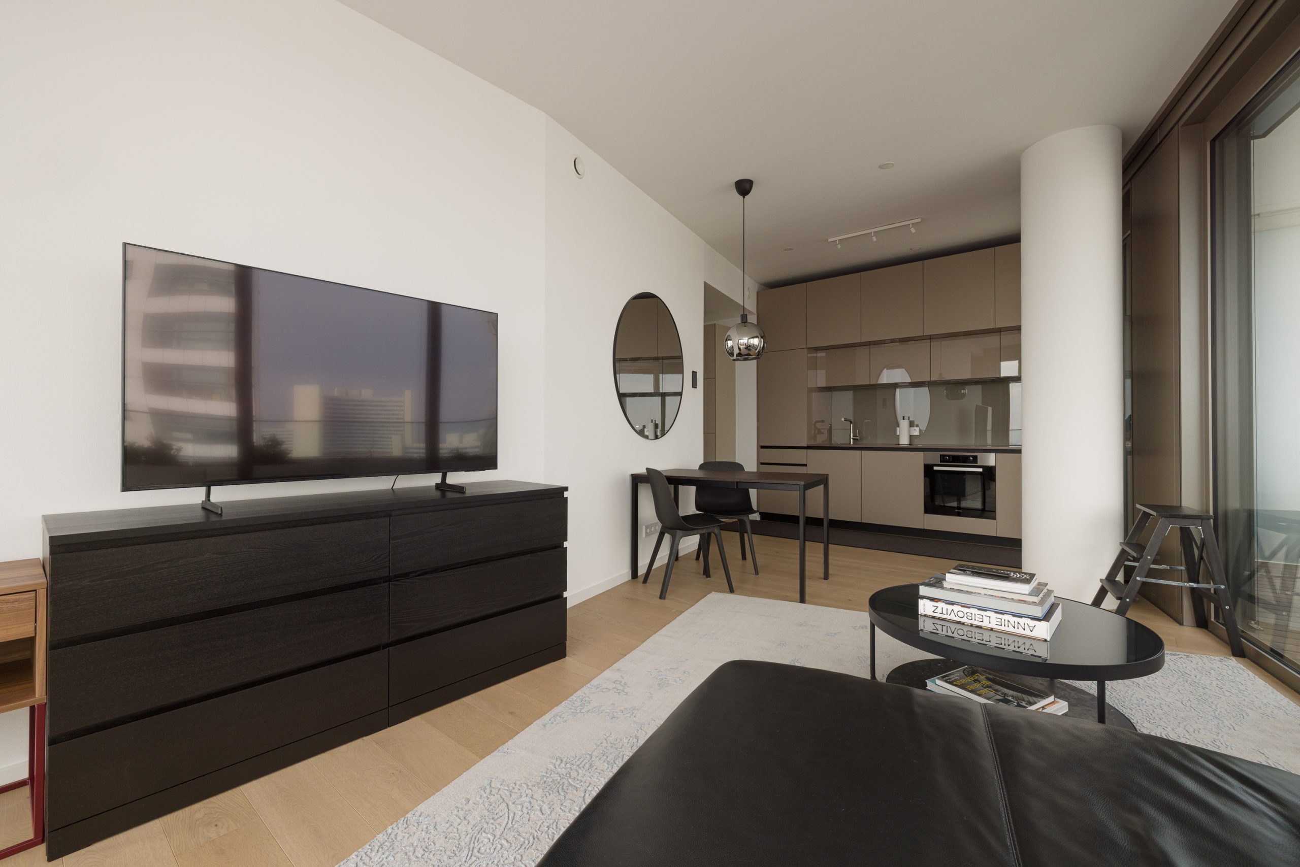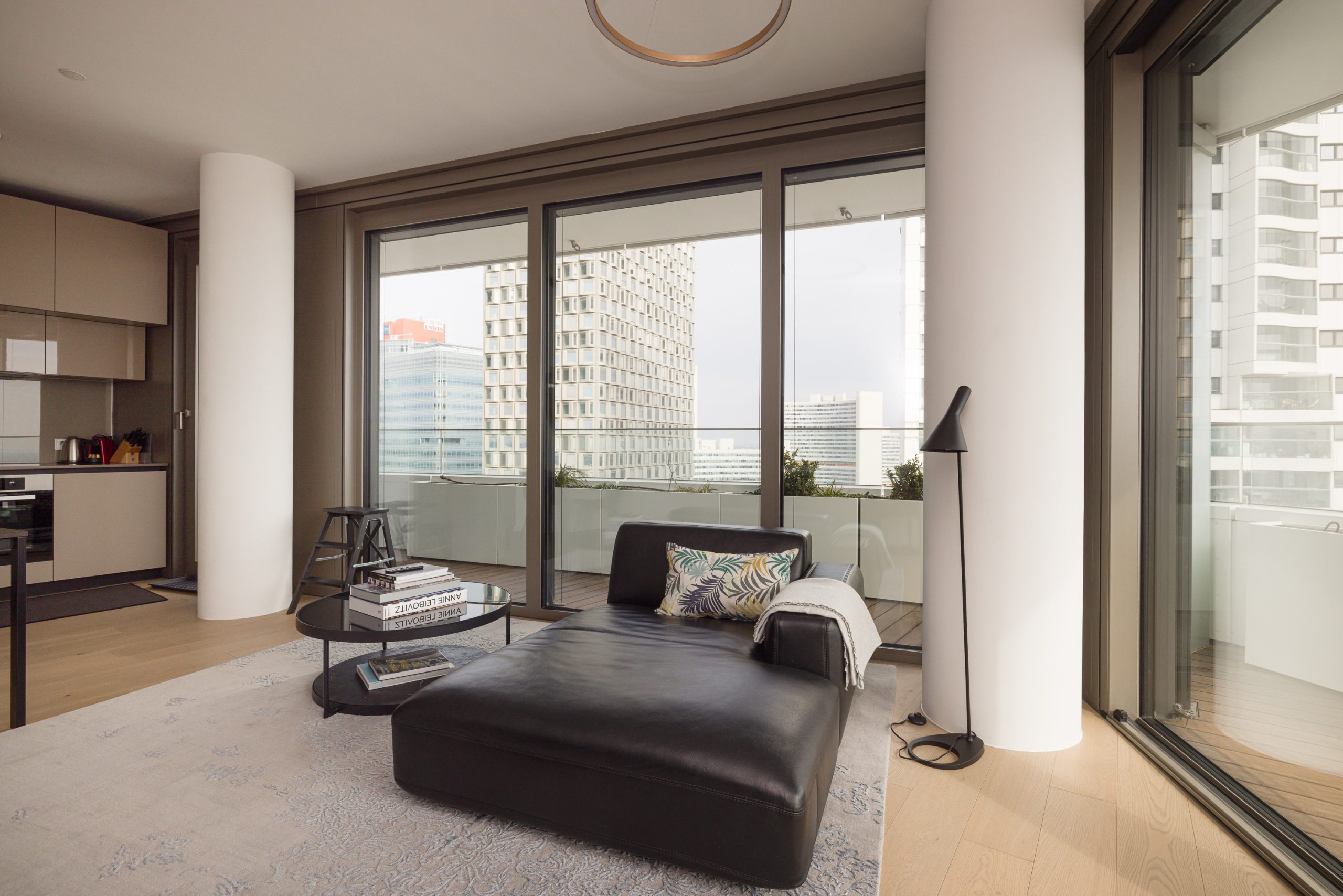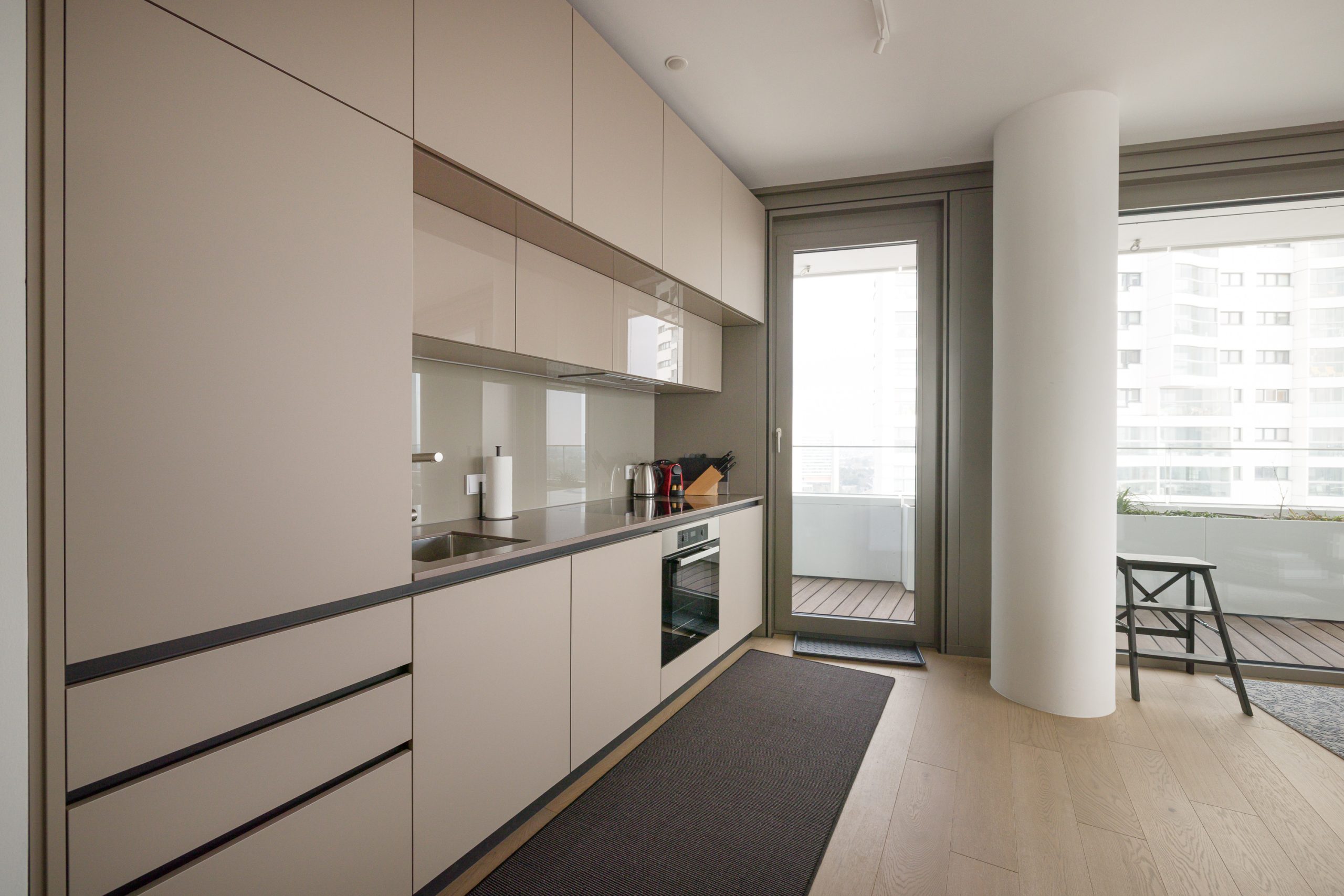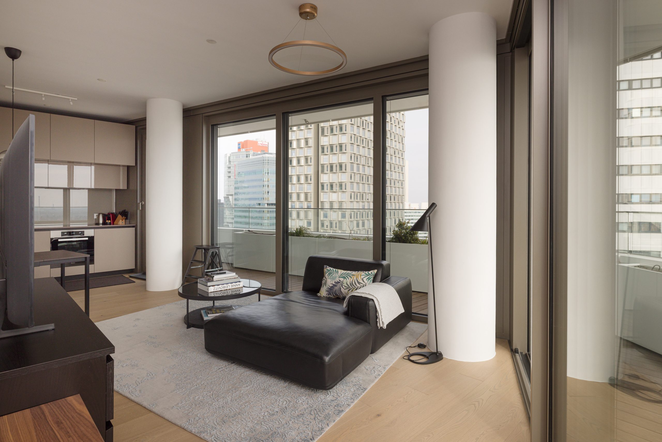 A cleverly integrated kitchenette tucked into the corner of the bright living area