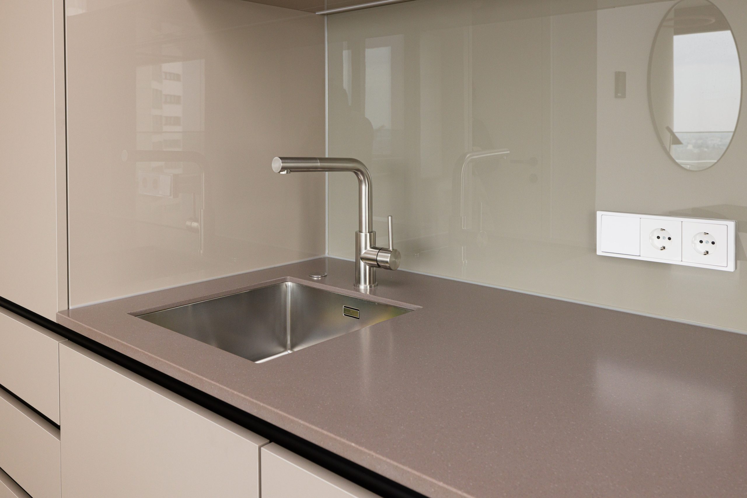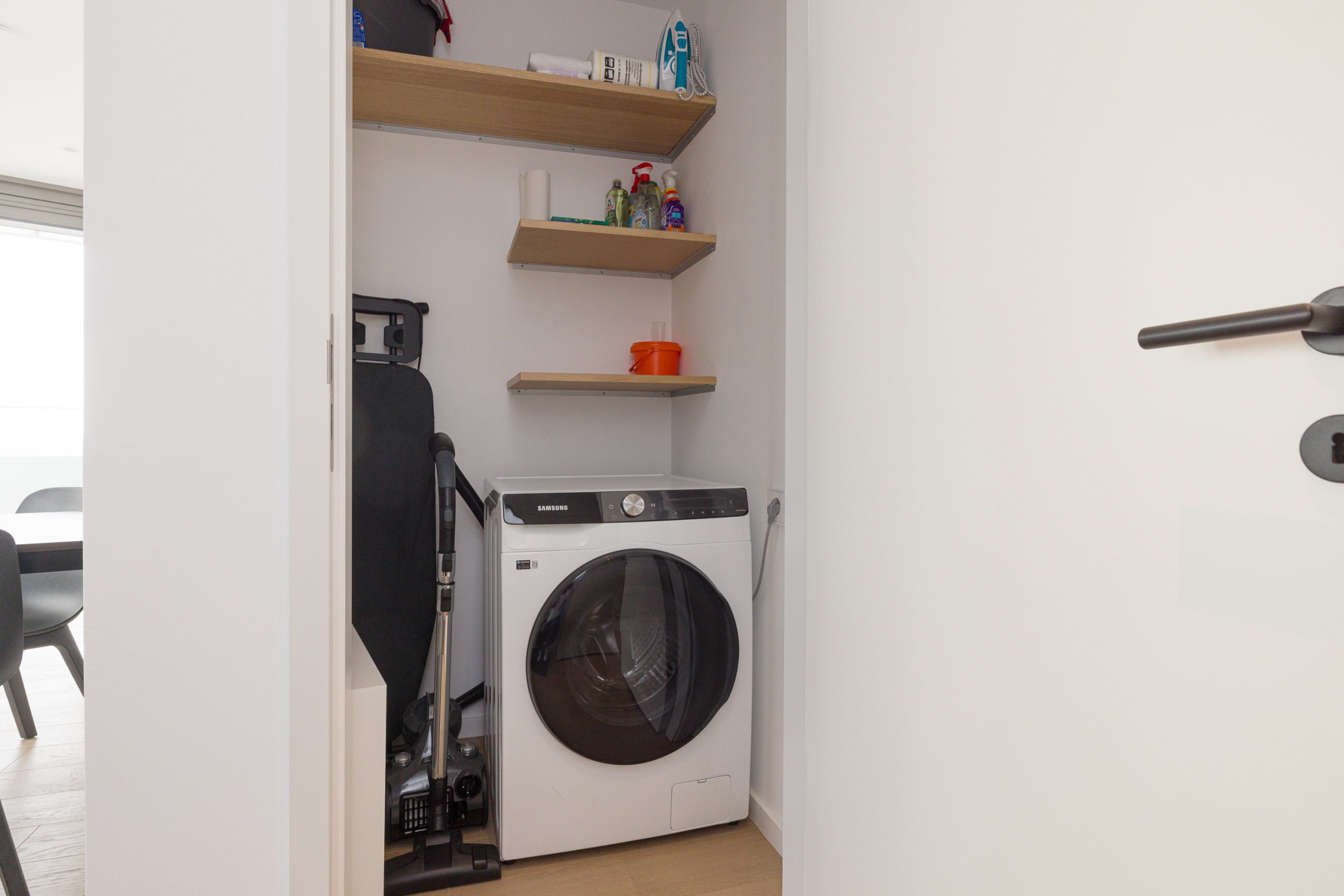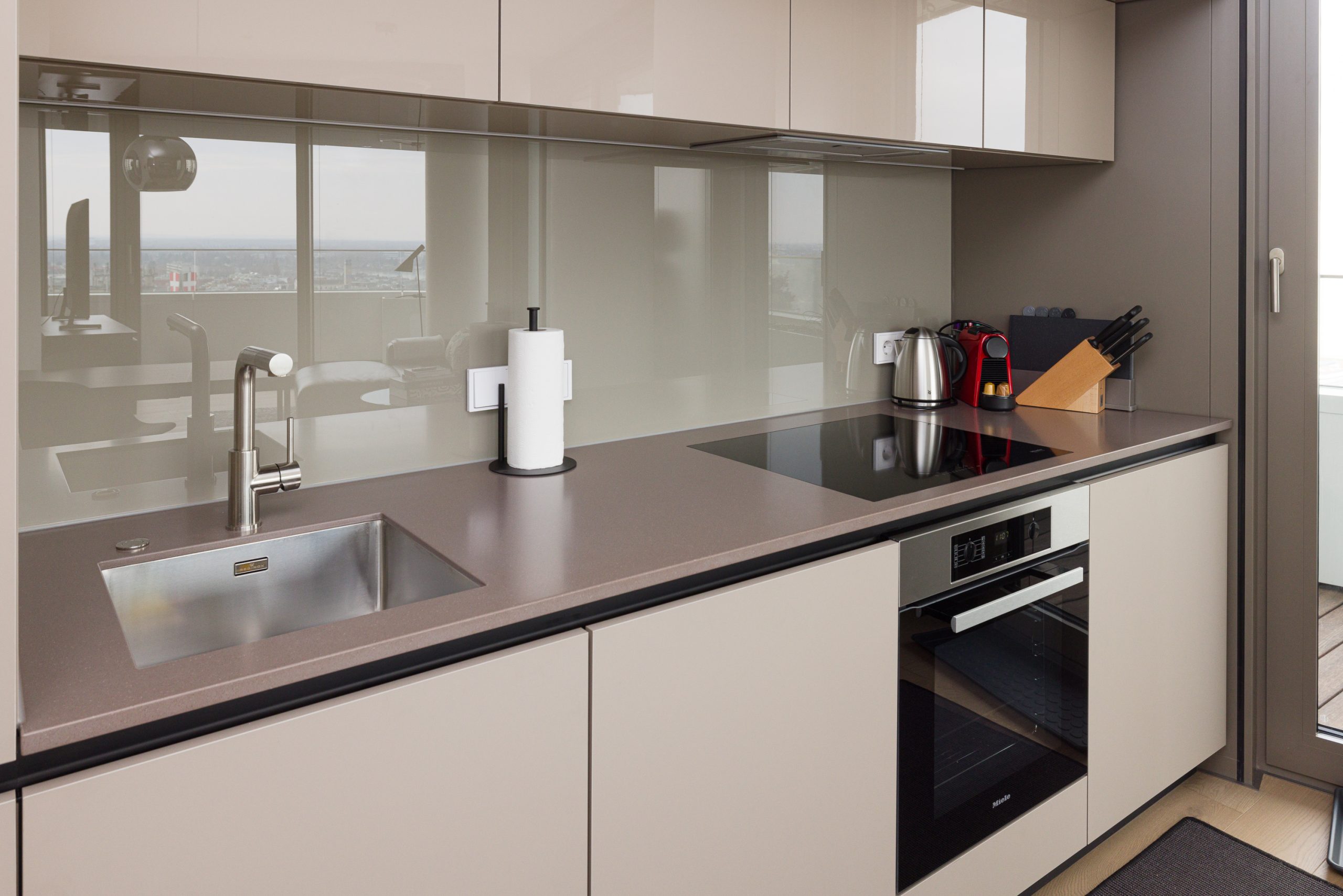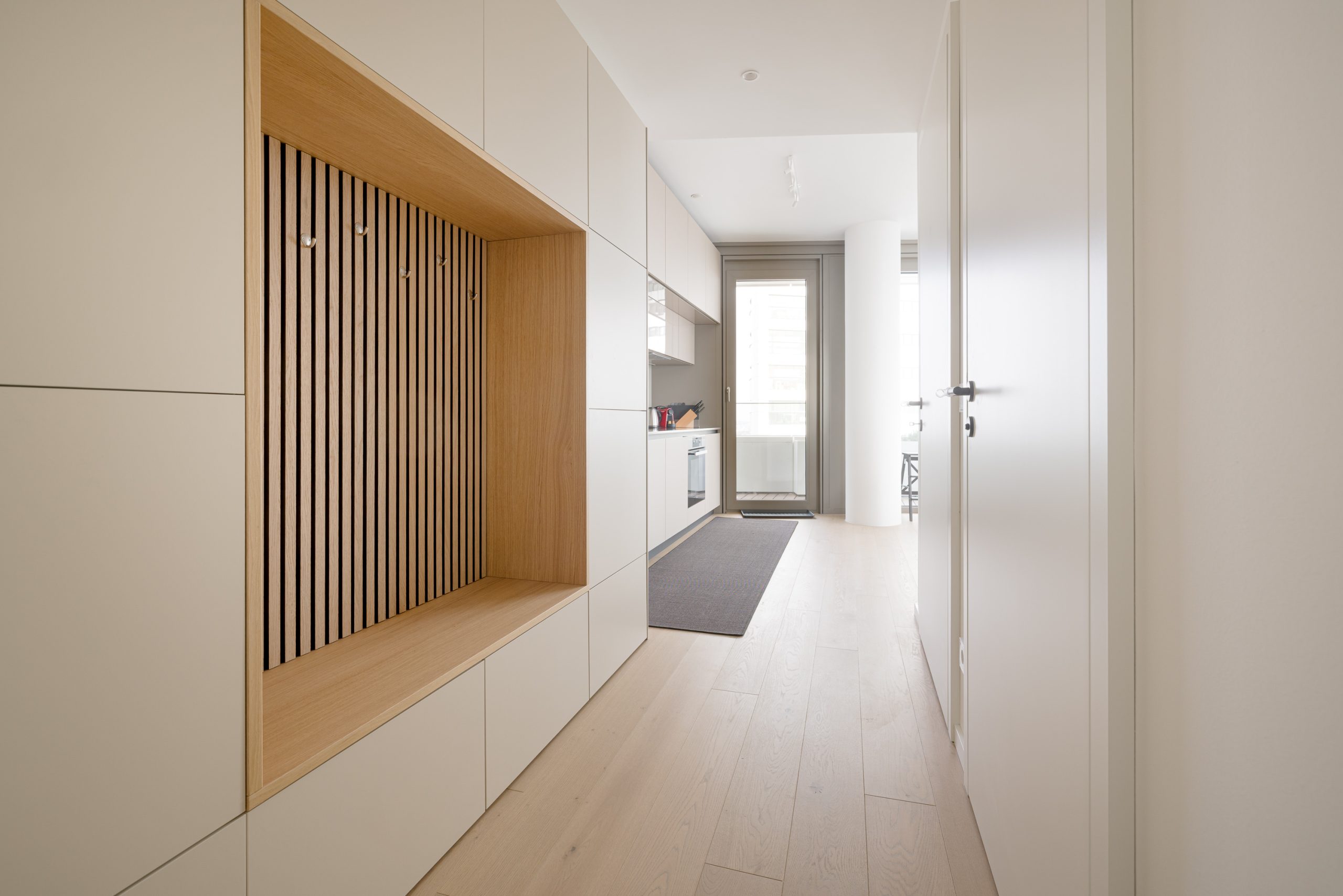 A cleverly integrated kitchenette tucked into the corner of the bright living area