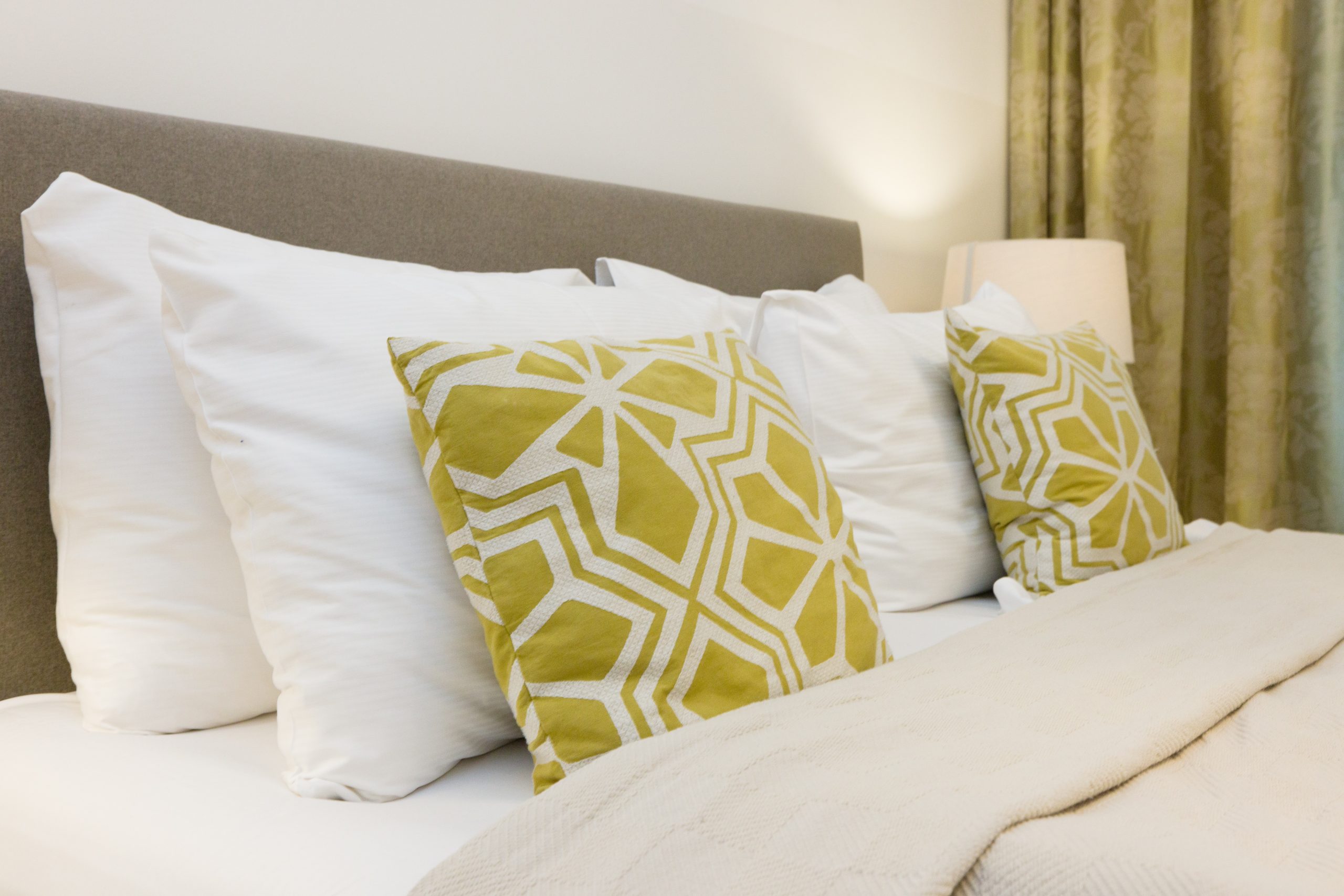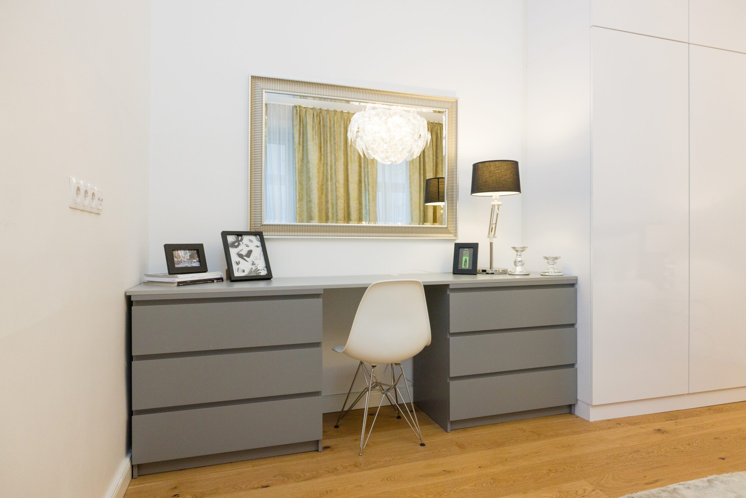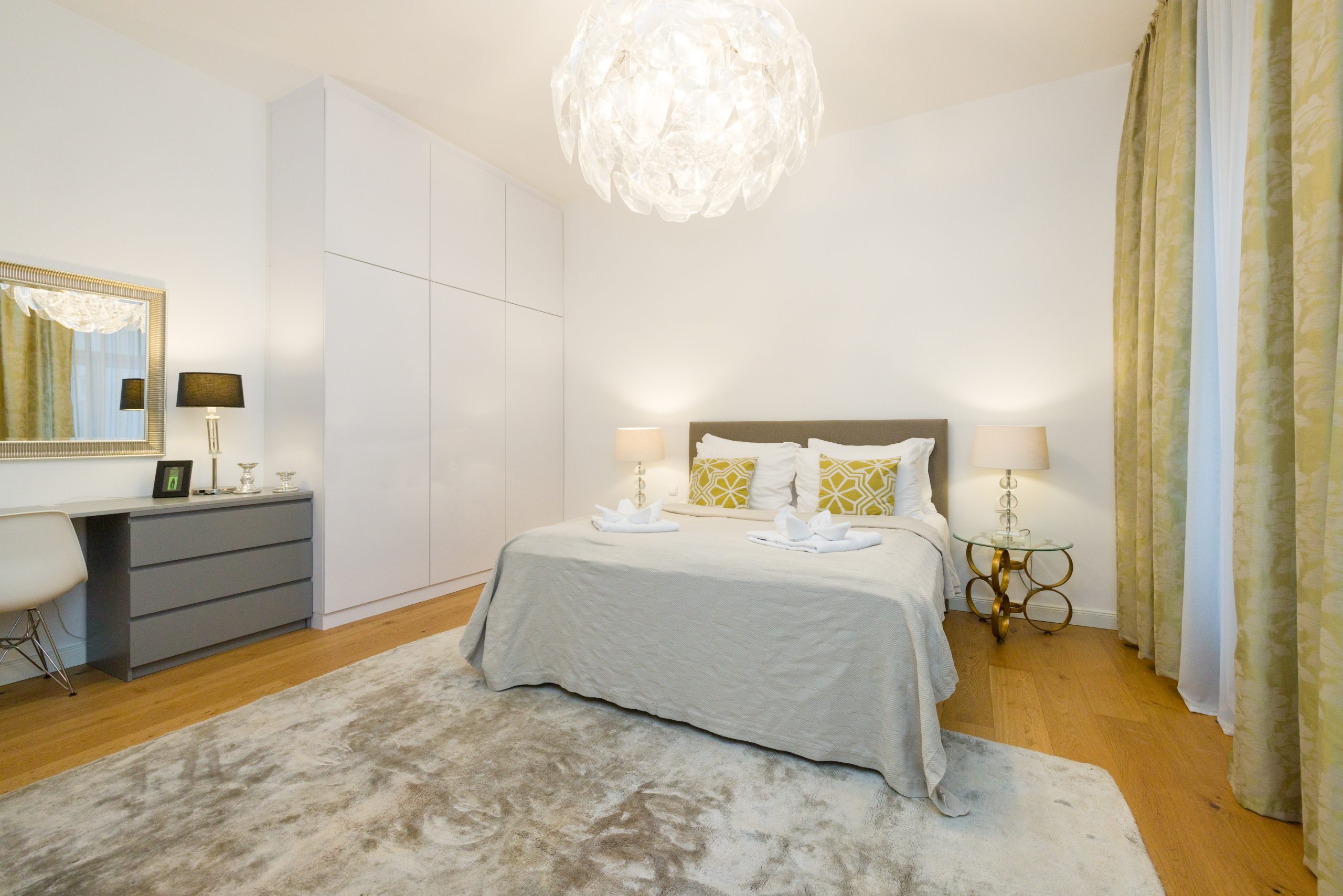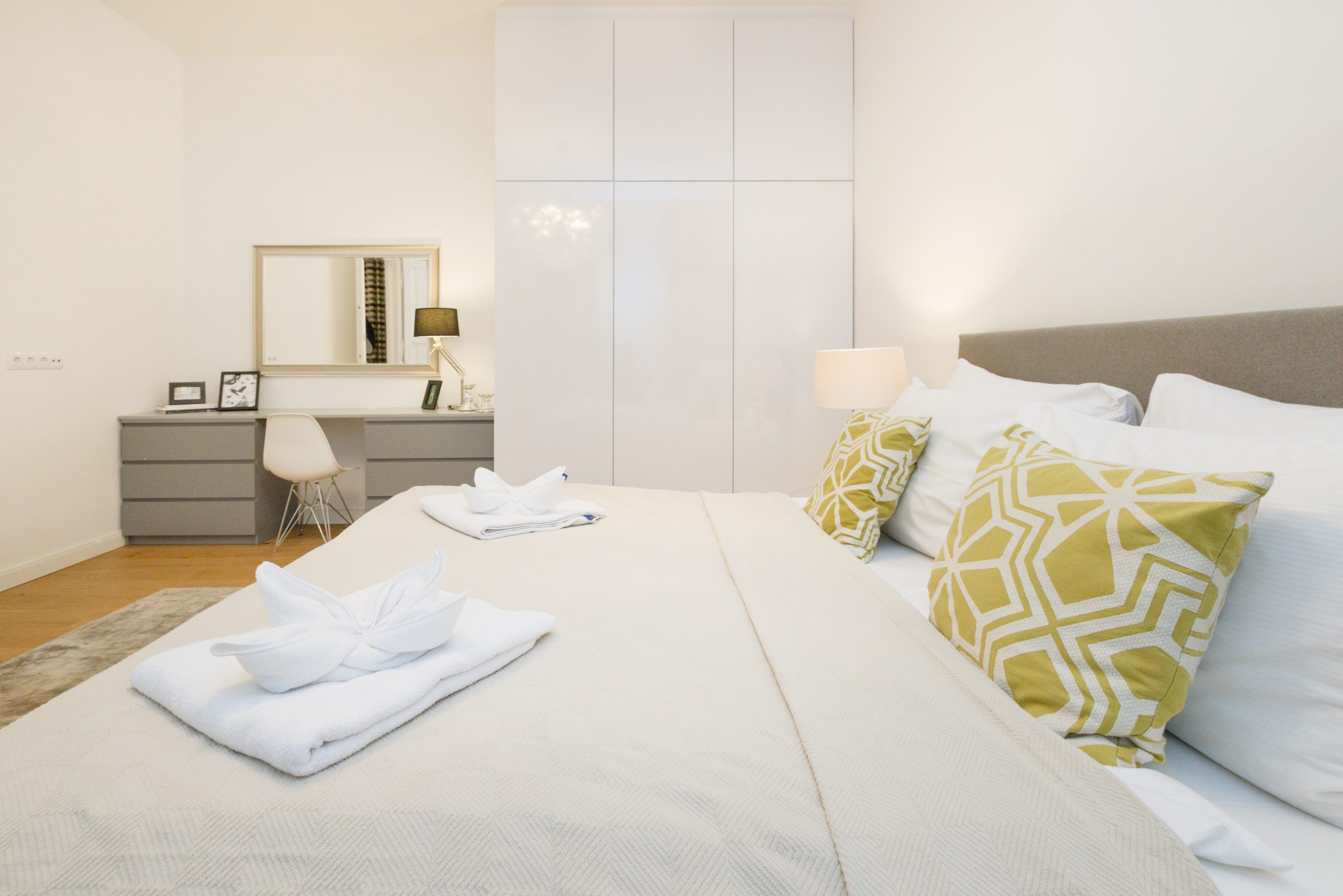 The bedroom is both stylish and generously sized, featuring a luxurious 5-star double bed for restful nights. A floor-to-ceiling built-in wardrobe provides ample storage, while a custom vanity with a grand mirror offers a dedicated space to get ready in comfort and style.
