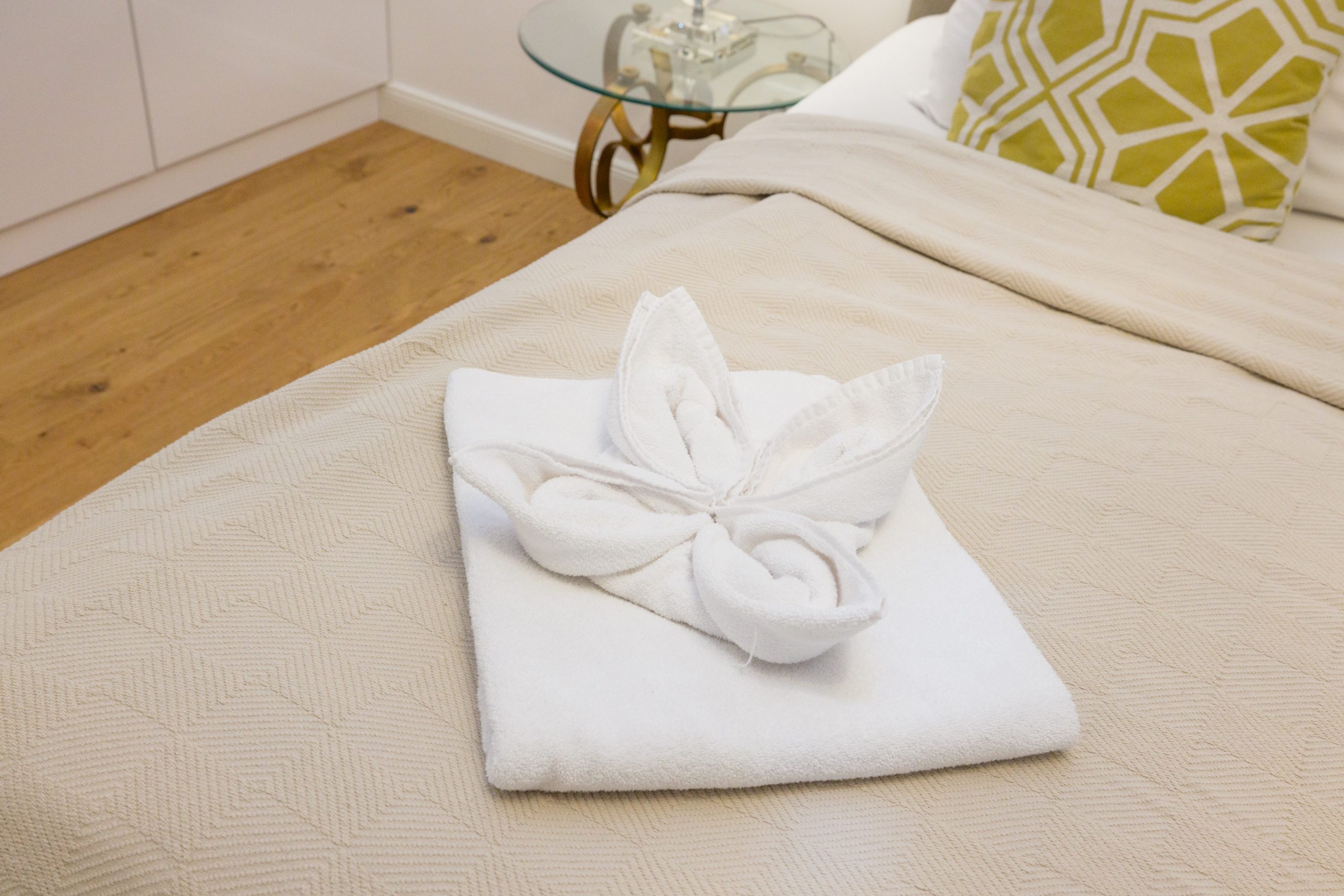 Easily accessible via elevator, the apartment opens into a spacious living area where a fully equipped kitchen awaits—complete with a fridge/freezer, coffee machine, kettle, toaster, and all essential kitchenware. The open-plan layout flows into a cozy lounge space, furnished with a large, plush sofa, an armchair, and a flat-screen TV—perfect for relaxing after a busy day. A round dining table and silver-toned decor add a touch of modern elegance.