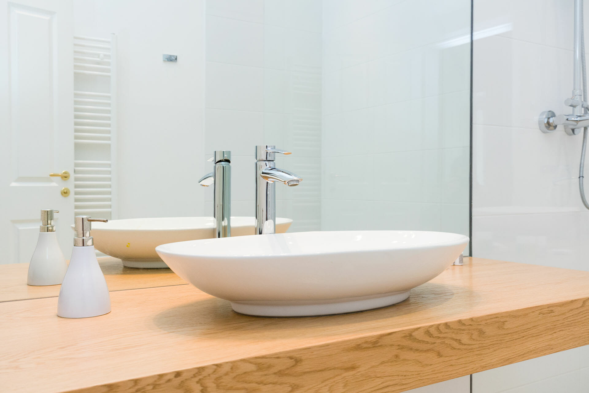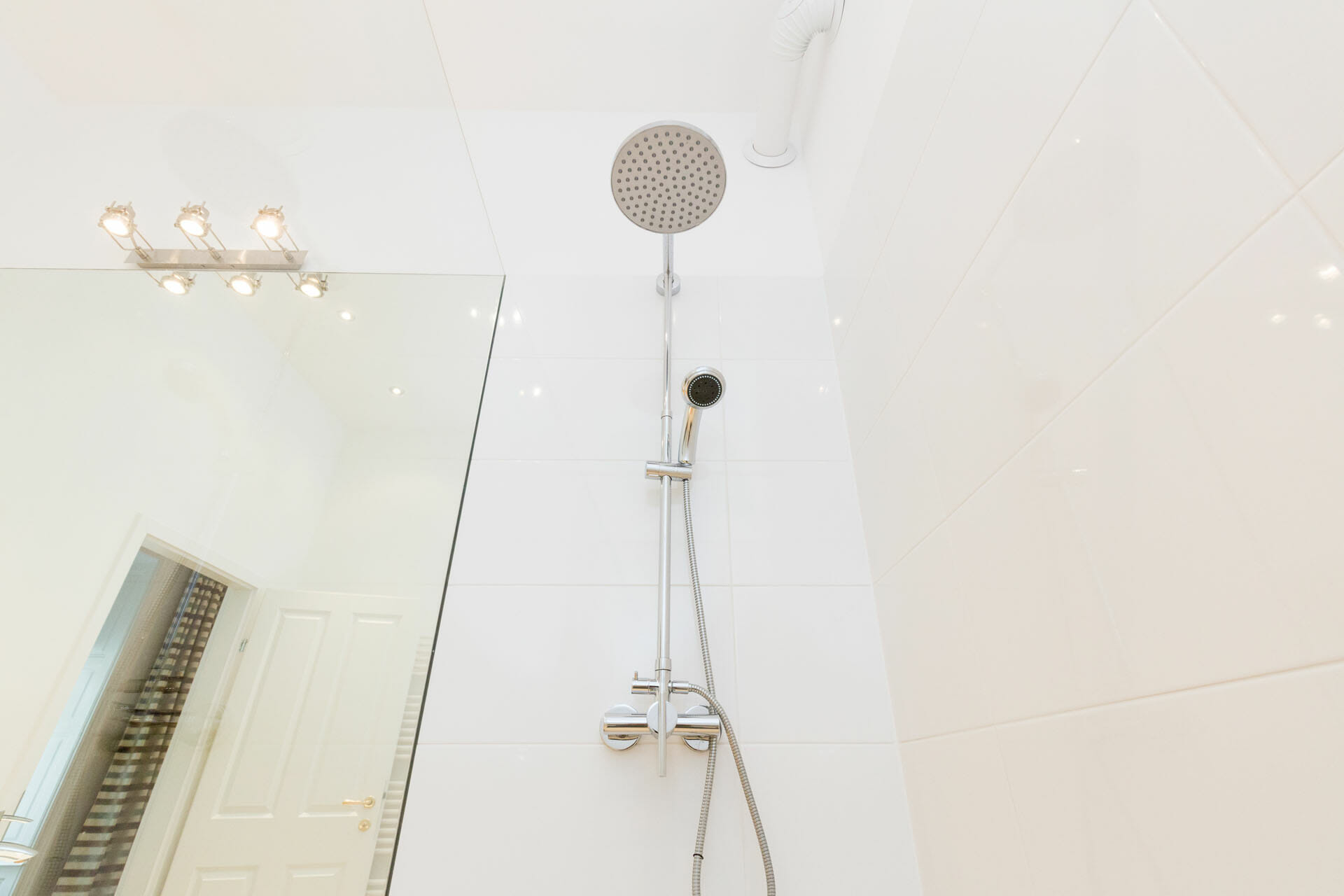 The sleek bathroom features a rain shower, wooden accents, and calming design elements, complemented by a separate toilet for added convenience.