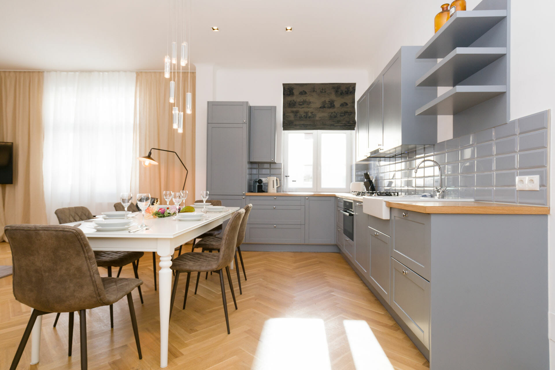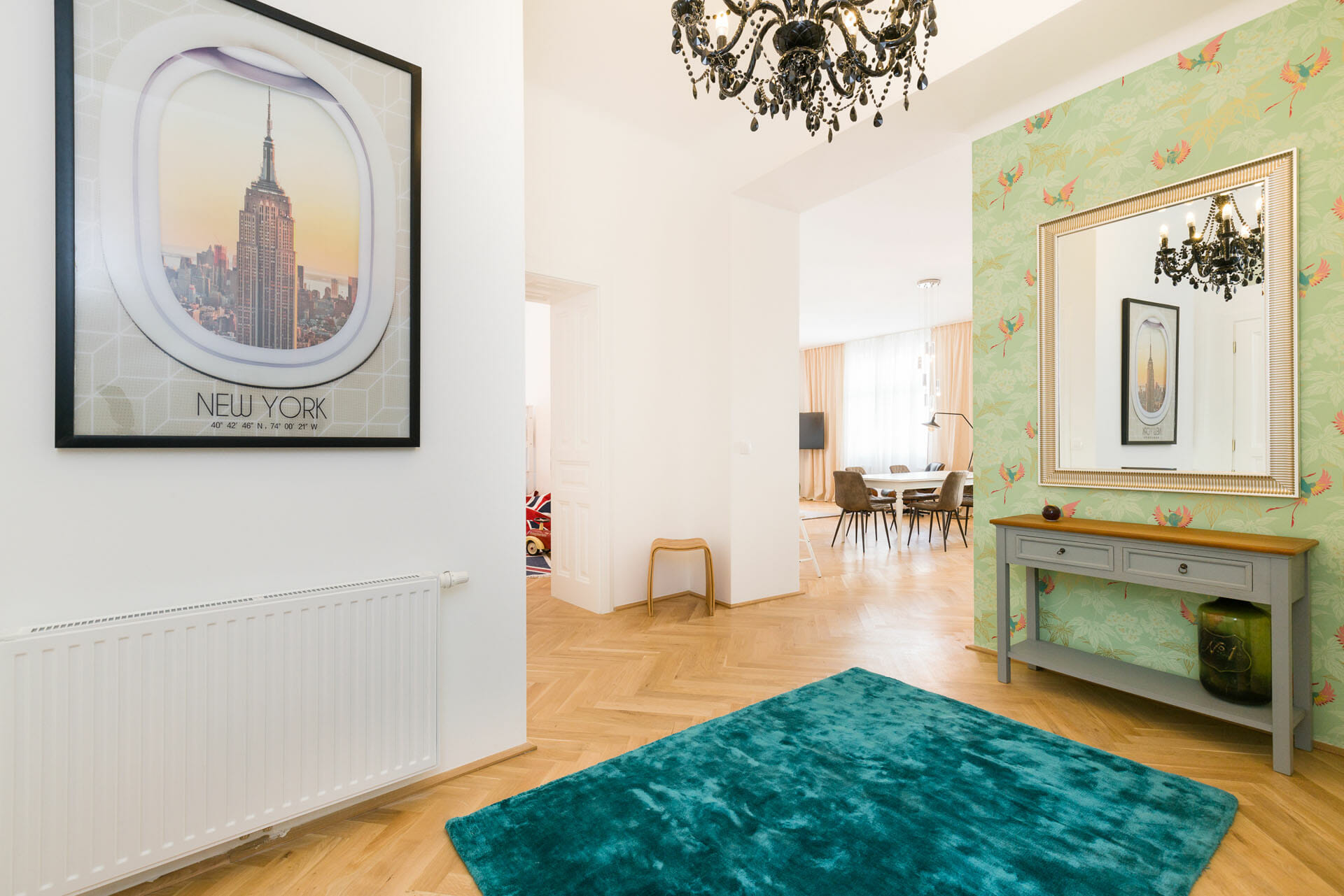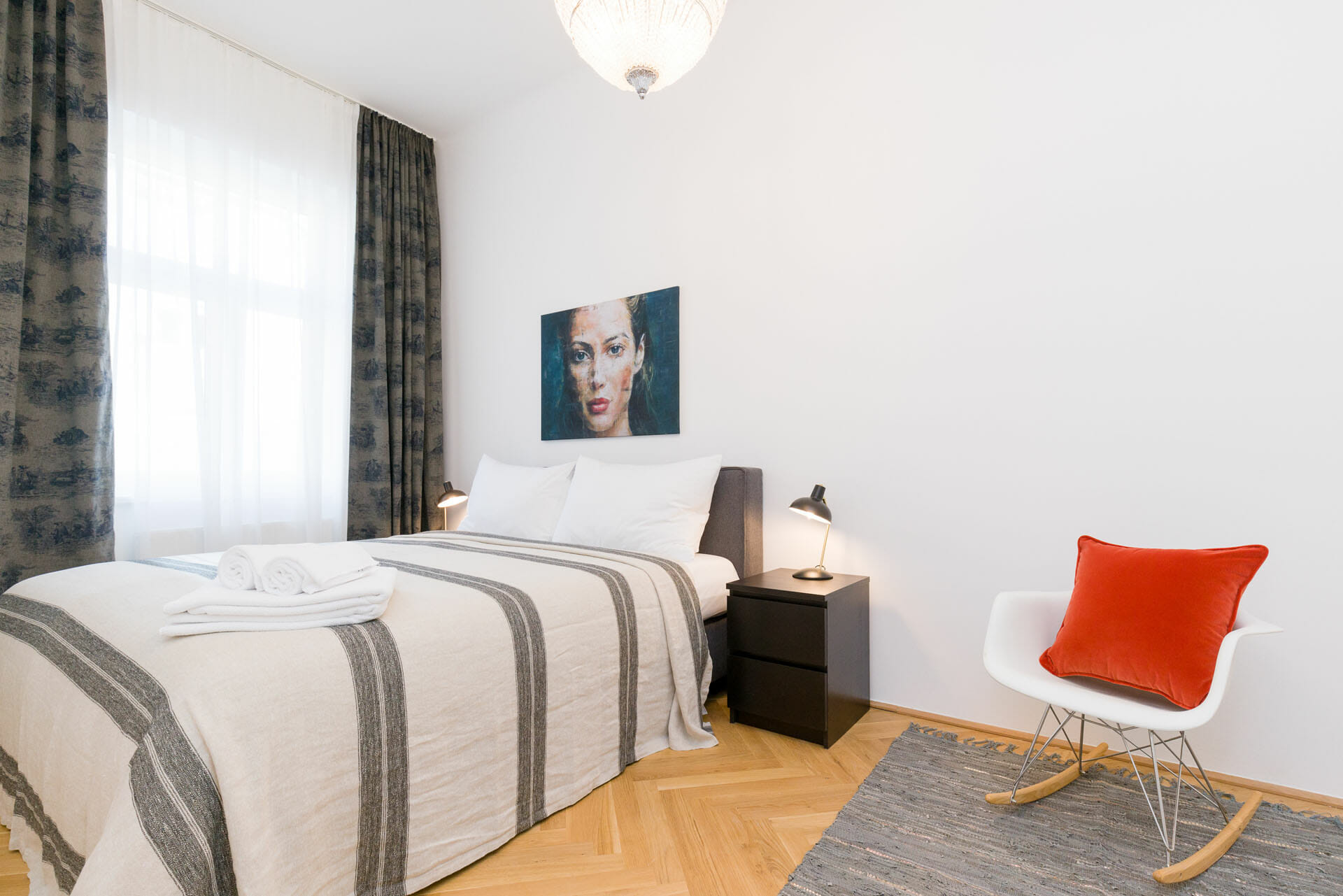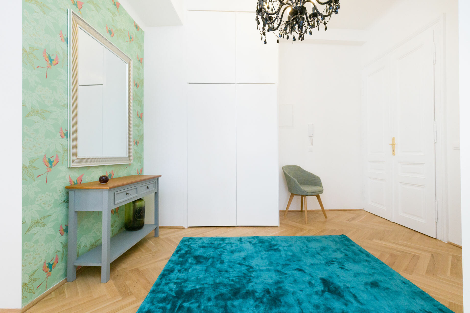 This wonderful two bedroom apartment has been newly renovated to a very high standard. Exclusive furniture has been selected by our interior designer which gives every apartment its special touch. The kitchen is custom made and offers amples space for all cooking items. Even though the apartment is located in a traditional Viennese Altbau, it is equipped with air conditioning.