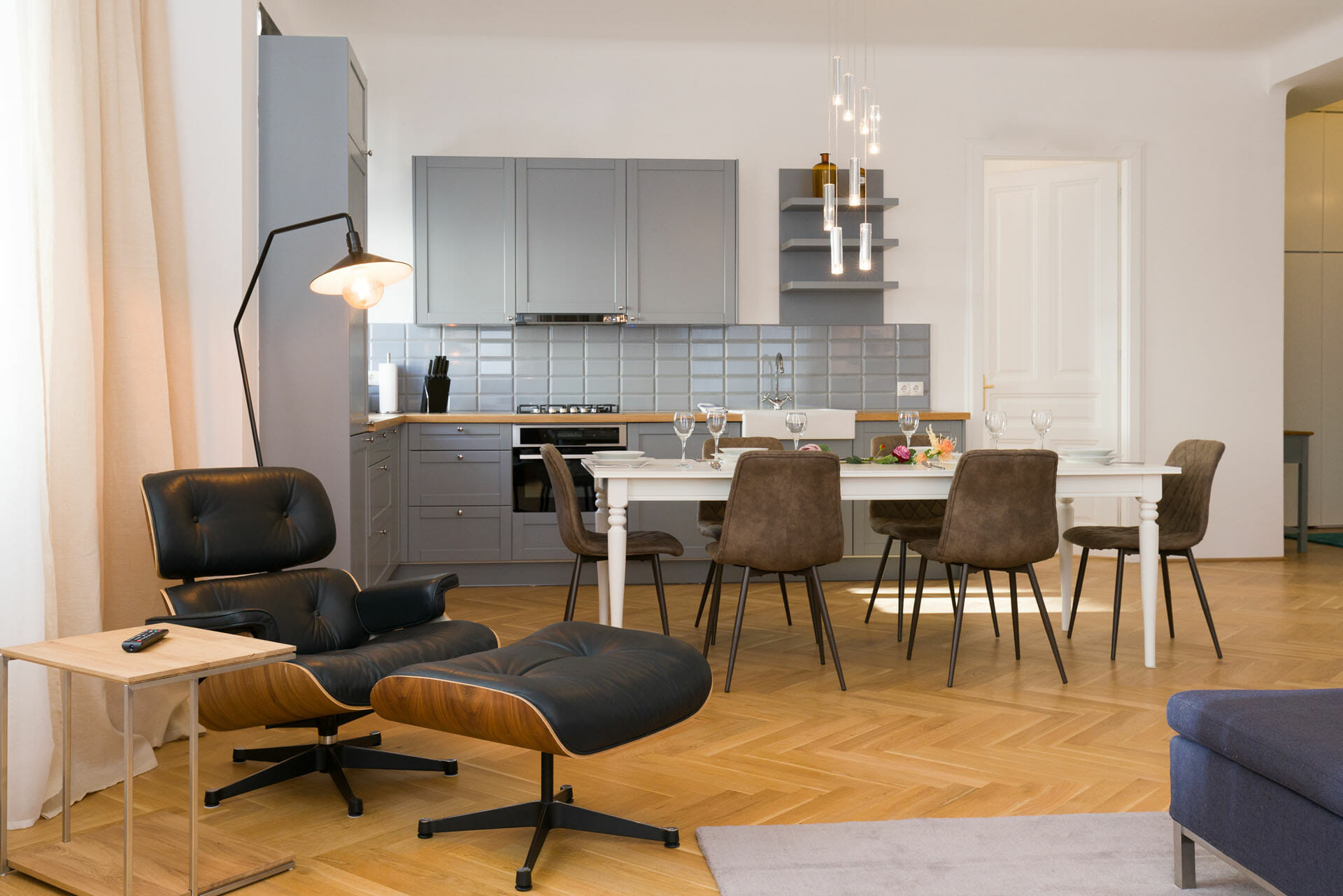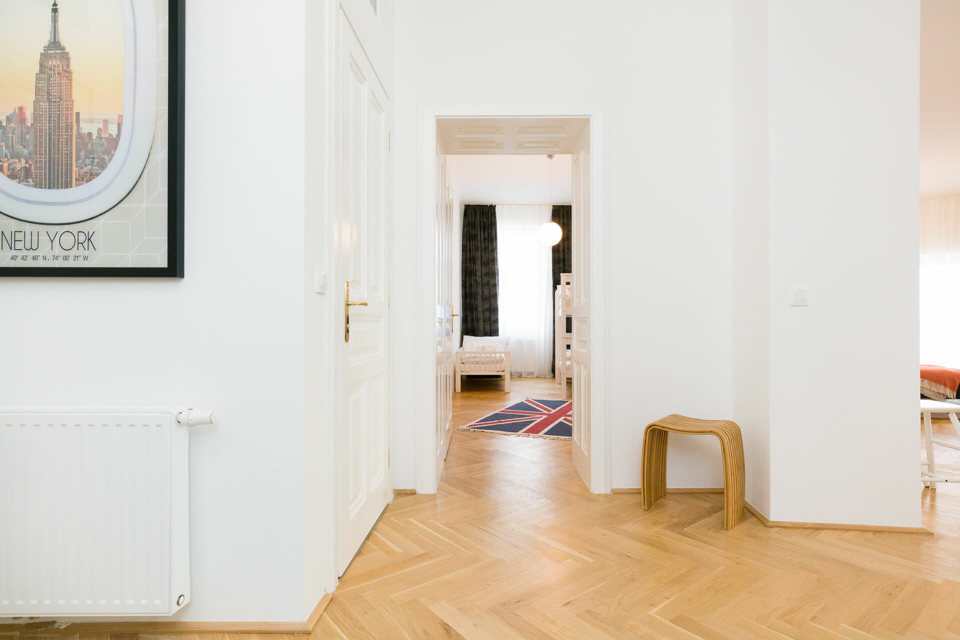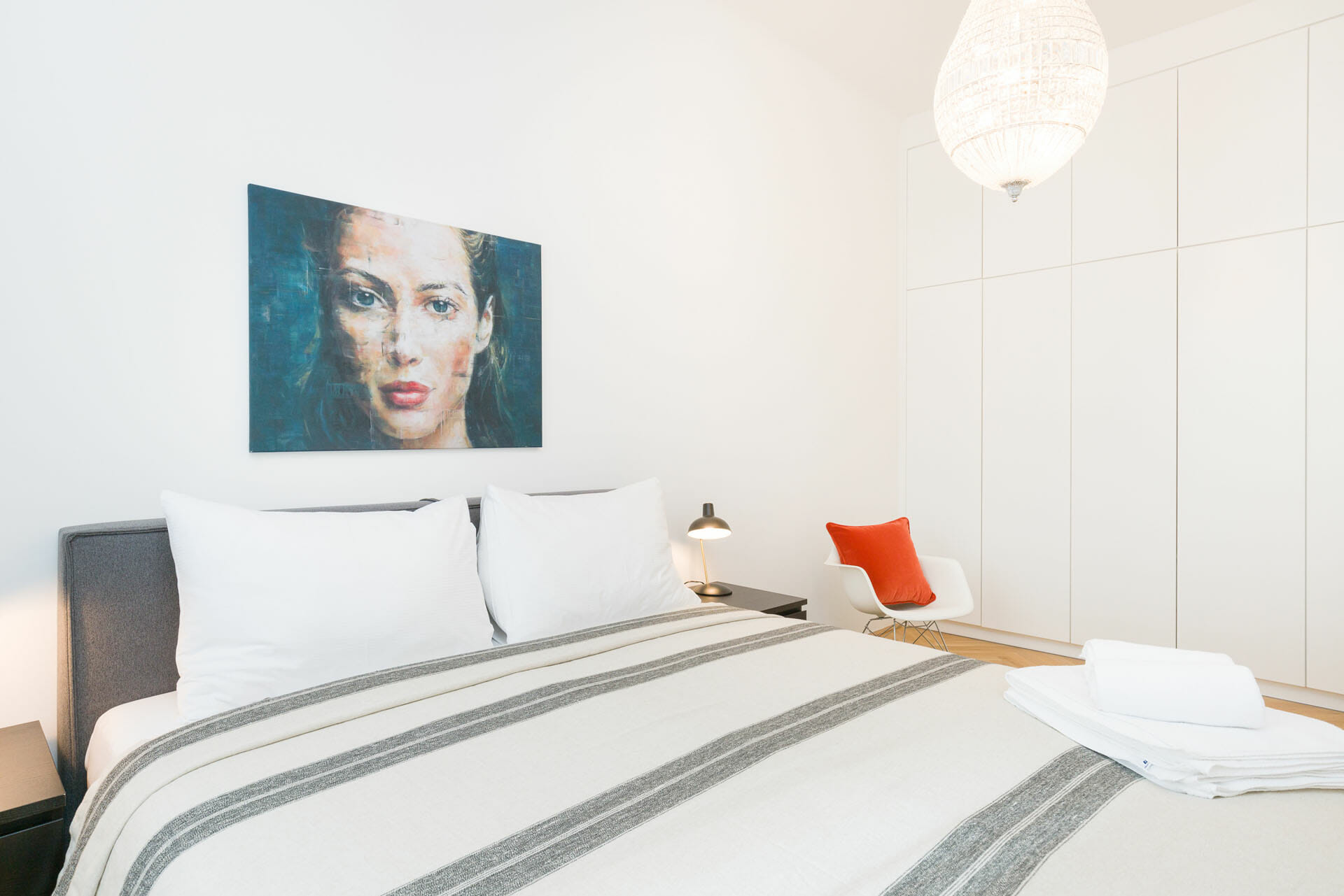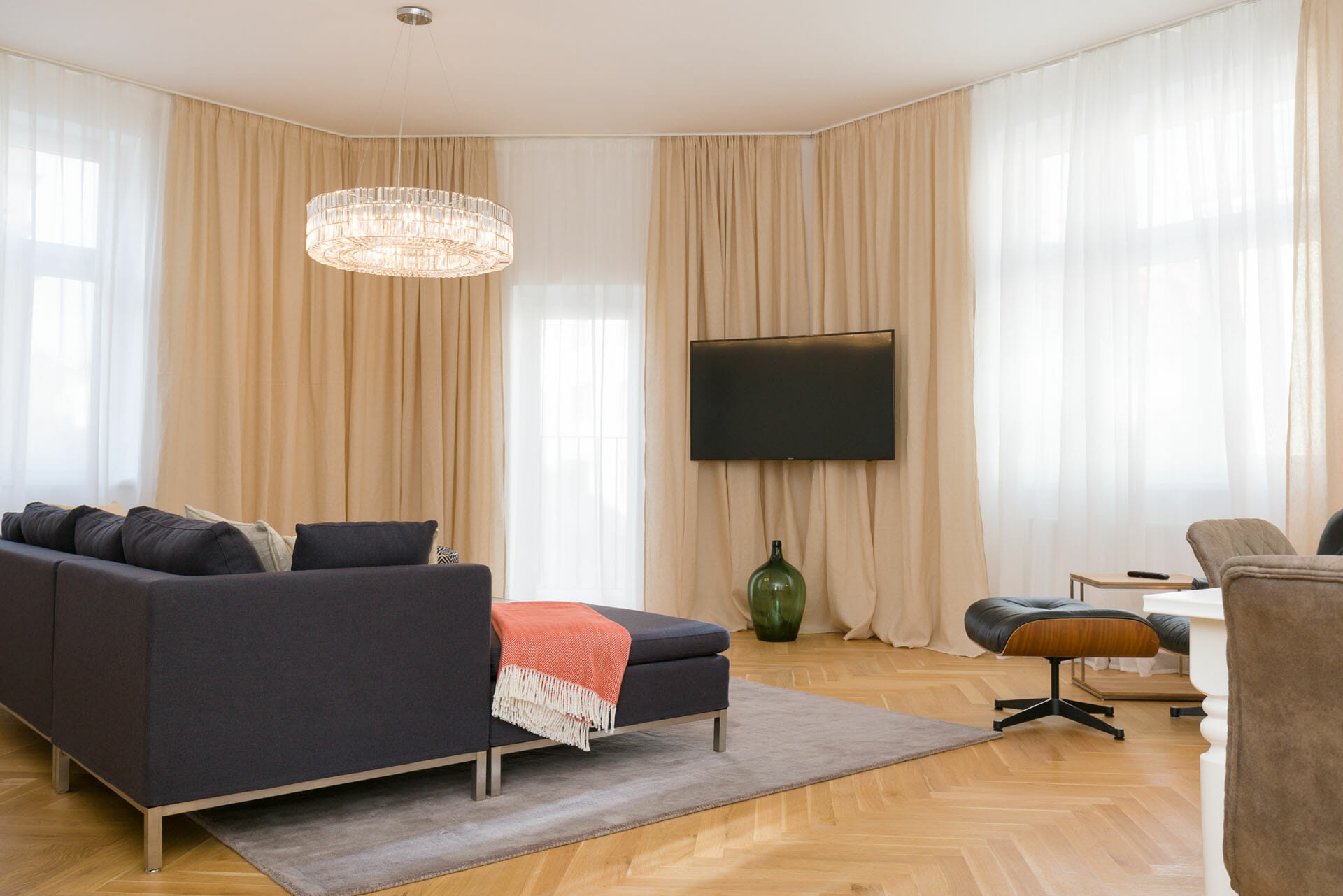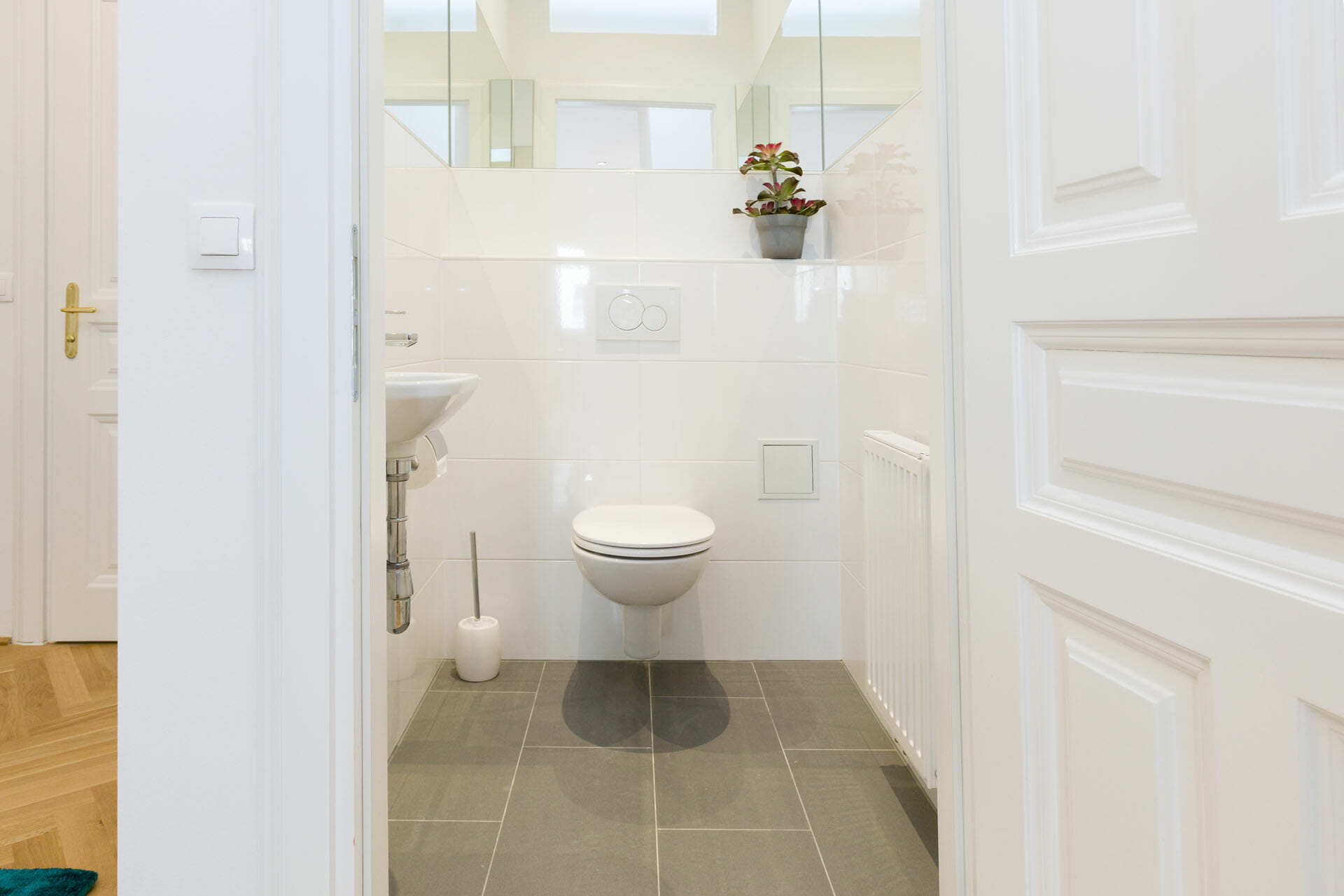 This wonderful two bedroom apartment has been newly renovated to a very high standard. Exclusive furniture has been selected by our interior designer which gives every apartment its special touch. The kitchen is custom made and offers amples space for all cooking items. Even though the apartment is located in a traditional Viennese Altbau, it is equipped with air conditioning.