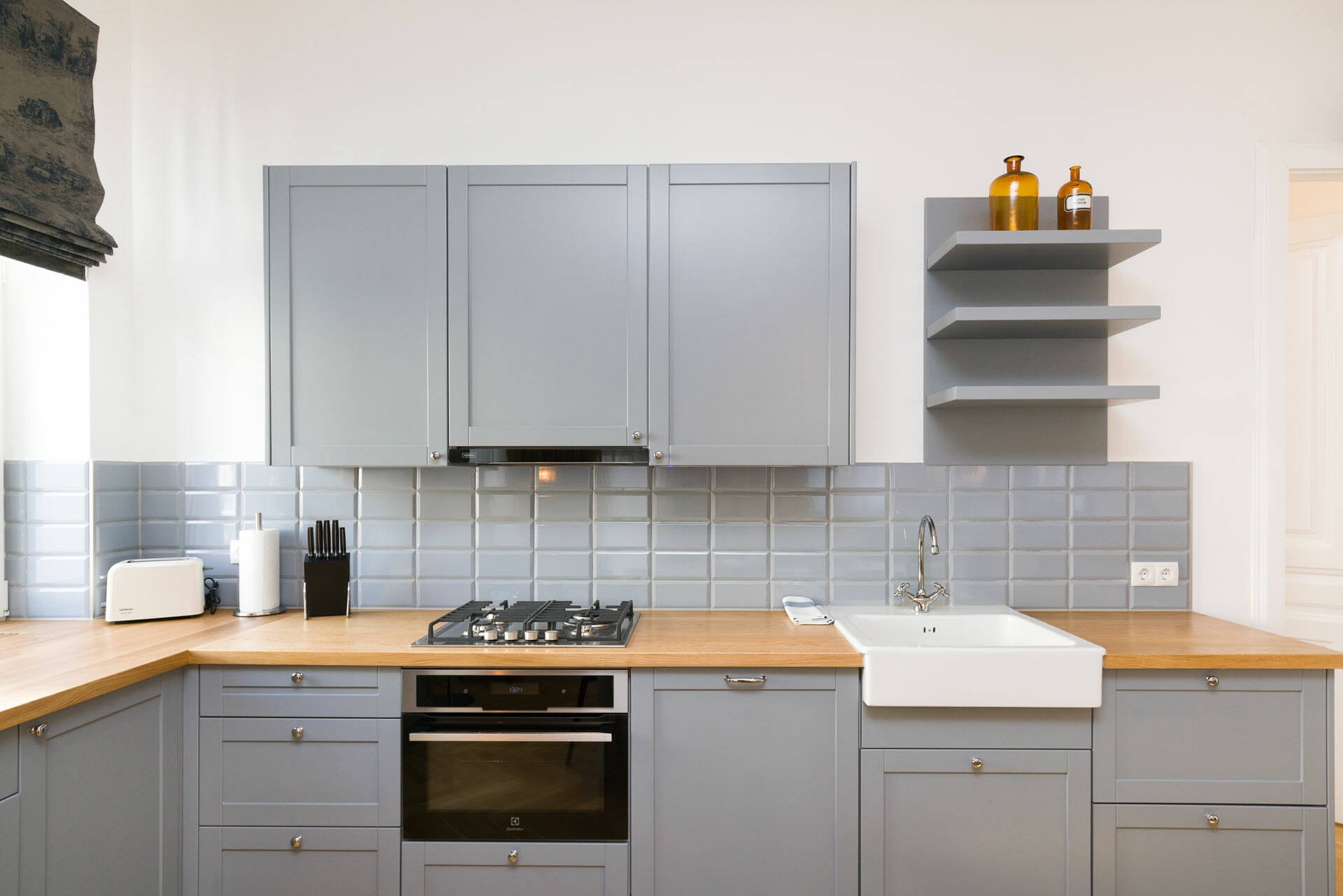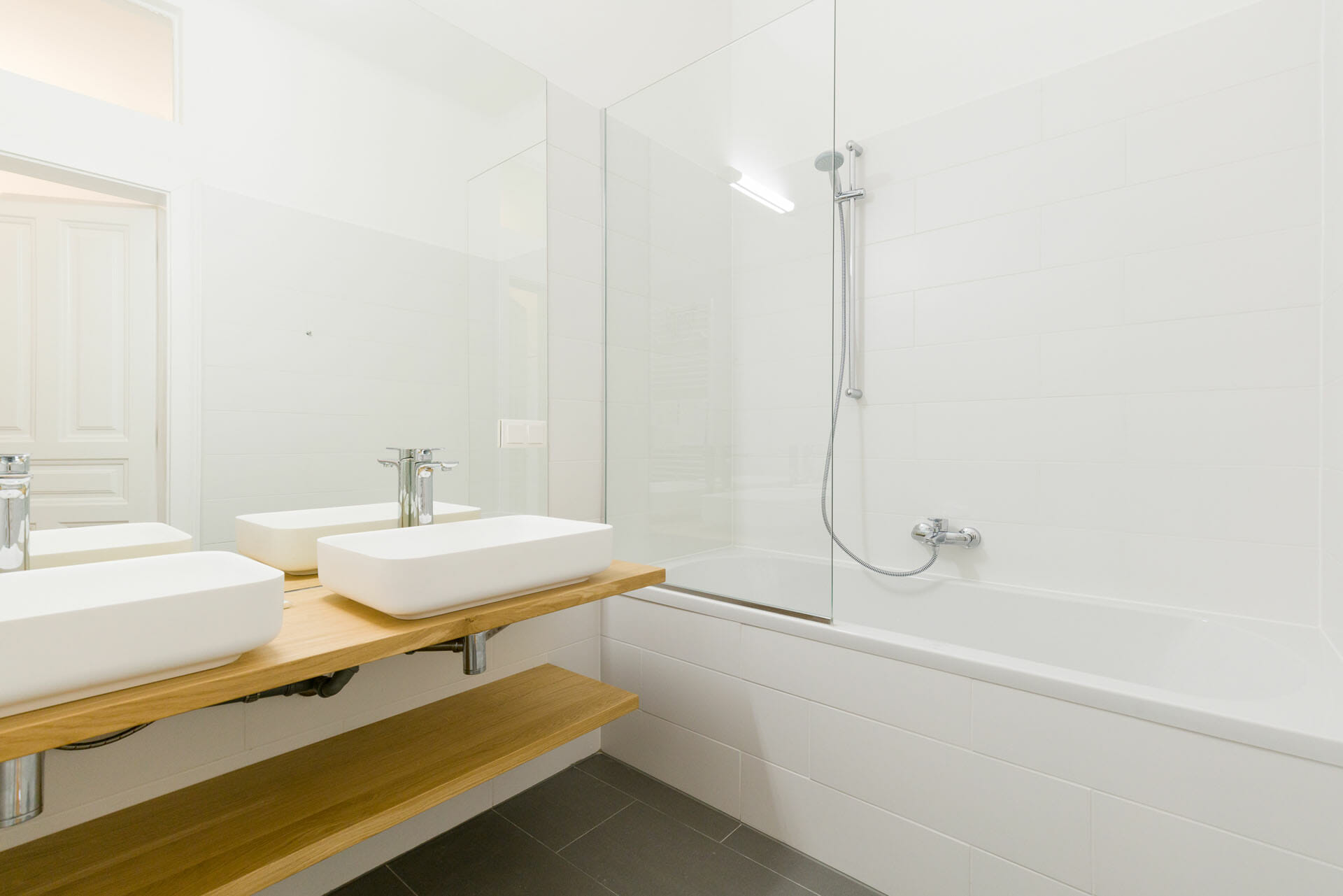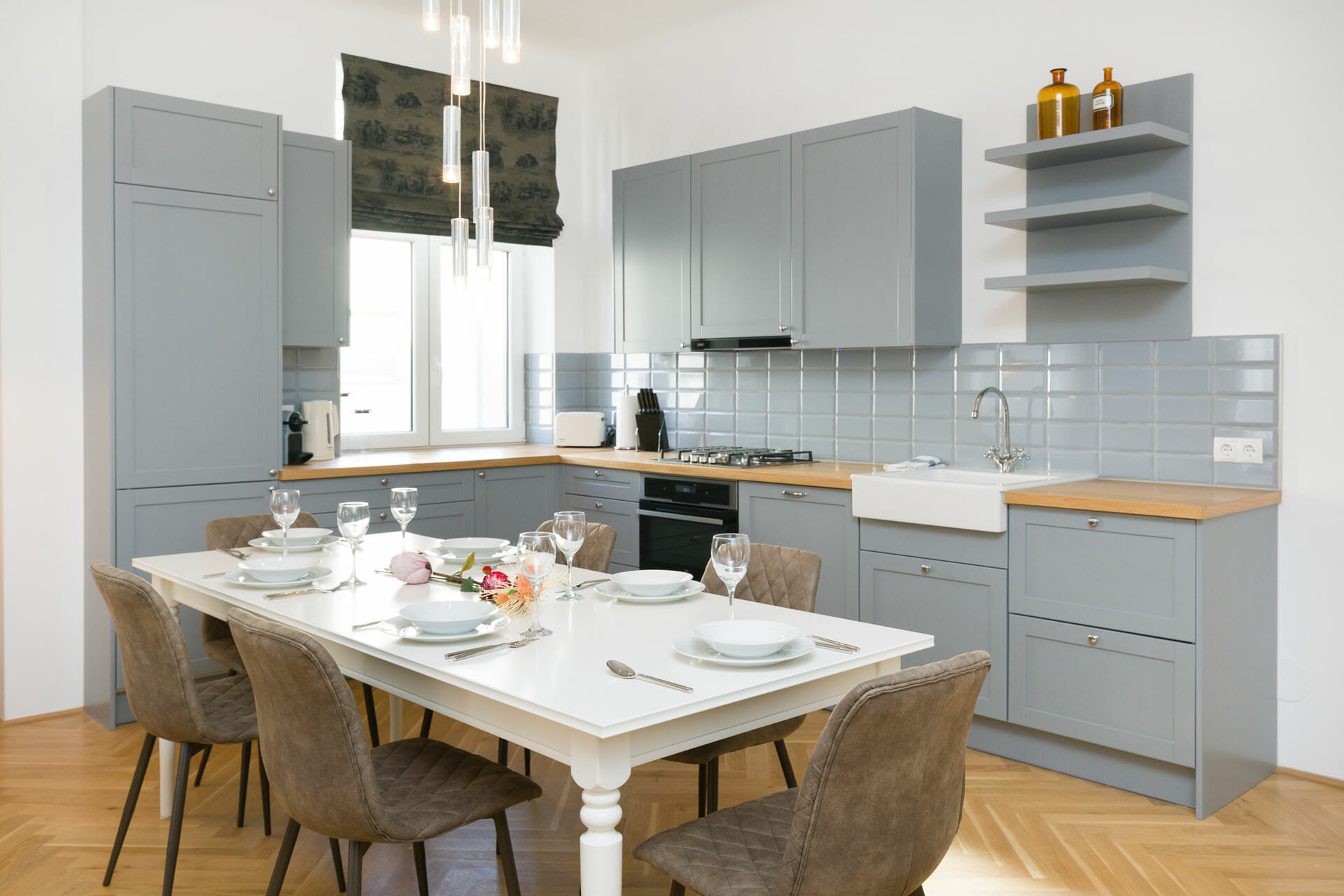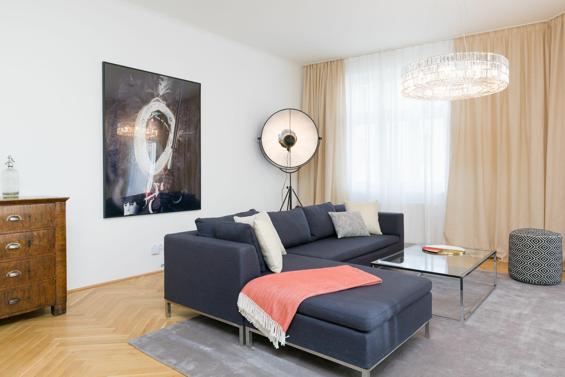 This wonderful two bedroom apartment has been newly renovated to a very high standard. Exclusive furniture has been selected by our interior designer which gives every apartment its special touch. The kitchen is custom made and offers amples space for all cooking items. Even though the apartment is located in a traditional Viennese Altbau, it is equipped with air conditioning.