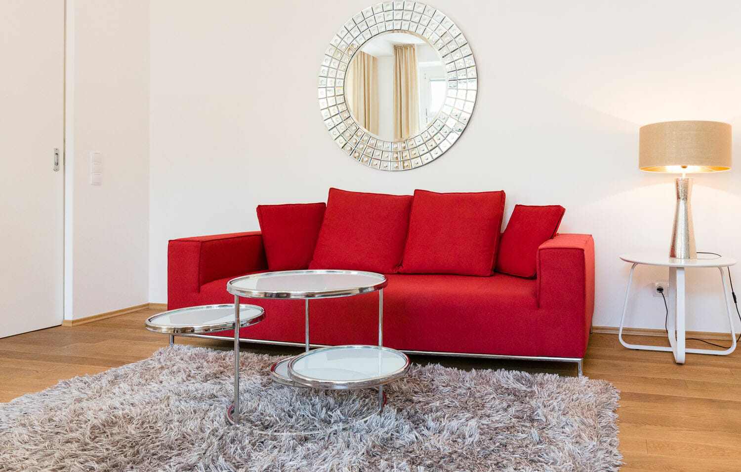 The living area features a large wooden table, ideal for dining, entertaining, or working from home. A striking red sofa acts as a stunning visual centerpiece, adding a vibrant touch to the muted color scheme. A smart TV is mounted above a sleek wall shelf, perfect for cozy evenings in.