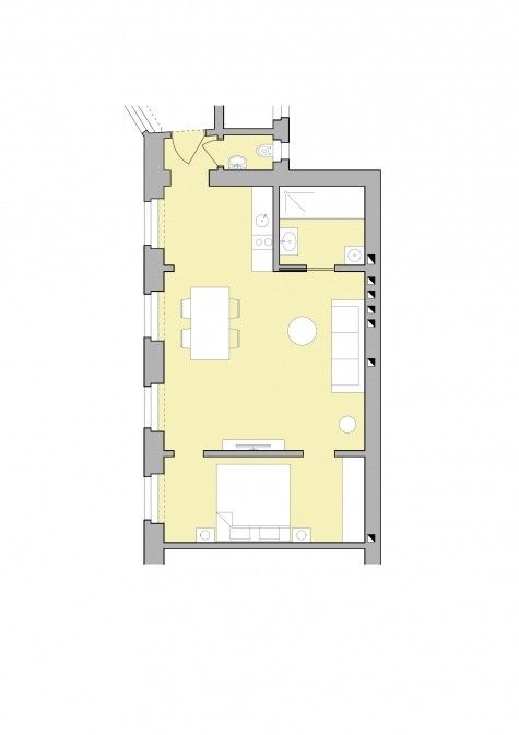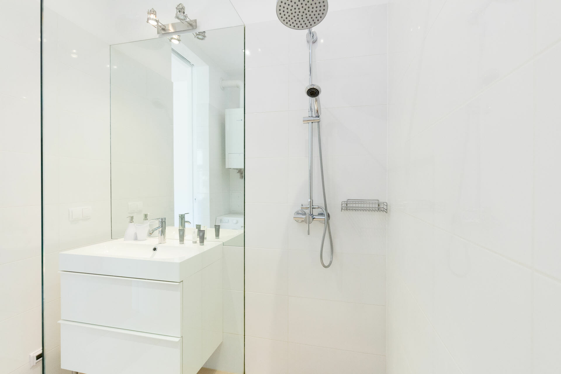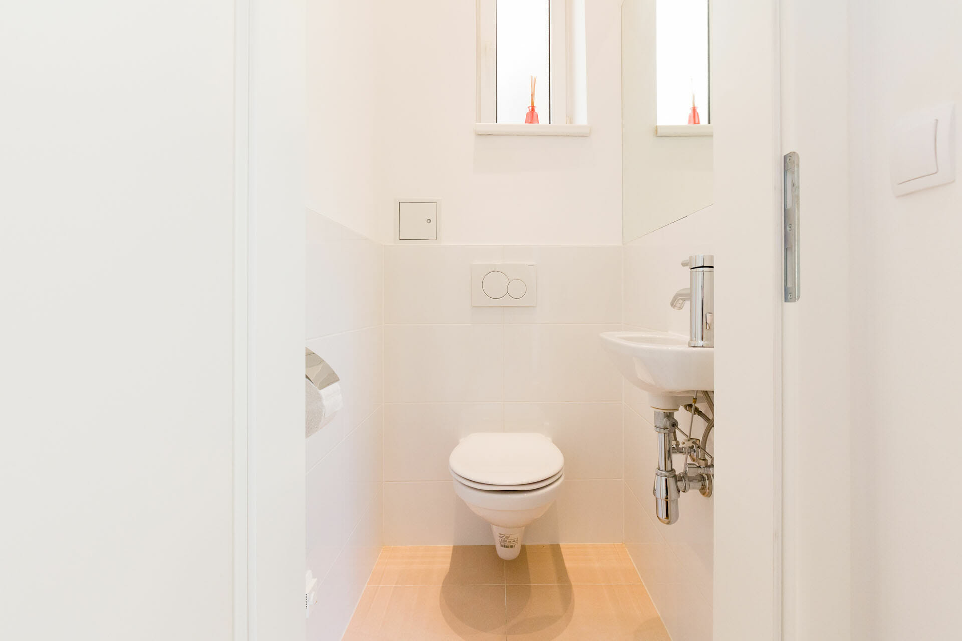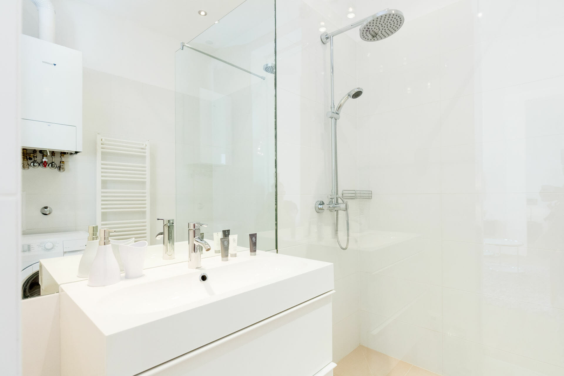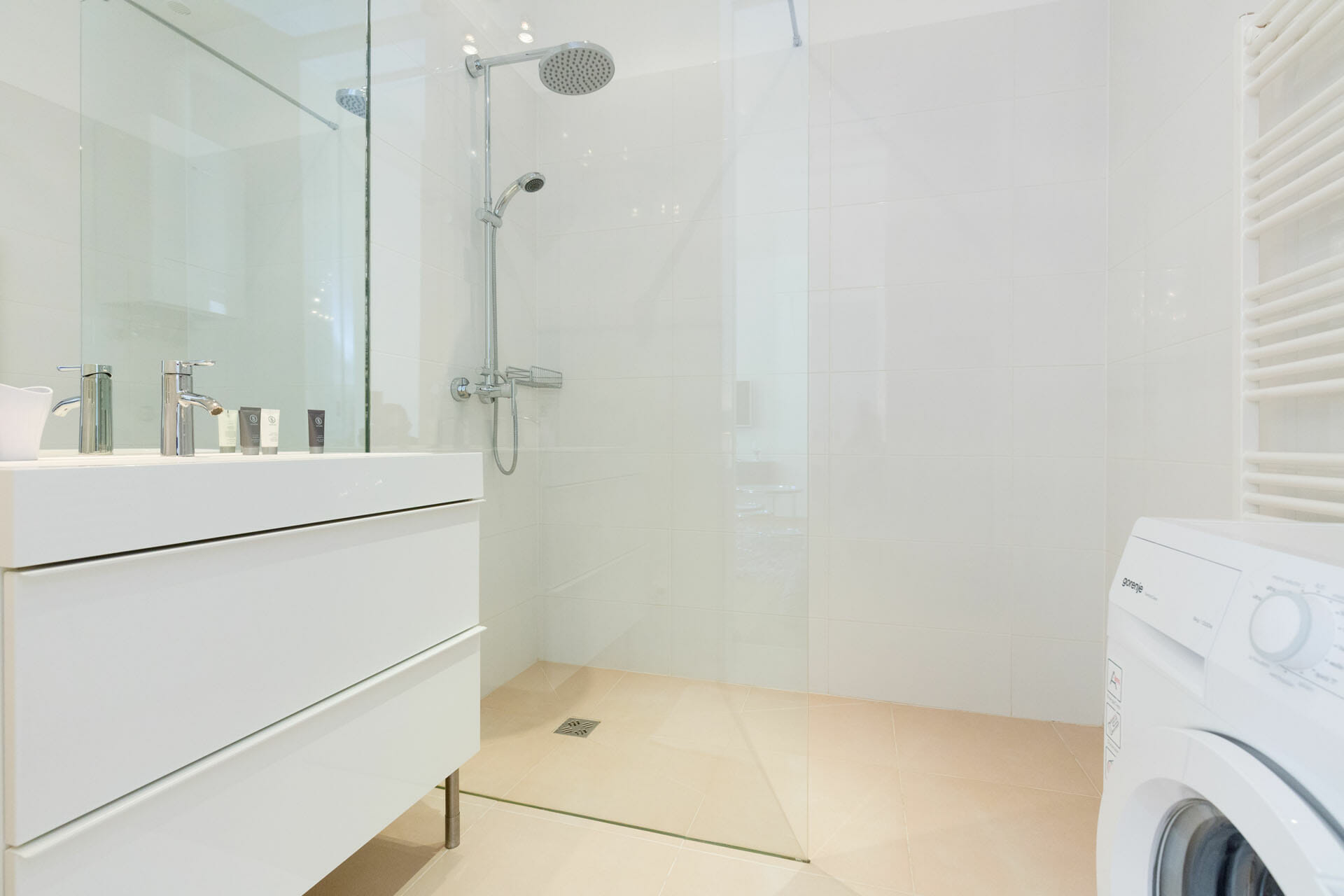 The apartment includes a compact yet modern bathroom with a rain shower and washing machine, while the toilet is located in a separate room for added privacy and comfort.