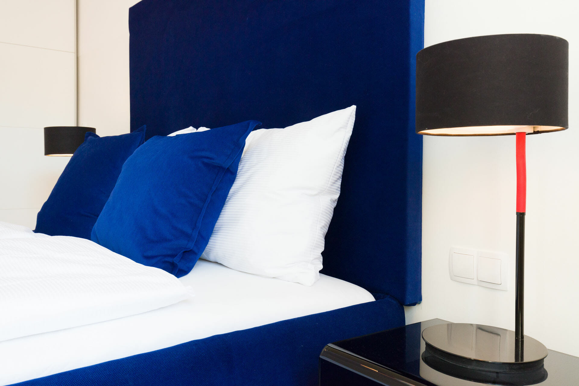 The bedroom is separated by a modern wall with sliding doors, accessible from both sides of the bed. Inside, you’ll find a self-made double bed upholstered in a rich dark blue fabric, creating a cozy and serene environment for restful nights. Window blinds allow you to darken the room as needed, and there’s a wardrobe for convenient storage.