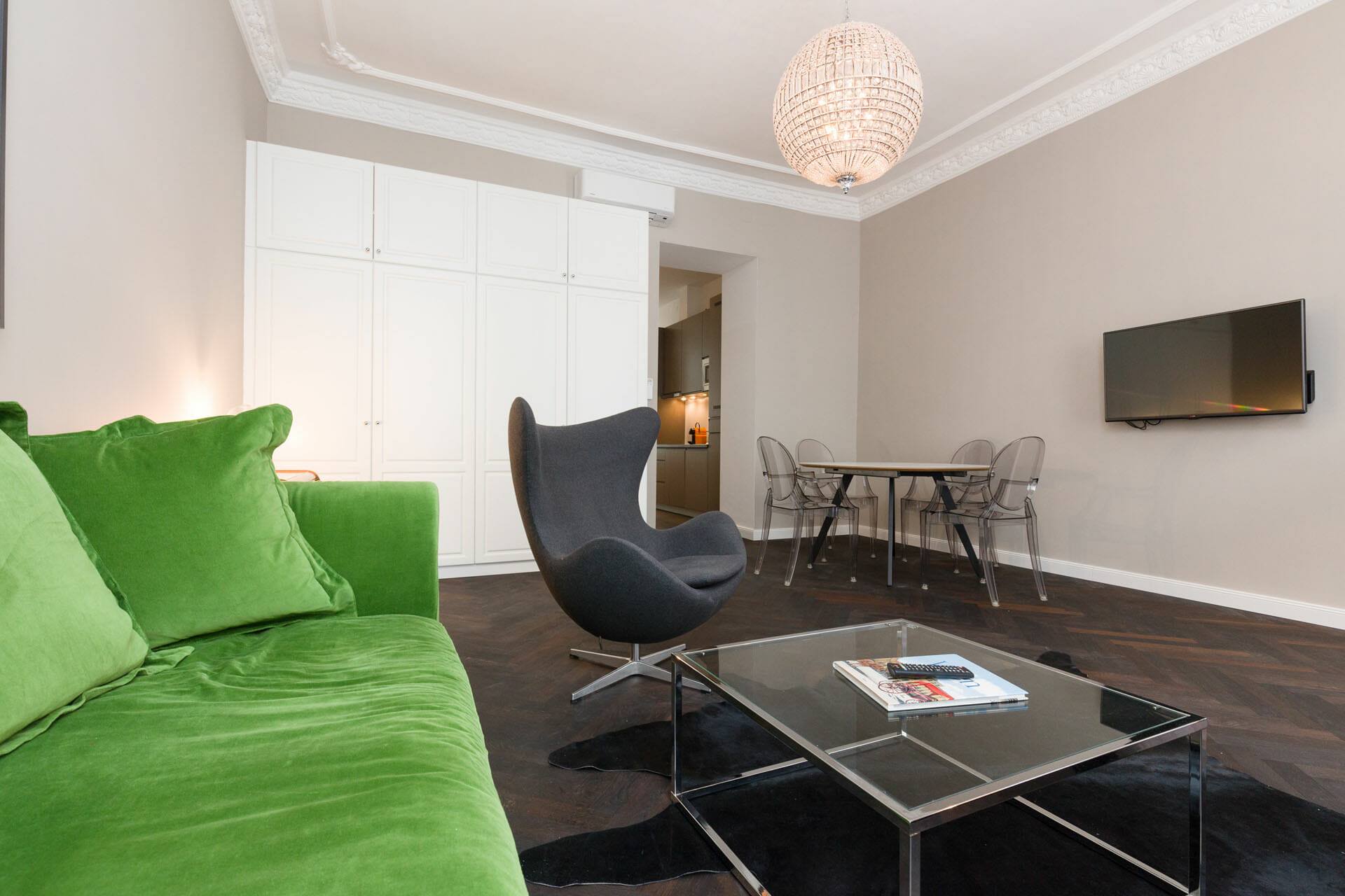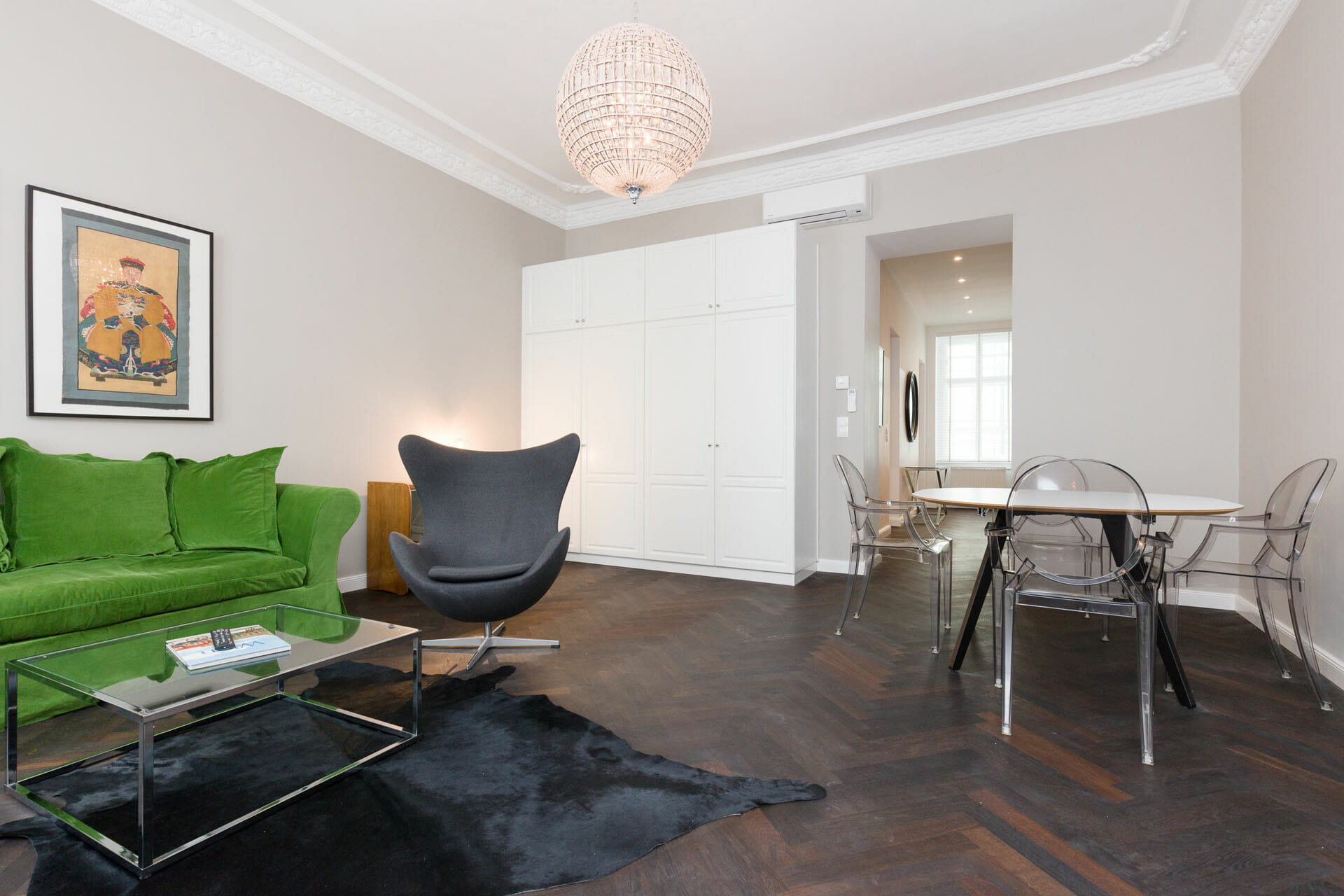 Superstylish 1 bedroom next to vienna stock exchange This very stylish Apartment has been recently renovated. It is located very near to the City Center of vienna. It is fully equipped with Aircondition. Equipment: electric stove, oven, refrigerator, freezer, coffee machine, water heater, toaster, frying pan, cooking pot, Kitchenware, sofa bed, sofa, TV, double bed, lift, washing machine, vacuum cleaner, Internet, Digital Cable TV, Fully equipped kitchen, Fully furnished interior, Non smoking, Cleaning utensils supplied adequately.