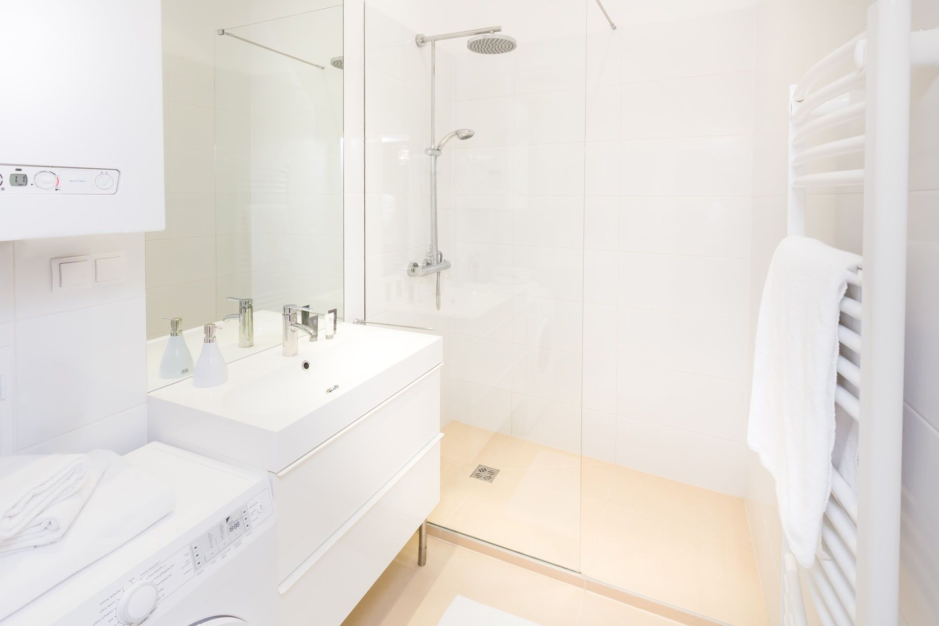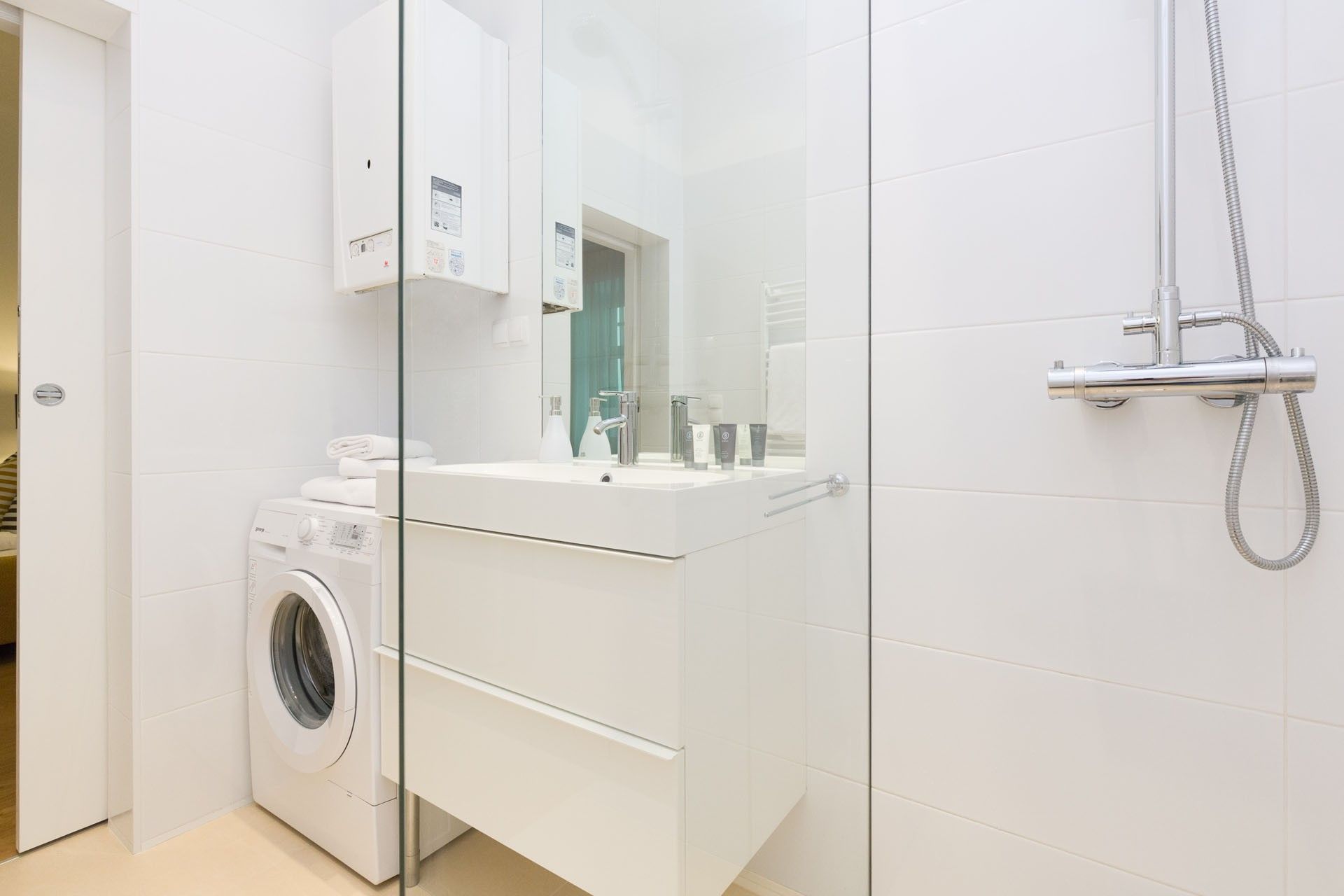 The bathroom features a simple yet fresh design, complete with a rain shower and washing machine, while the toilet is conveniently located in a separate room. Ideal for someone who values creativity, comfort, and smart use of space, this studio is a bright little gem full of personality.