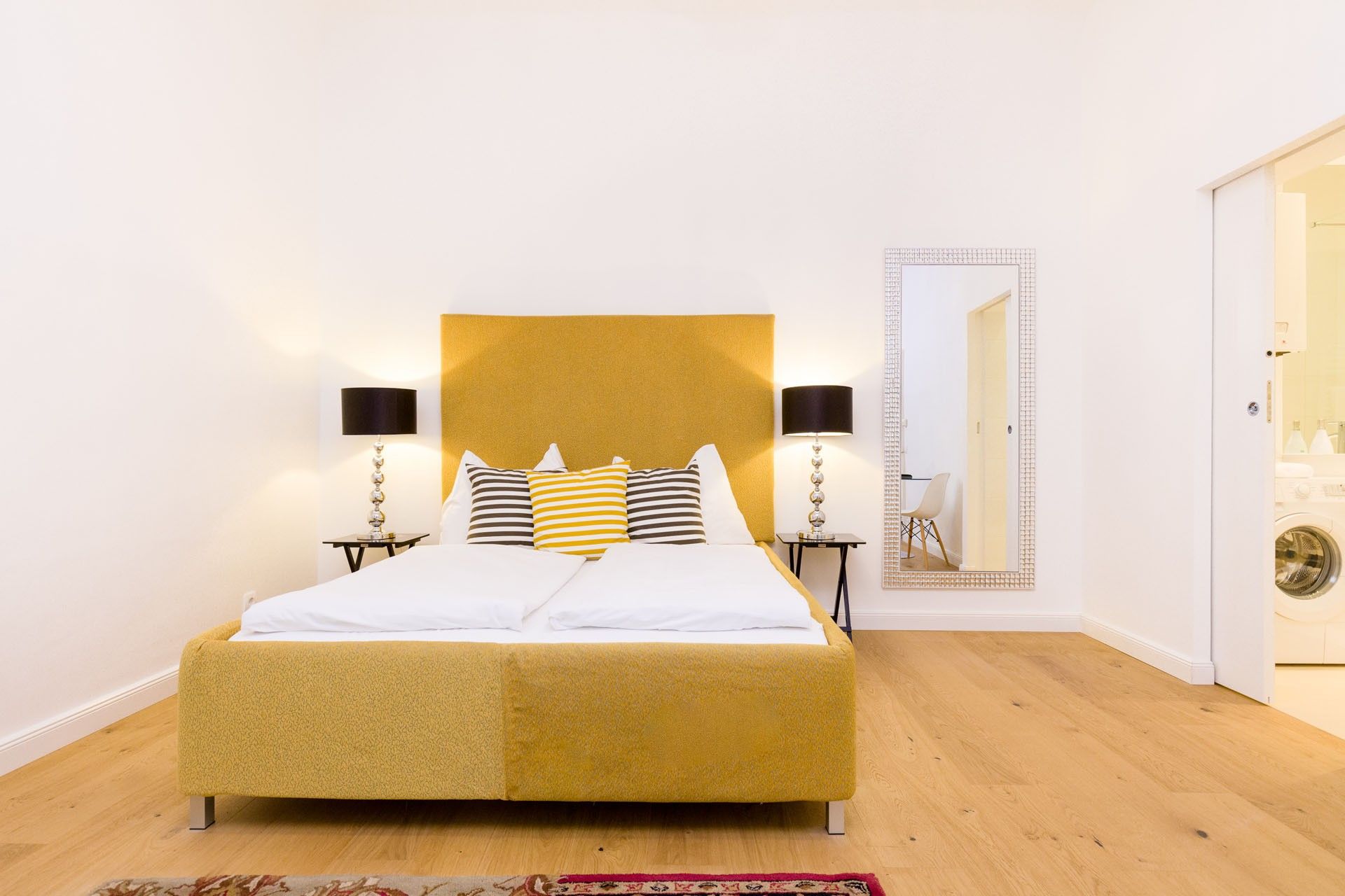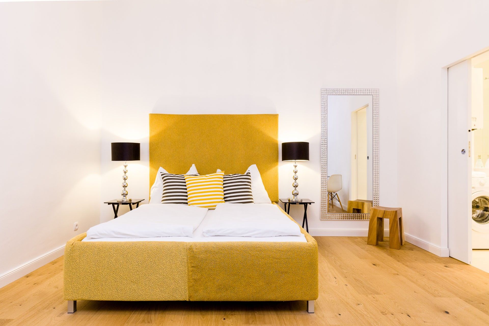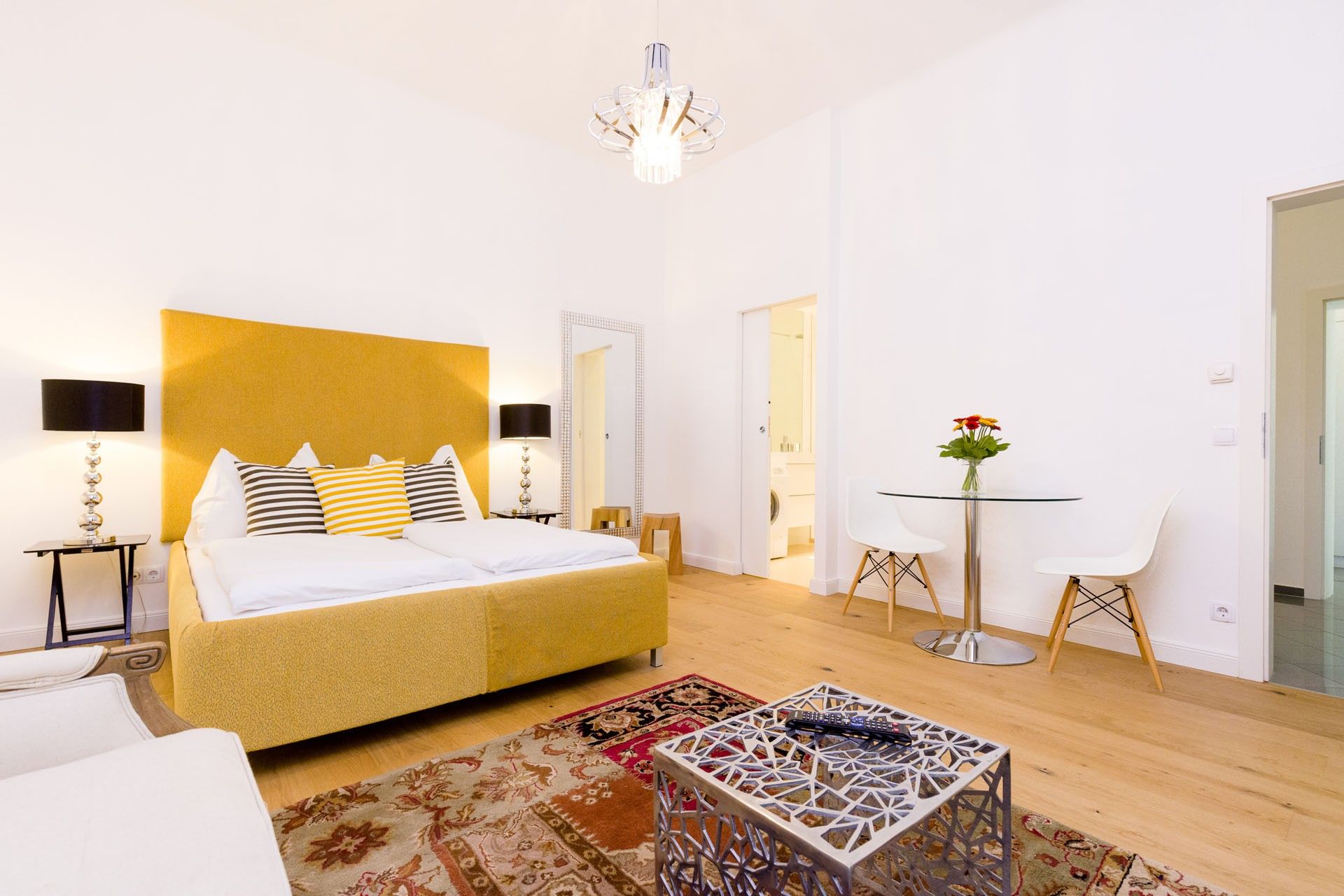 The self-made bed, complete with custom upholstering, pairs beautifully with unique bedside tables and lamps, creating a warm and personal atmosphere. A cozy chaise lounge invites you to unwind in the evenings, and a round glass table provides a perfect spot for meals, work, or quiet reflection.