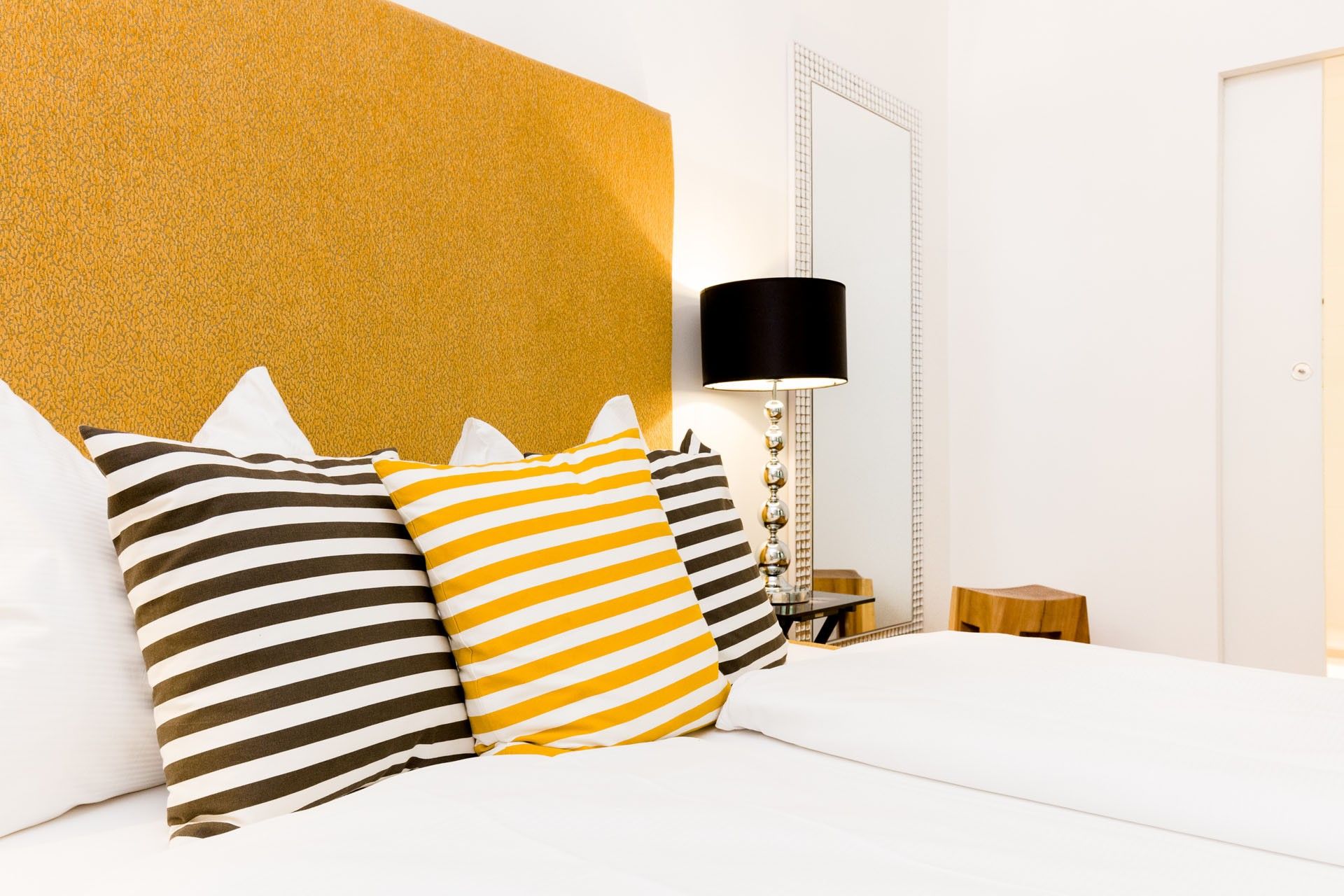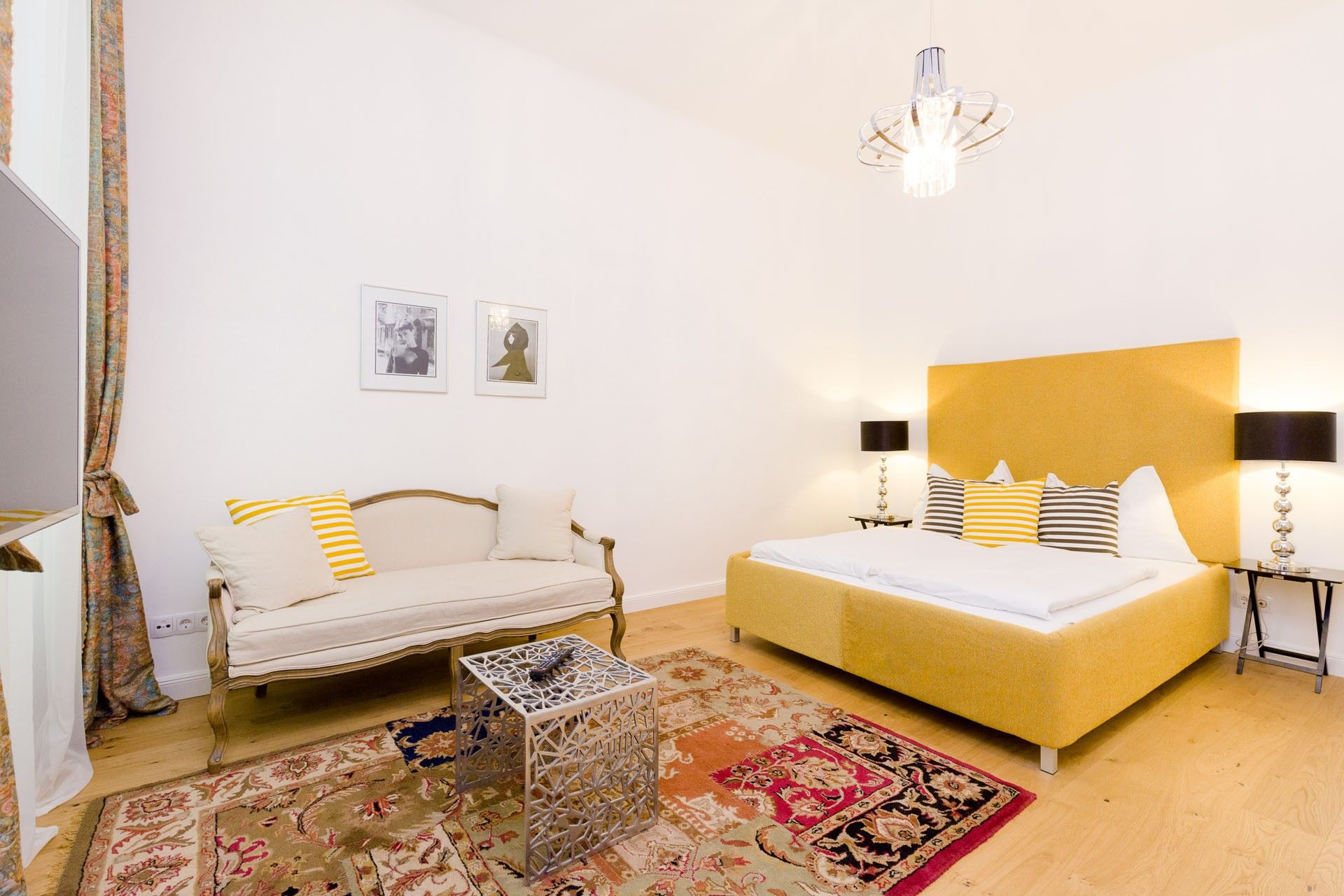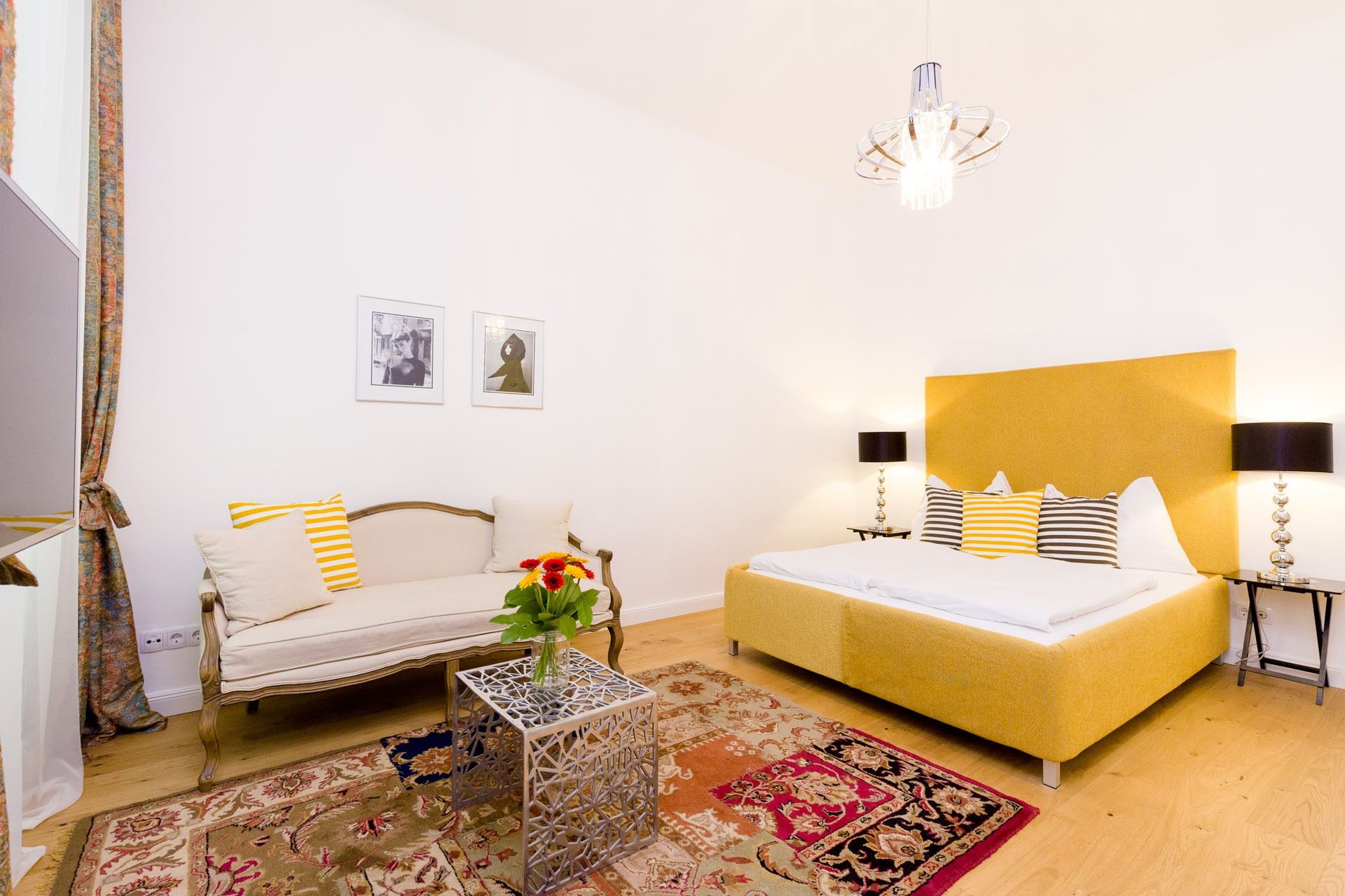 The self-made bed, complete with custom upholstering, pairs beautifully with unique bedside tables and lamps, creating a warm and personal atmosphere. A cozy chaise lounge invites you to unwind in the evenings, and a round glass table provides a perfect spot for meals, work, or quiet reflection.