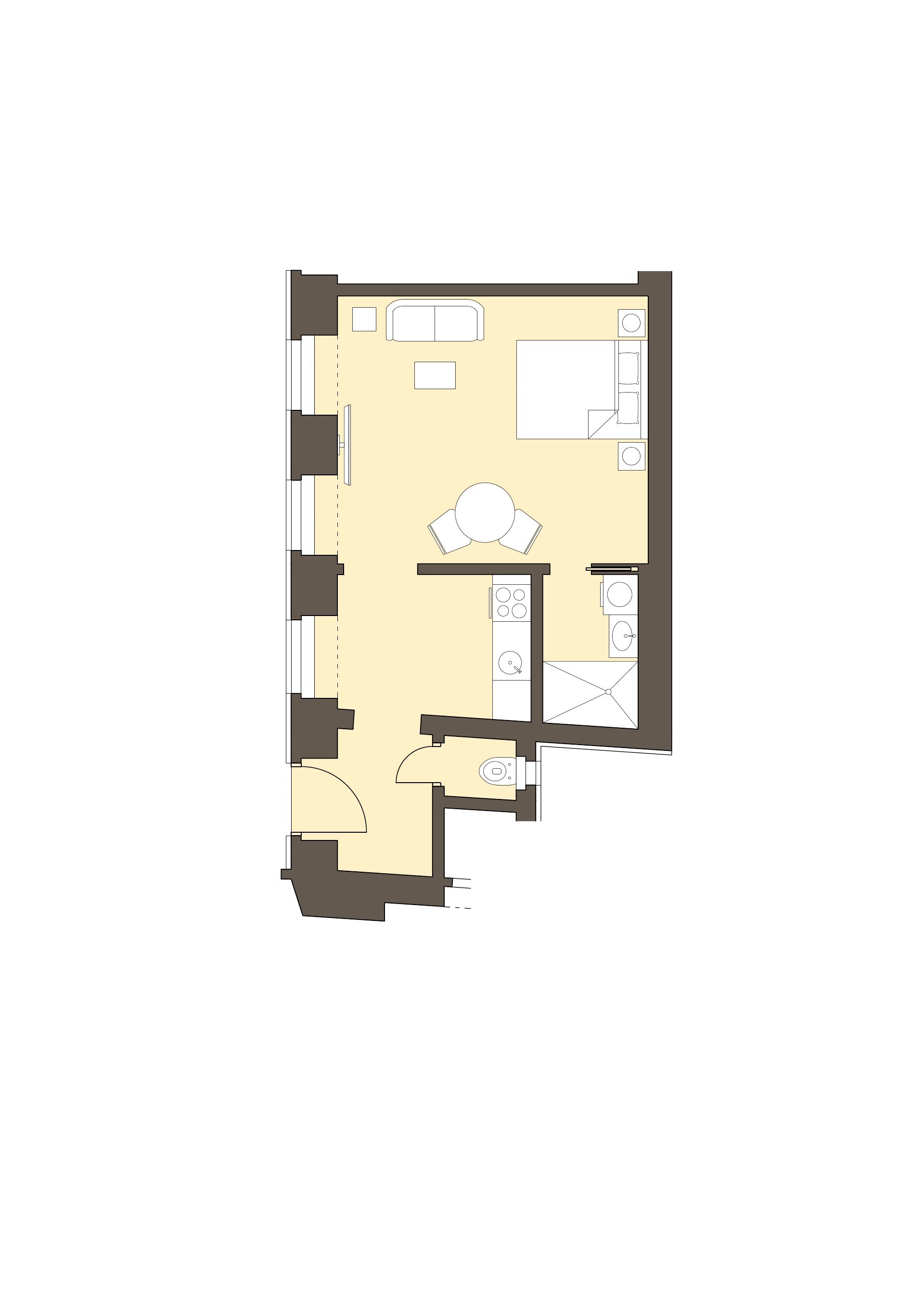 This charming studio apartment makes the most of its small footprint, offering everything you need in a thoughtfully designed and inviting space. Bathed in cheerful yellow tones, the interior feels bright and uplifting, while deep purple curtains add a bold, stylish contrast that unexpectedly ties the room together.