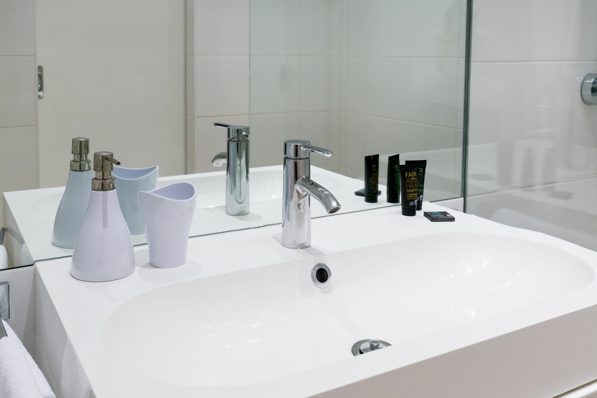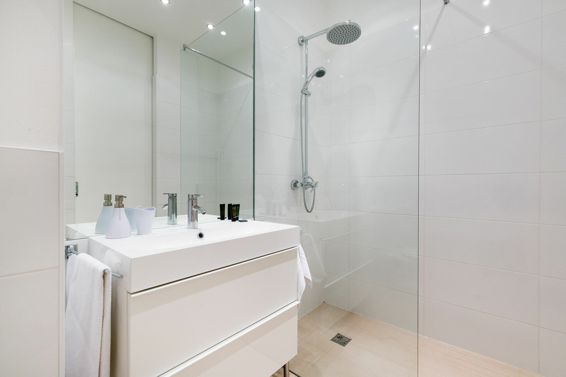 The corner kitchenette is fully equipped with everything you need for cooking and dining, including a large built-in fridge, washing machine, and all the essential modern appliances. To complete the space, a stylish bar table is attached to the kitchen, providing a sleek, modern vibe and making it ideal for casual meals or social gatherings.