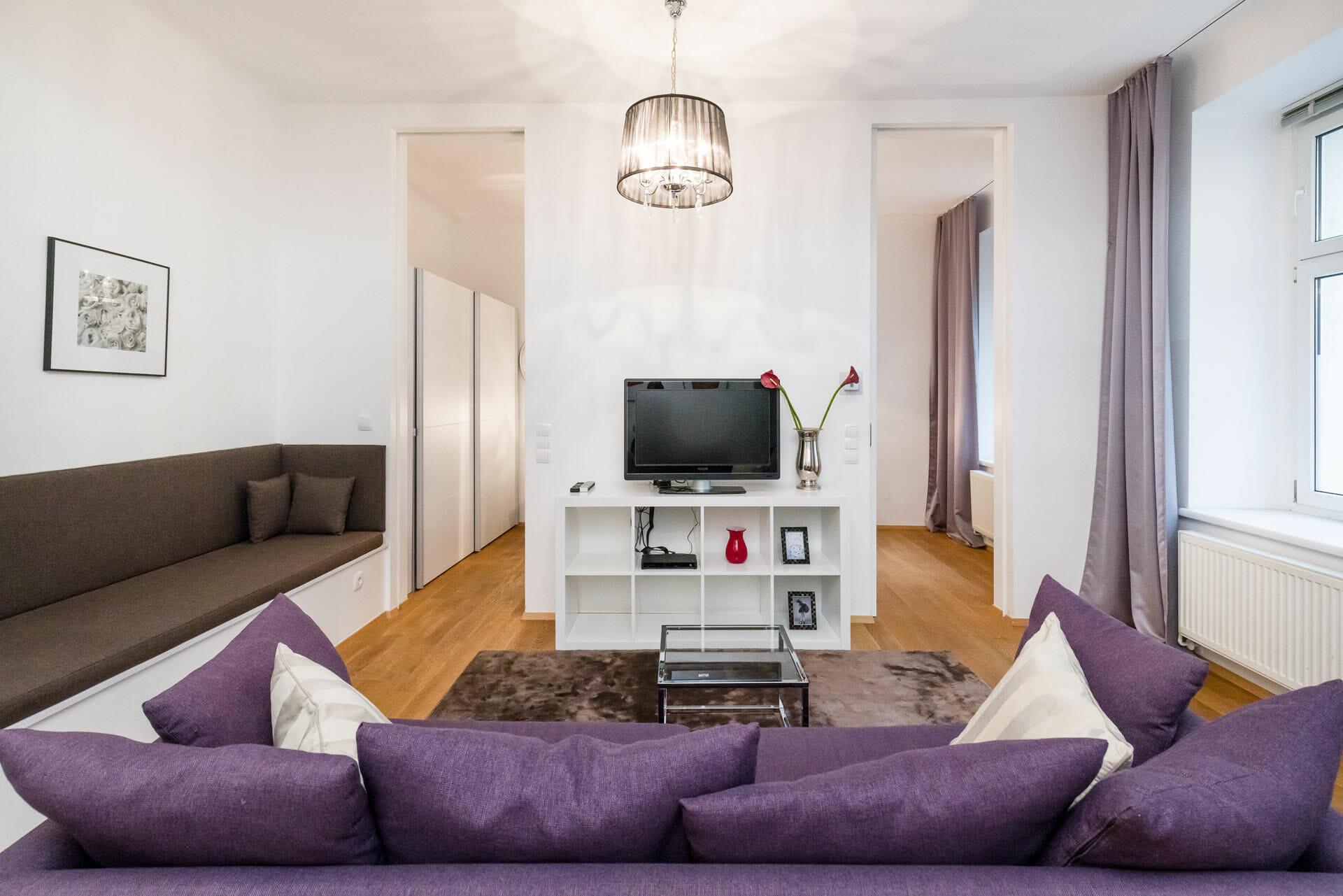 The interior features a soothing palette of purple tones accented with bold red details, creating a warm, calming atmosphere throughout. The separate bedroom is thoughtfully divided from the living room by a partial wall and elegant sliding doors, ensuring privacy while maintaining an open and airy feel.