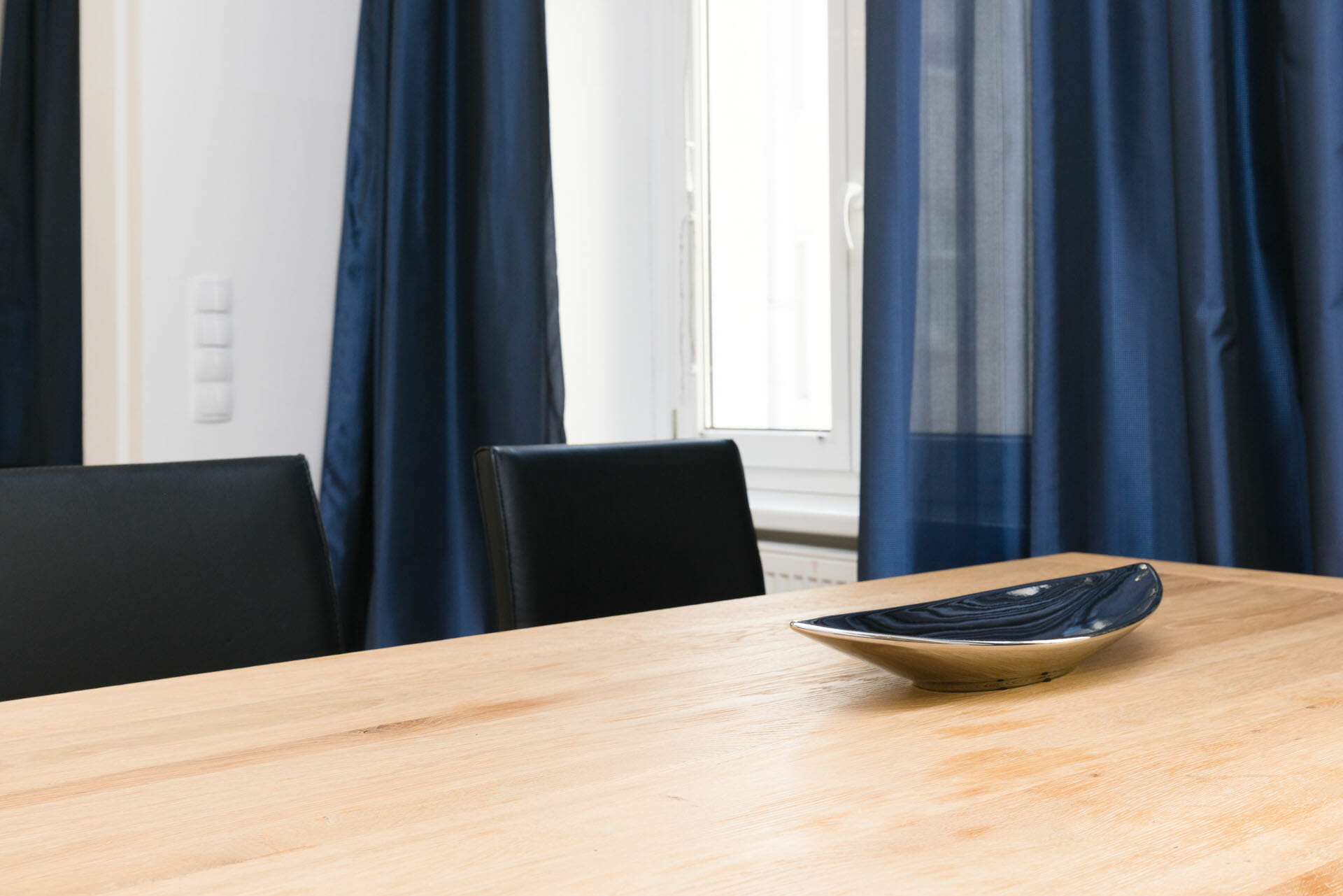 The interior features luxurious furniture and a refined color palette of silver tones, accented with deep blue curtains and tasteful dark green touches. The heart of the apartment is a spacious dining table that doubles as an ideal workspace, perfect for both everyday meals and productive hours.