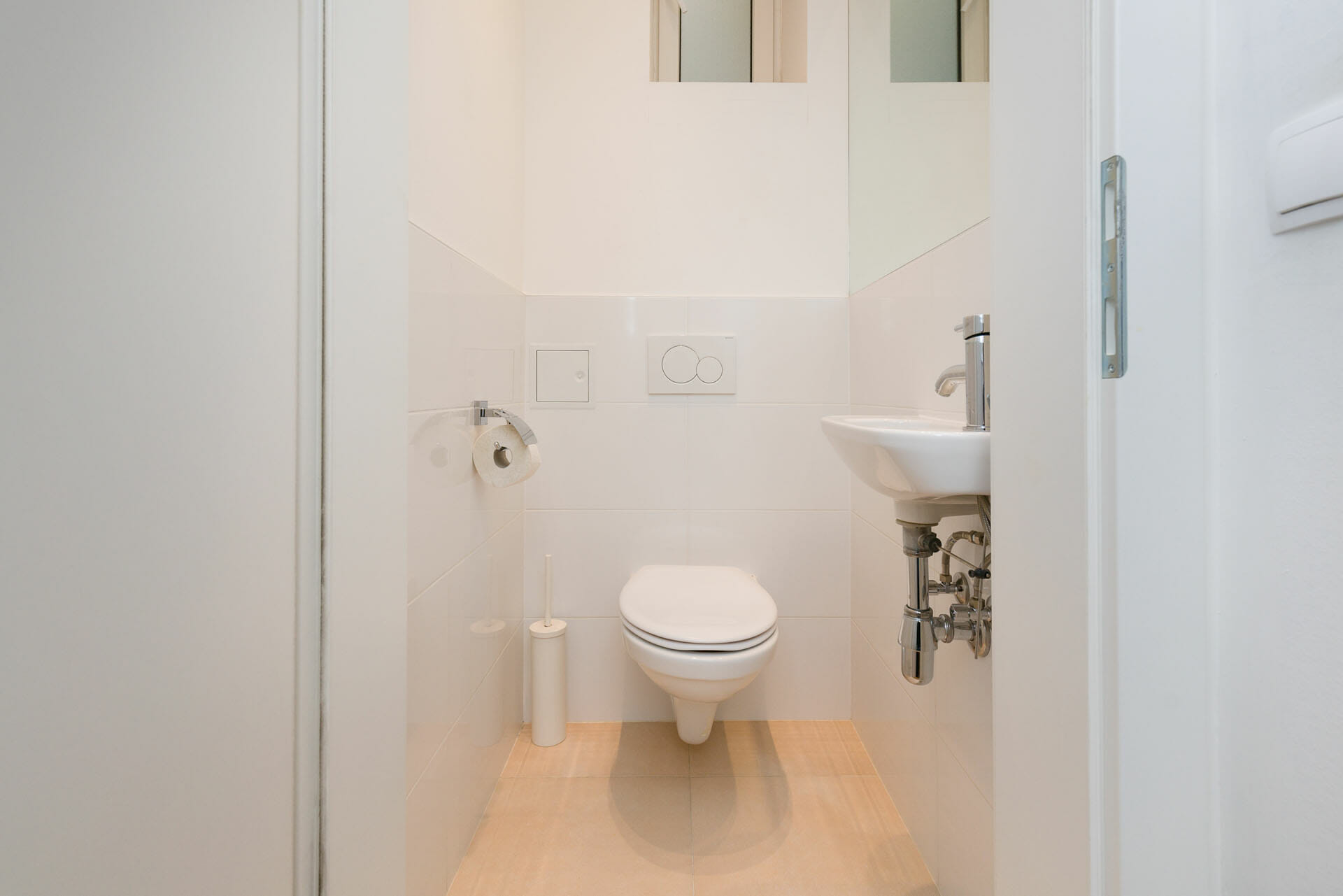 The bathroom, though compact, includes all essentials—highlighted by a rain shower and a washing machine—while the toilet is in a separate room for added privacy and convenience.