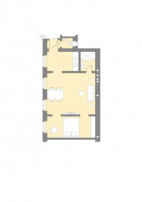 Upon entry, you’re welcomed by a small but practical entryway that leads directly into a bright and well-appointed kitchen. Fully equipped with a large fridge with freezer compartment, a dishwasher, and other useful appliances, the kitchen is designed with function in mind, including a clever pull-out section beneath the fridge to extend your counter space. The kitchen is separated from both the living room and the bedroom, offering a distinct and peaceful culinary zone.