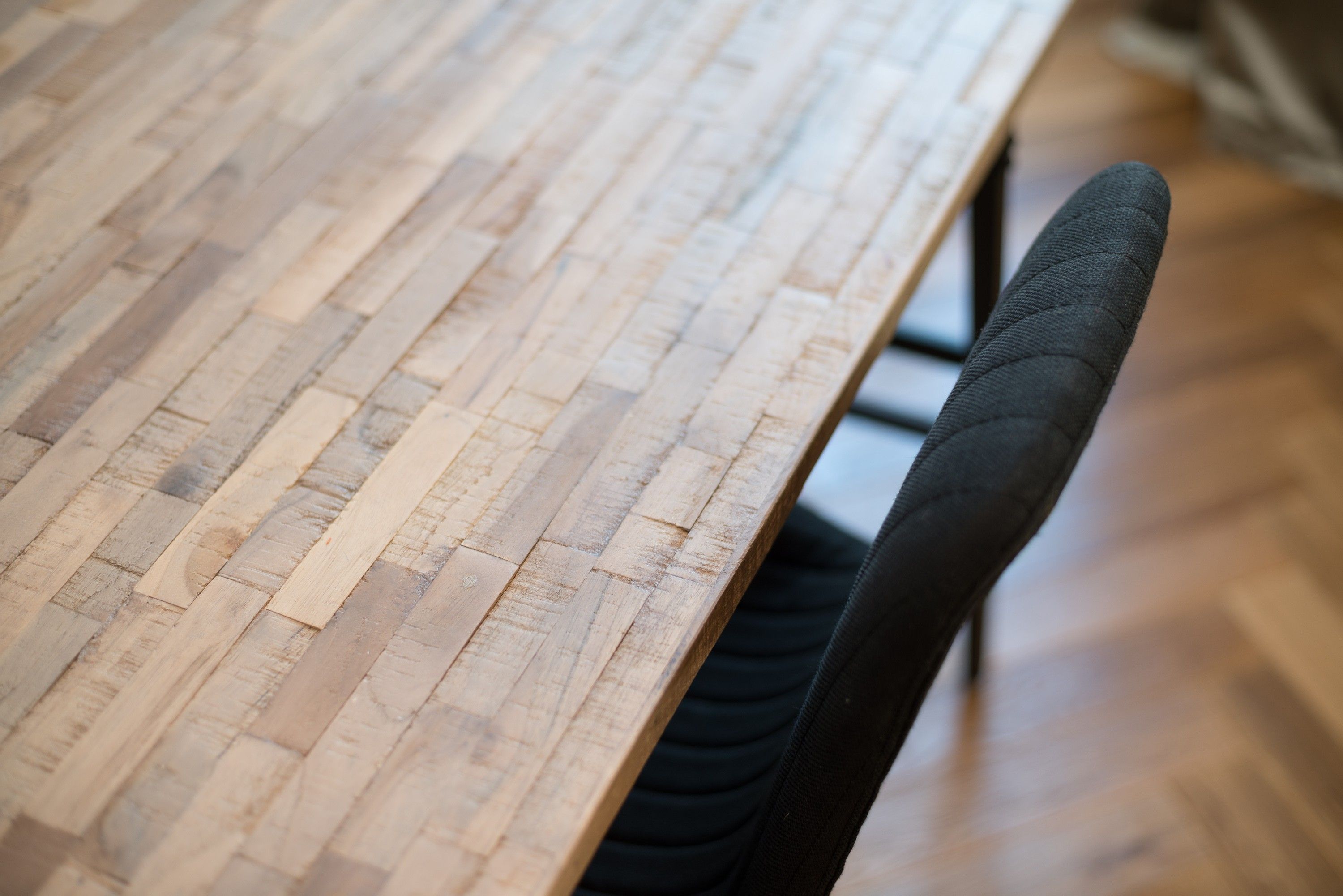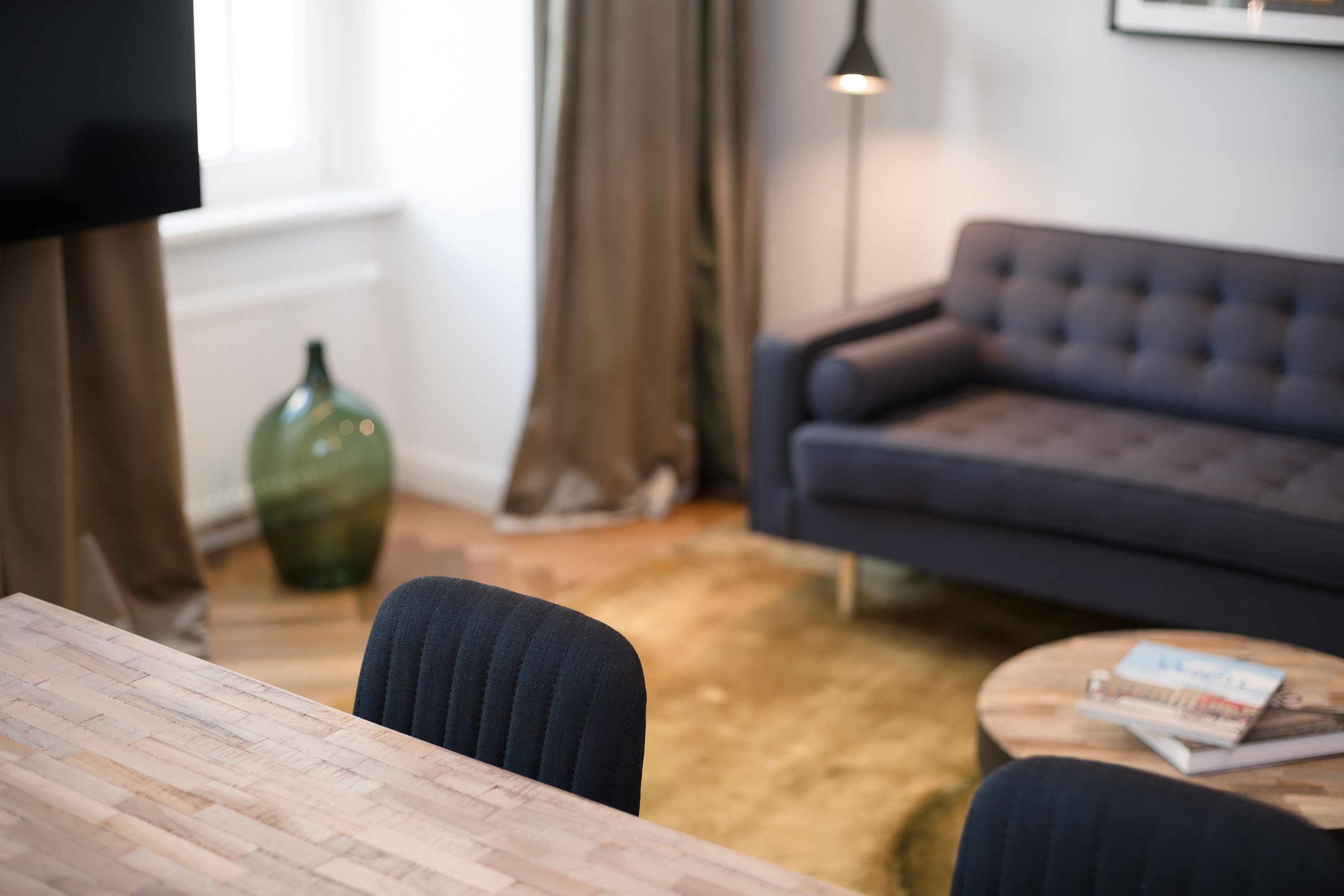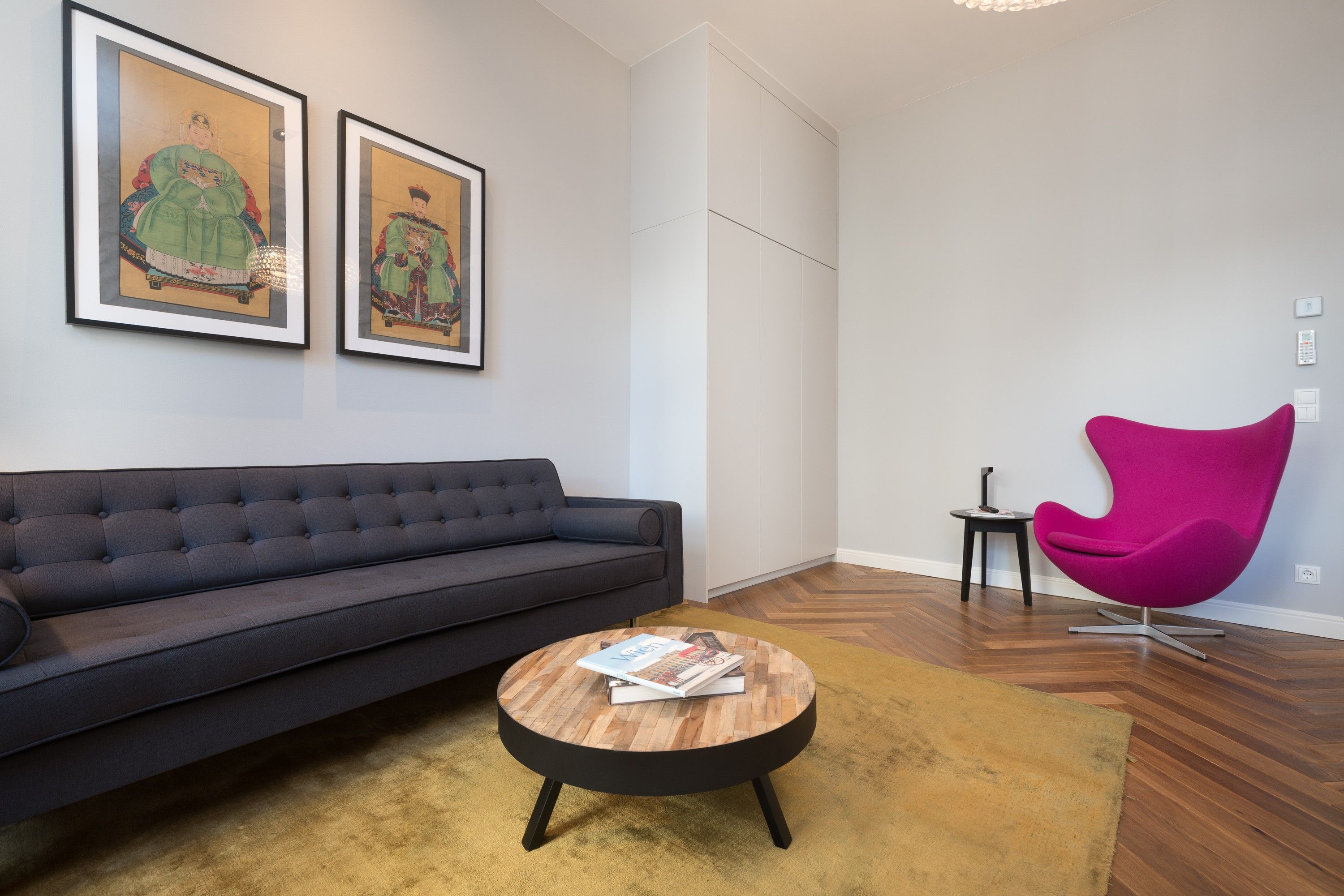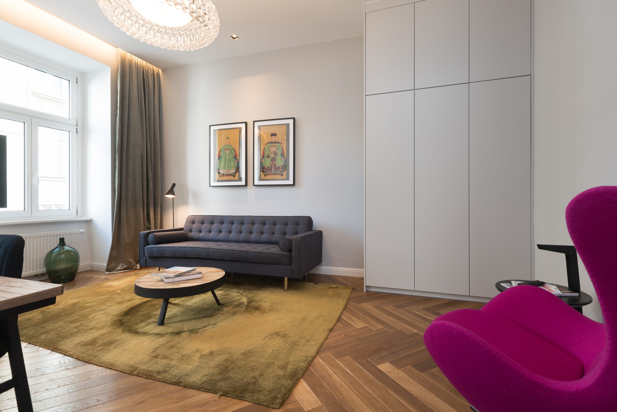 The living area is centered around a spacious wooden-design dining table, paired with dark velvet chairs that add a touch of sophistication. A large 3–4 seater couch and a sleek wooden coffee table offer the perfect place to relax, complemented by a bright egg chair that brings a cheerful pop of color. With multiple lighting options, the room can shift from cozy evenings to vibrant social settings at the touch of a switch. A custom-made wardrobe stretches up to the high ceiling, providing elegant and ample storage.