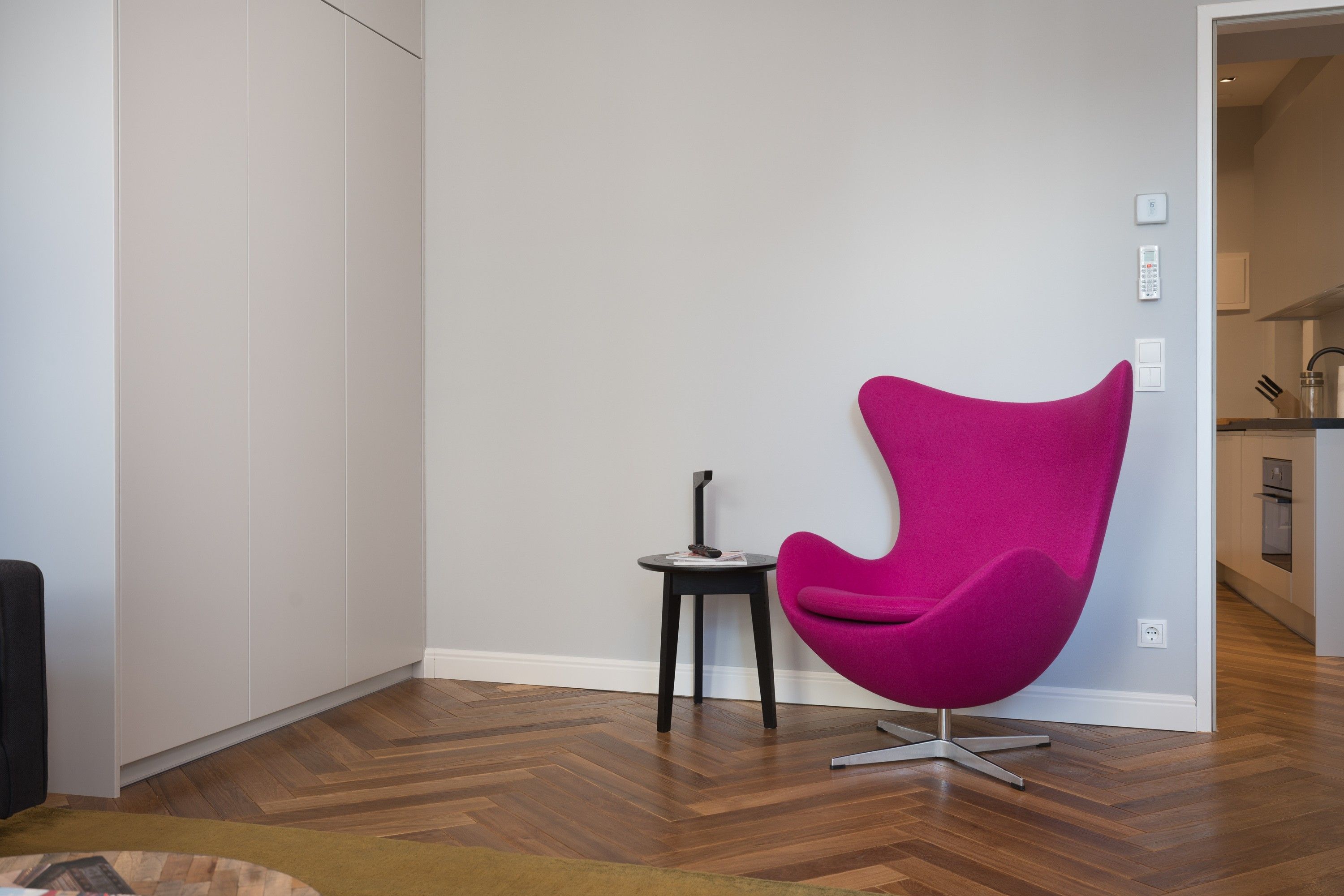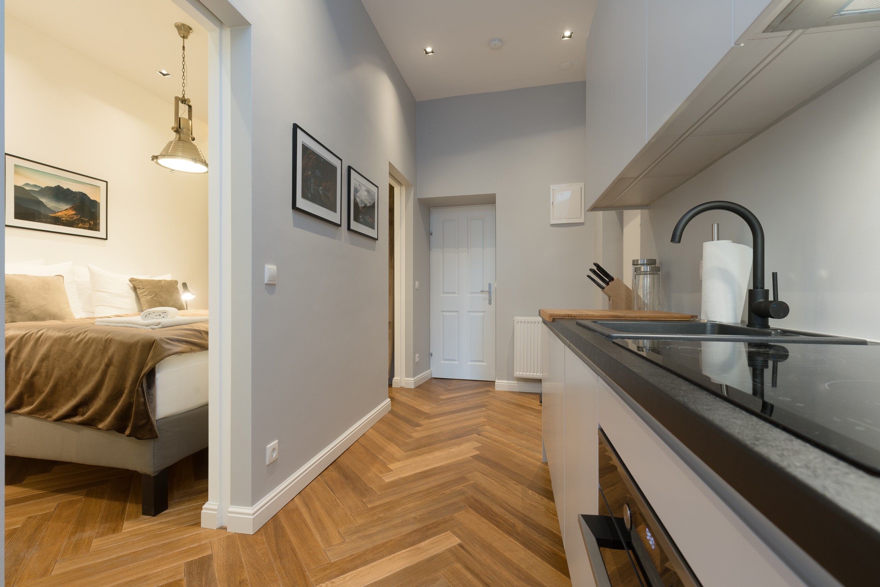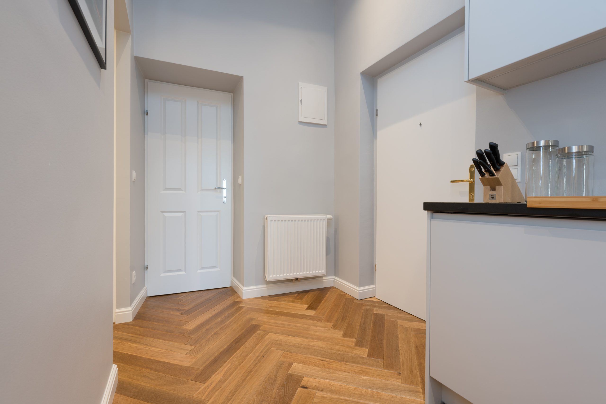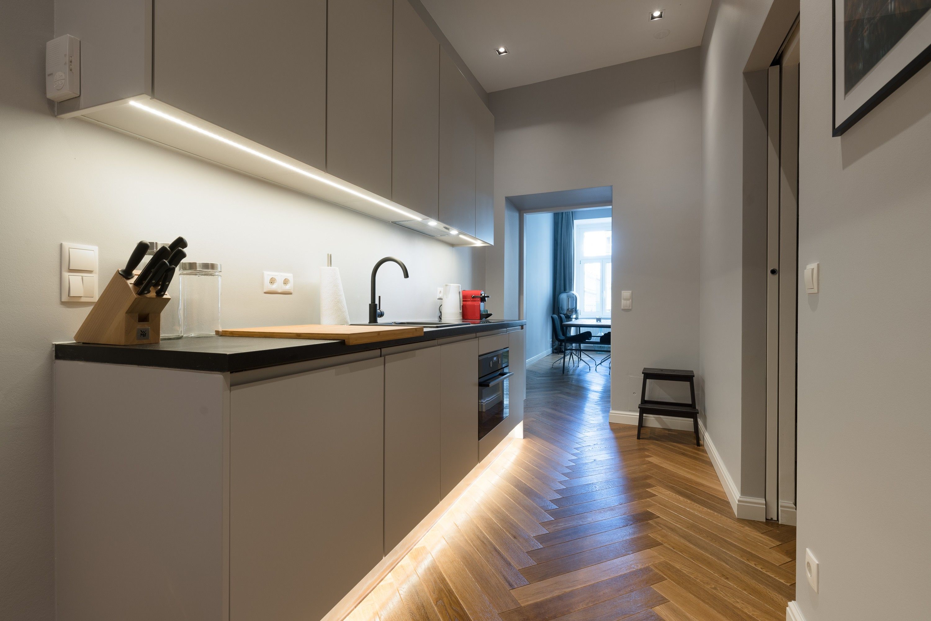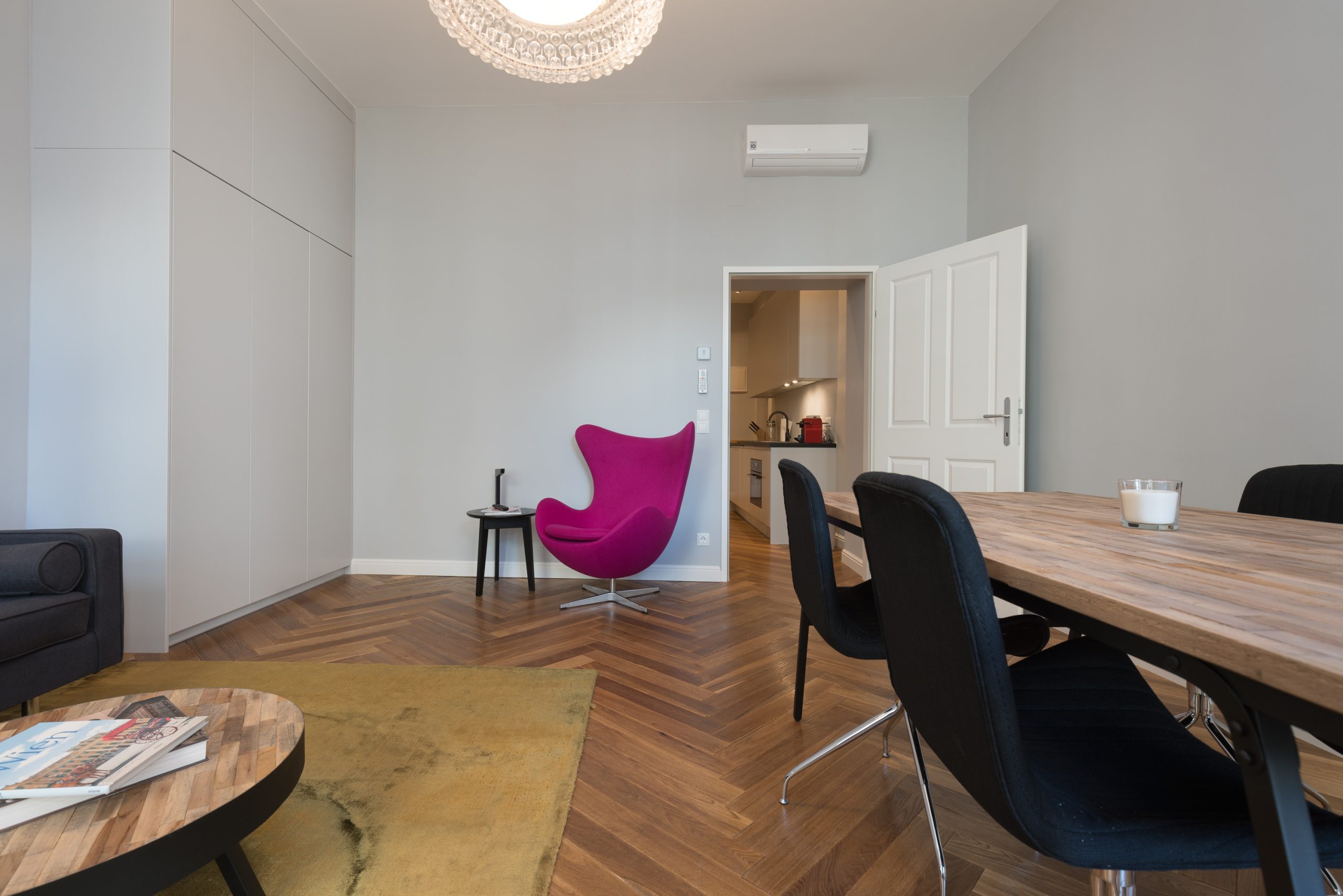 The entrance area blends seamlessly into the kitchen, where a stylish, fully equipped setup offers everything needed for cooking and hosting in style. From the modern appliances to the streamlined design, every element has been carefully chosen for both function and form. Air conditioning ensures year-round comfort, making this apartment an ideal space for those who appreciate refined living with thoughtful touches.