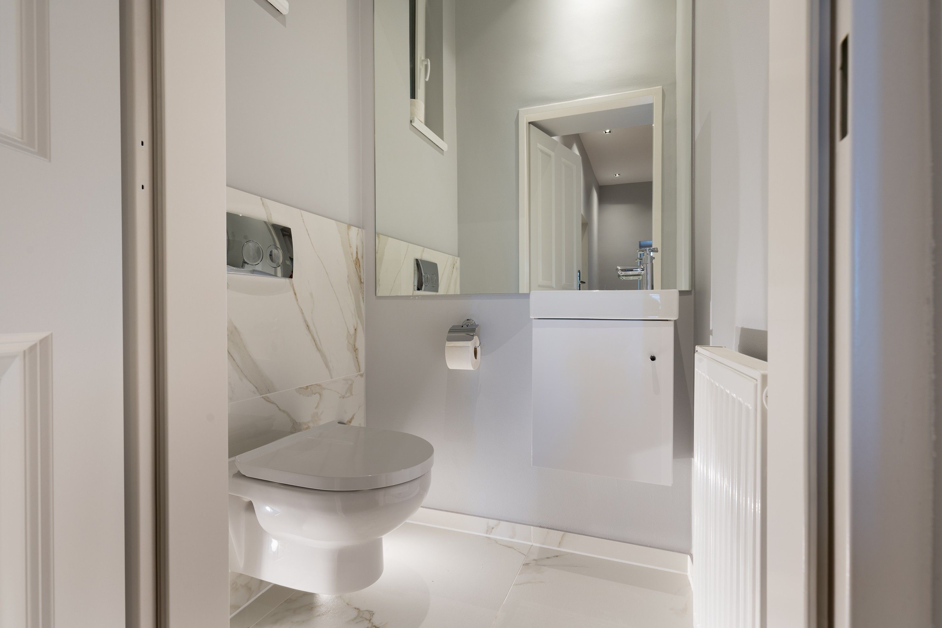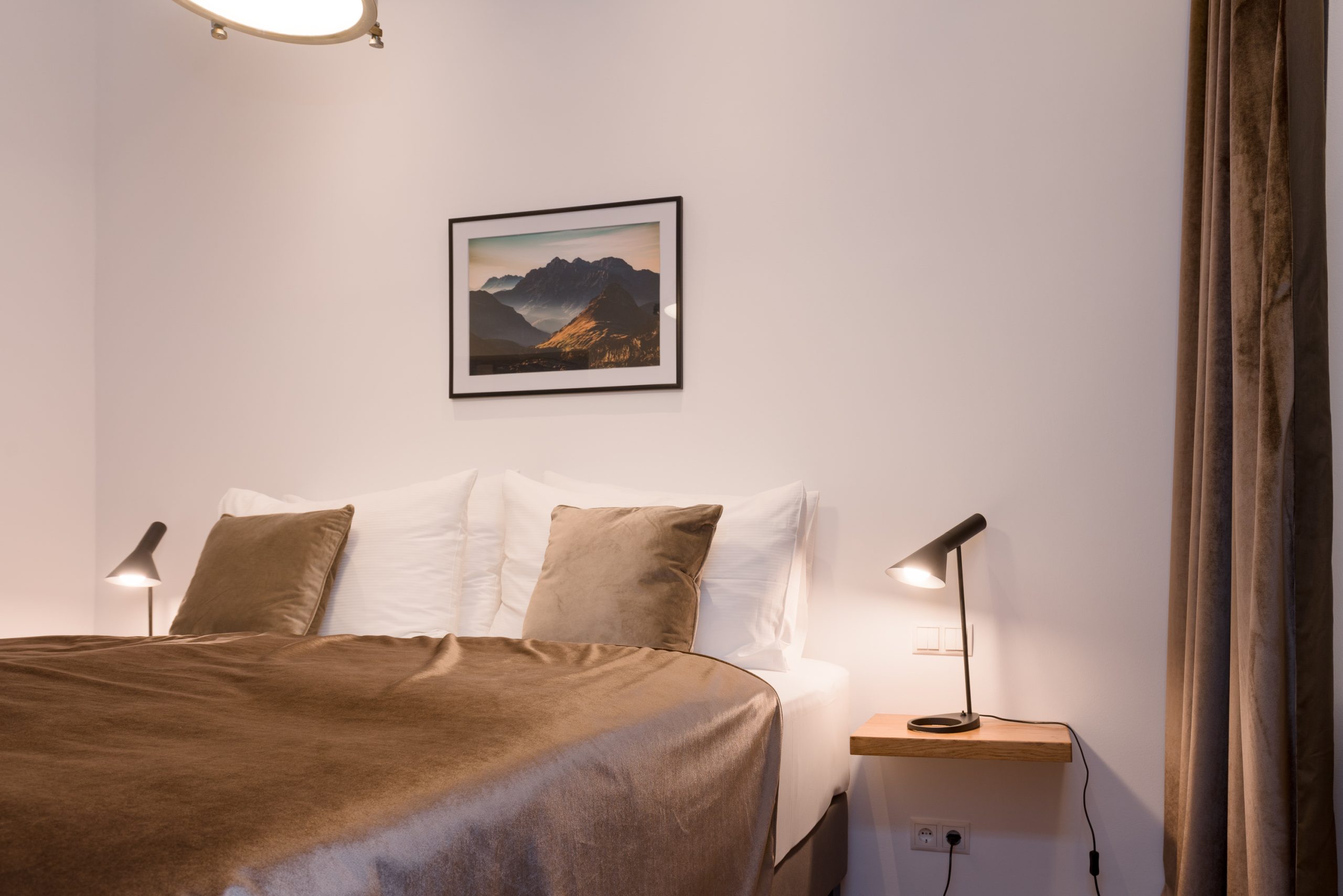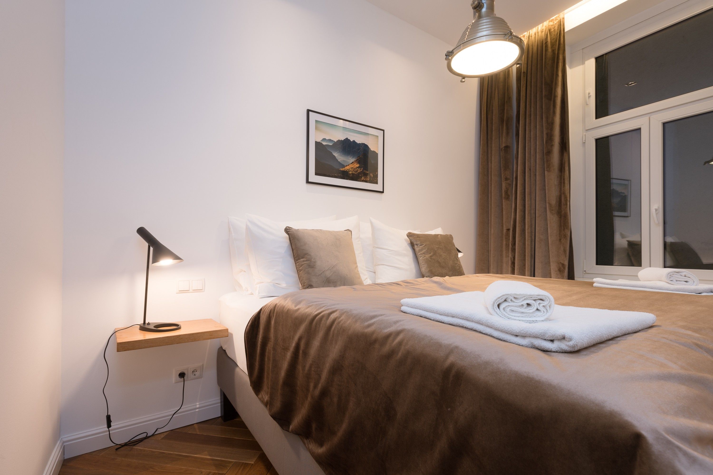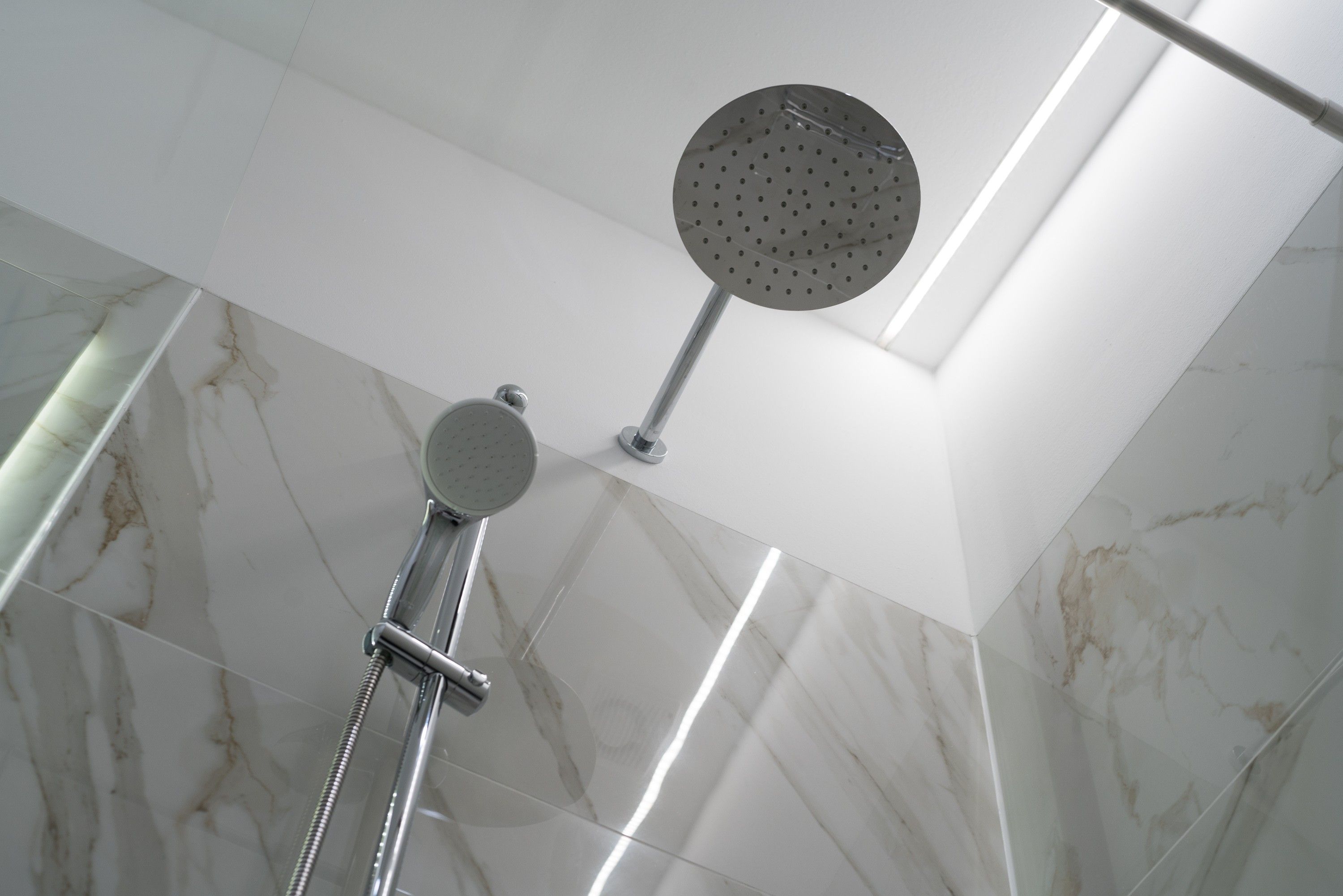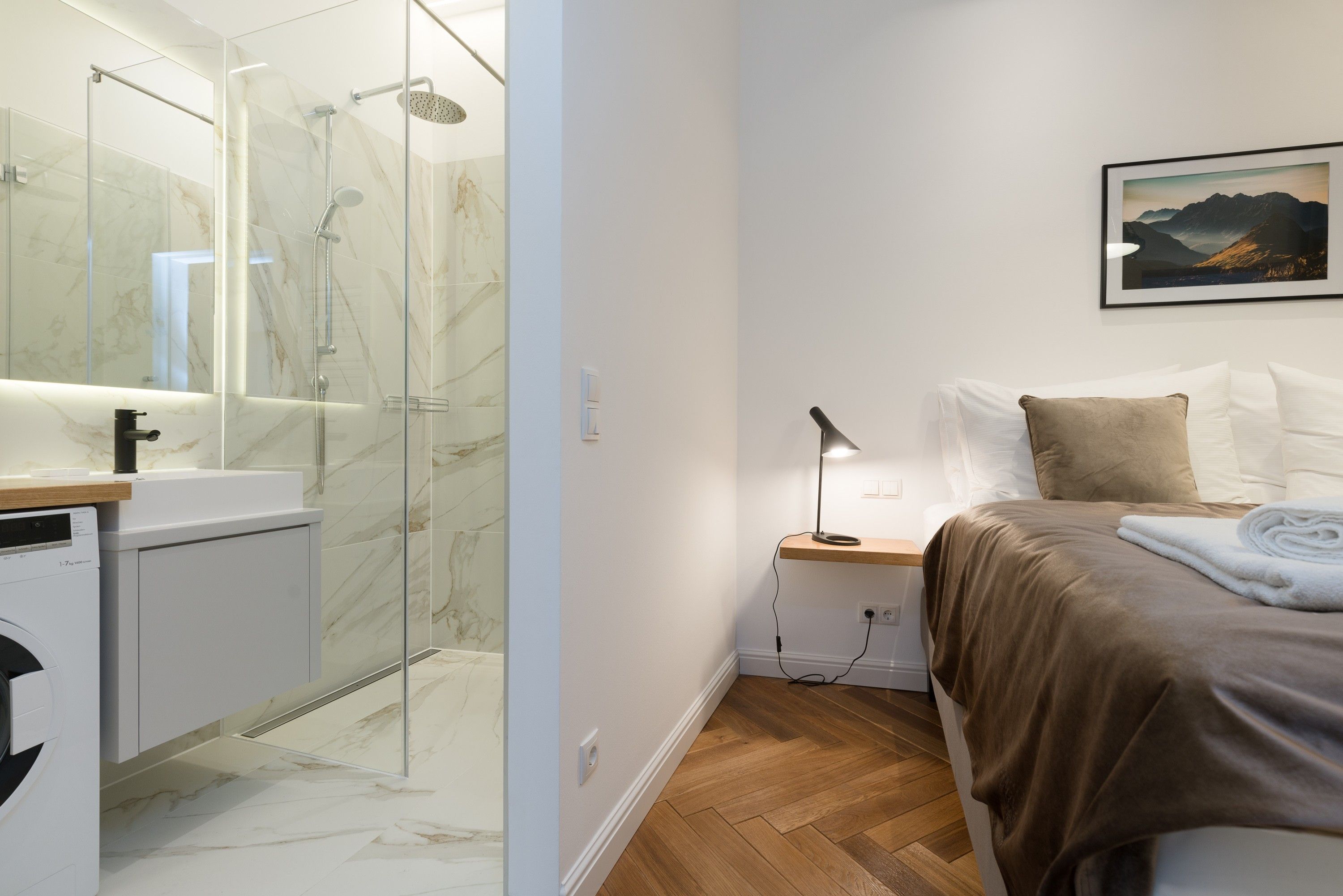 The bedroom is a true retreat, with private entrances on each side of the luxurious 5-star bed and custom blackout curtains designed for uninterrupted rest. It features an ensuite bathroom with light marble tiles and a rain shower, creating a spa-like experience. A separate toilet adds extra convenience and privacy.