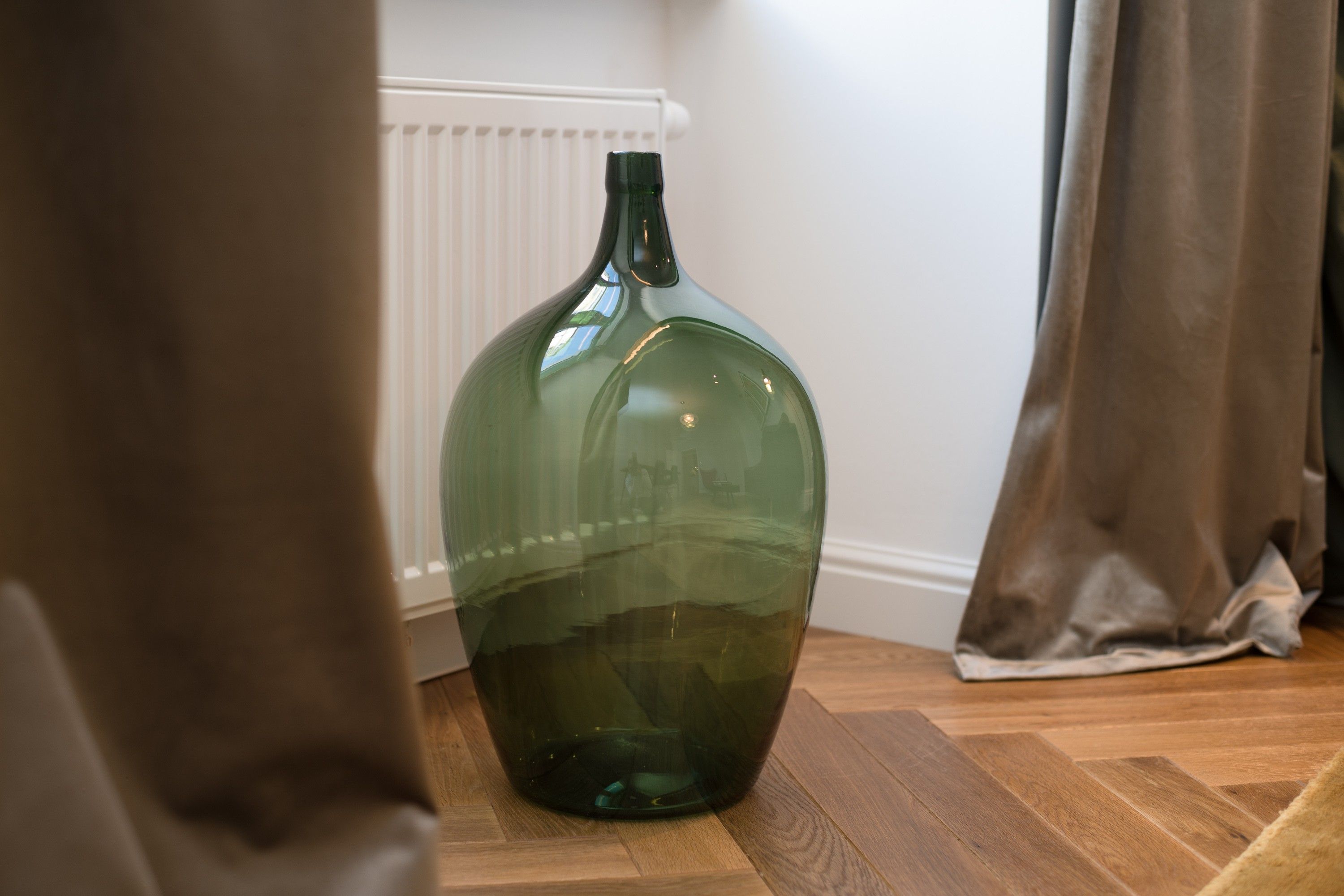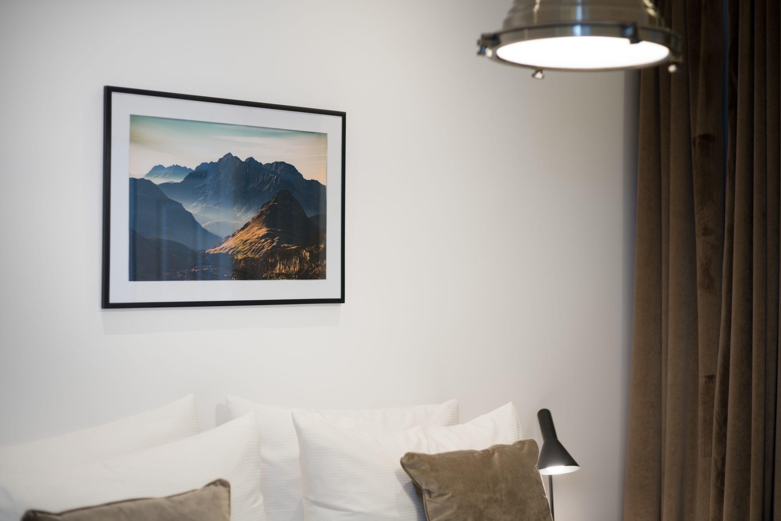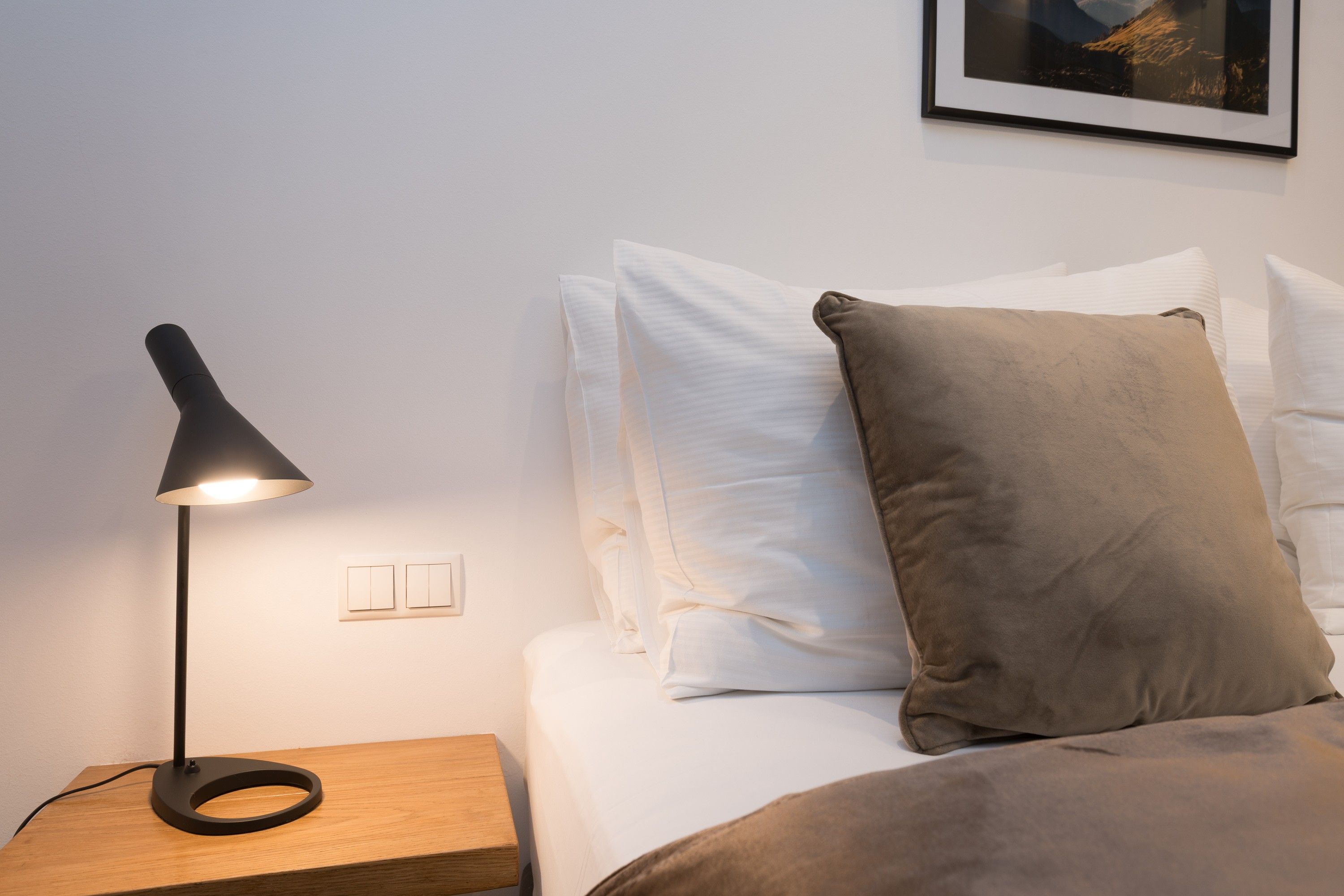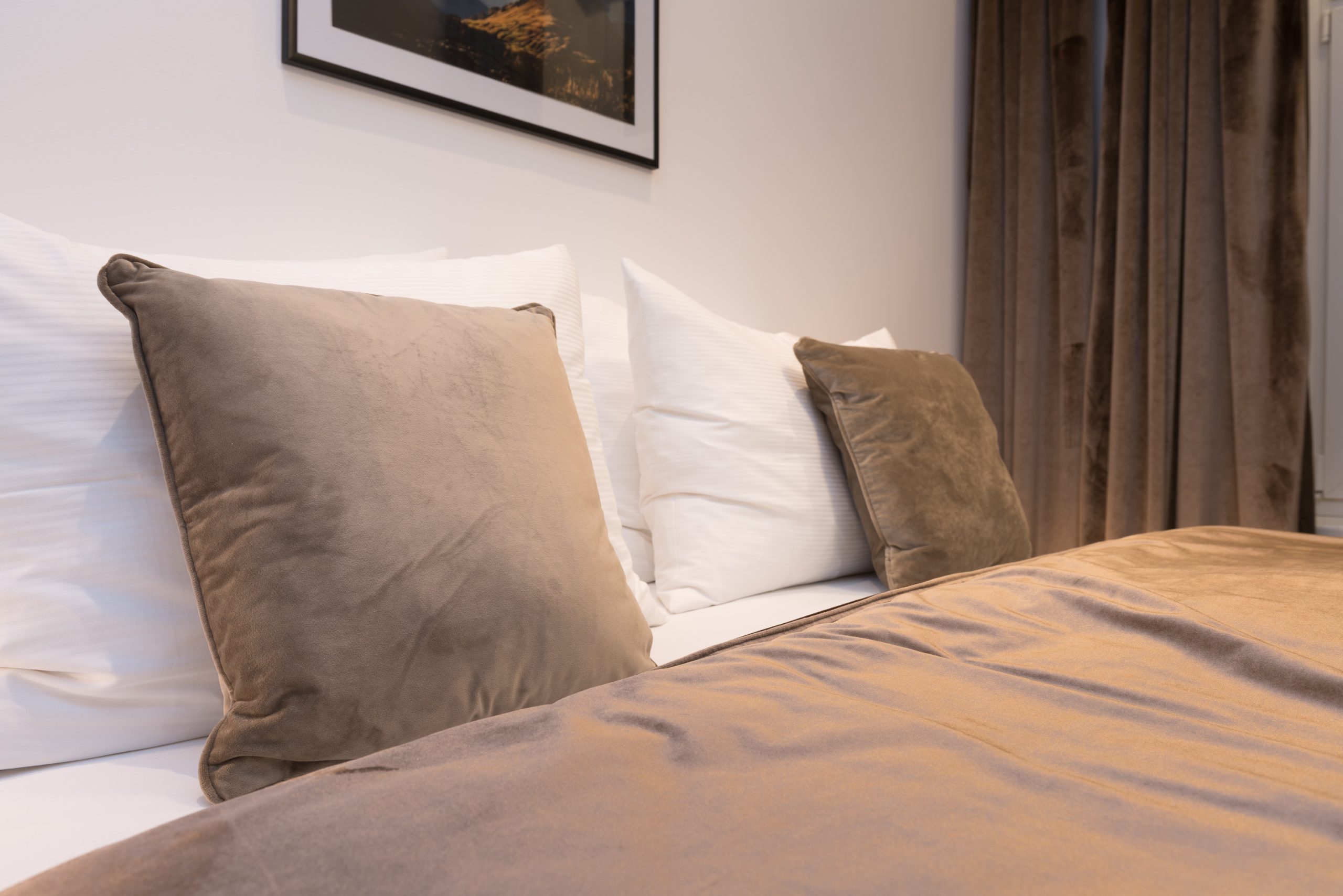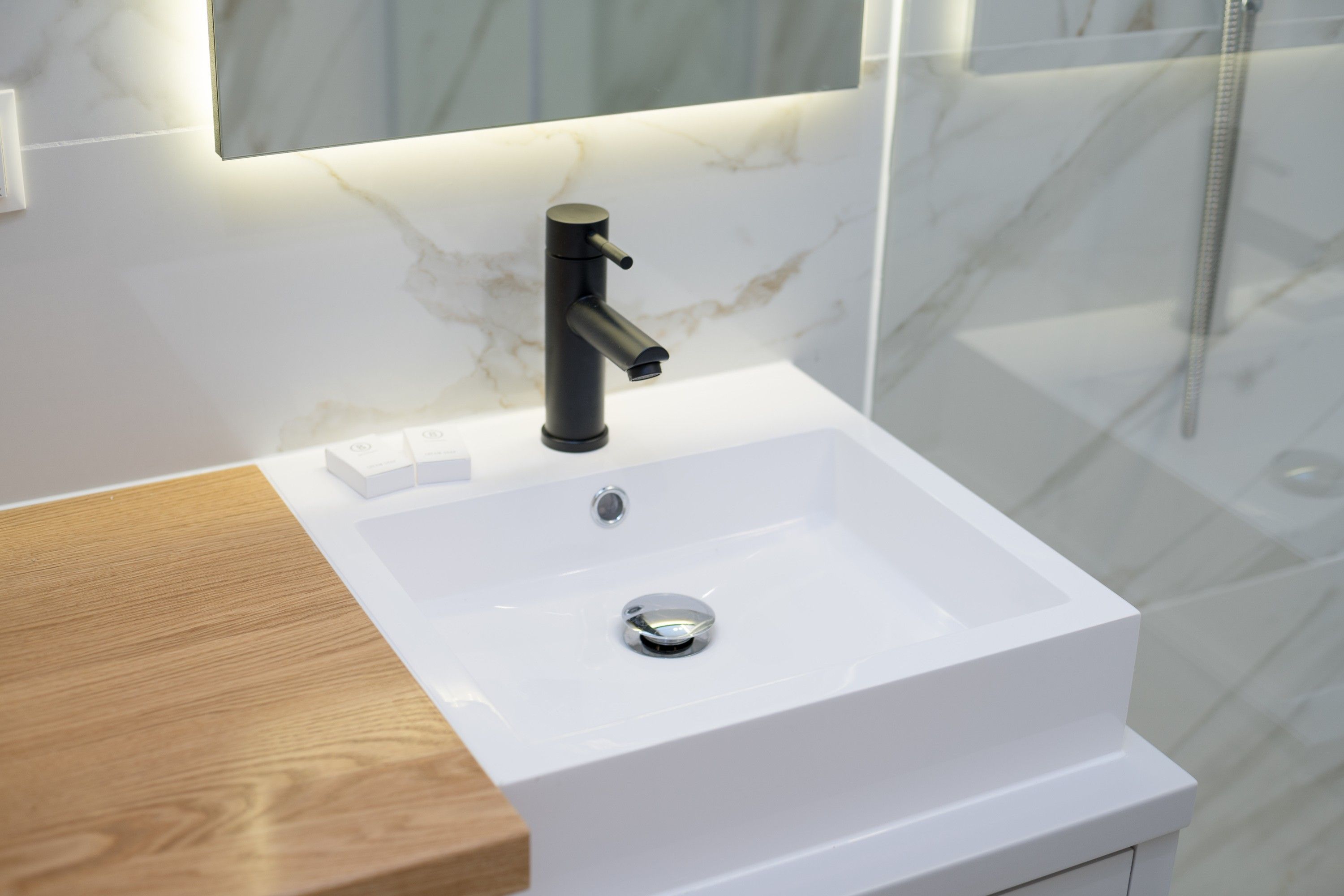 The bedroom is a true retreat, with private entrances on each side of the luxurious 5-star bed and custom blackout curtains designed for uninterrupted rest. It features an ensuite bathroom with light marble tiles and a rain shower, creating a spa-like experience. A separate toilet adds extra convenience and privacy.