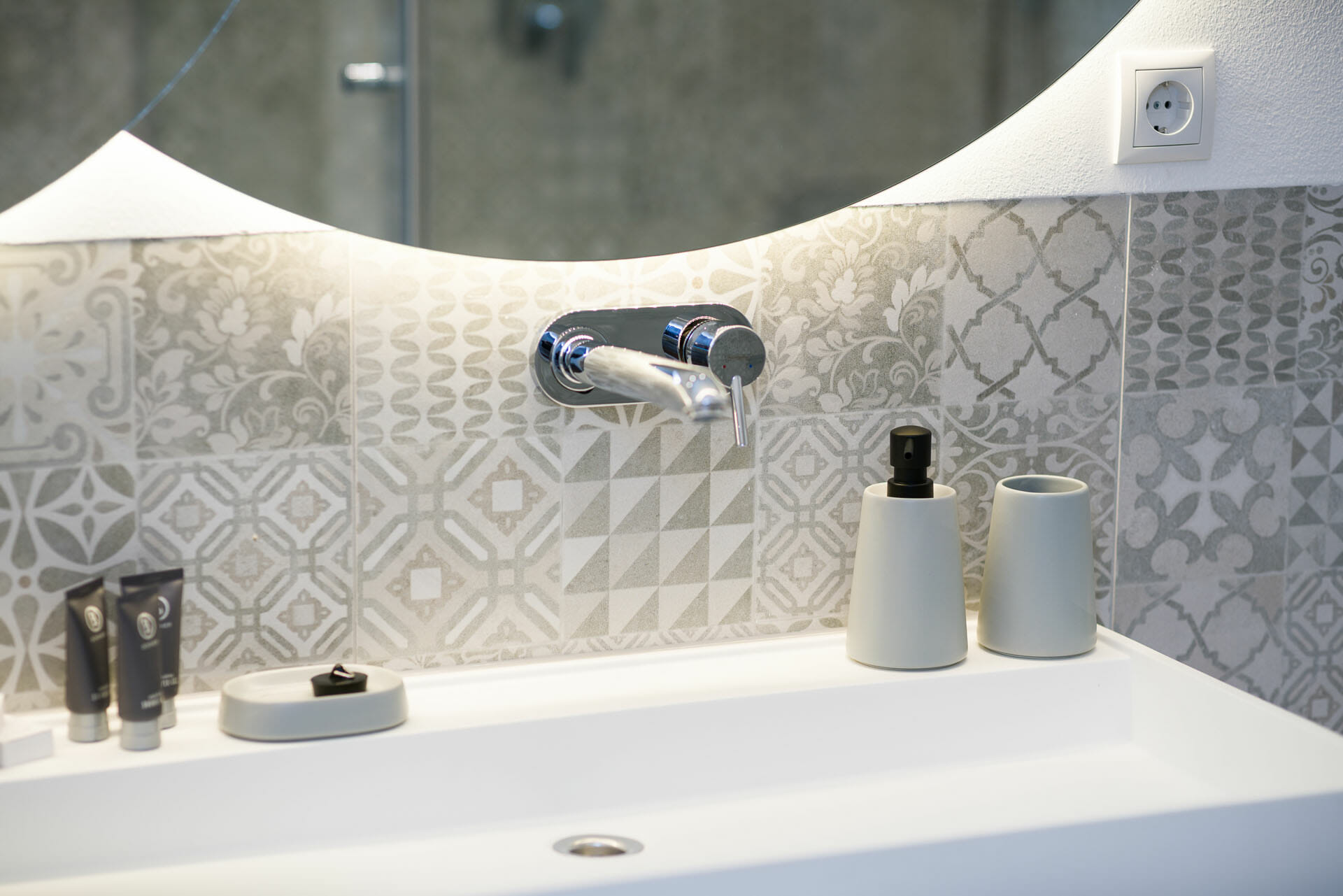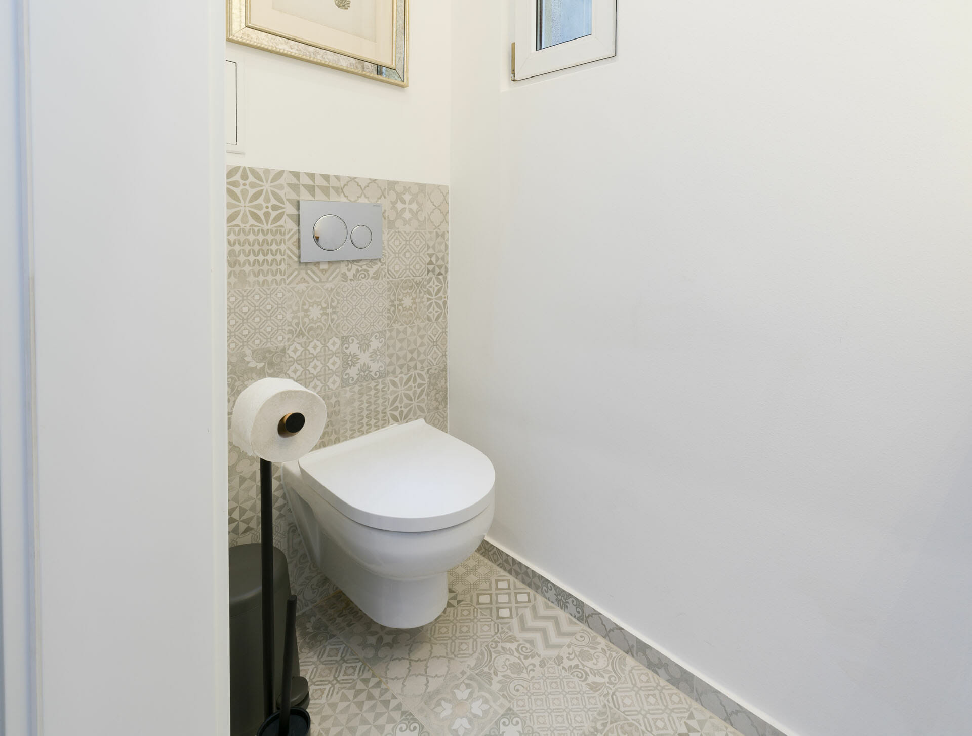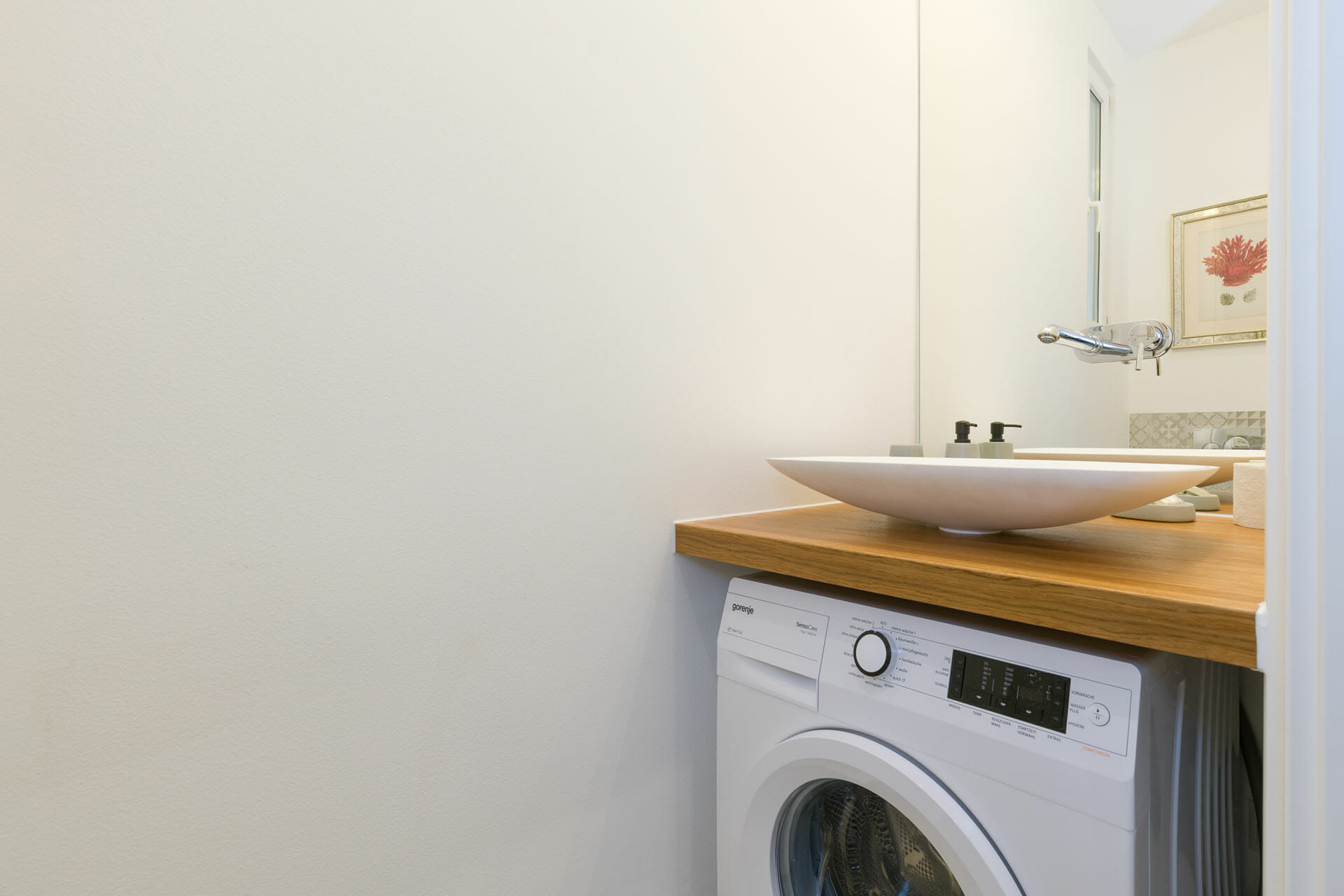 The stylish bathroom is elegantly tiled and equipped with both a shower and a classic roll-top bath. A separate toilet, conveniently located next to the bathroom, includes a washing machine under the sink for added convenience.