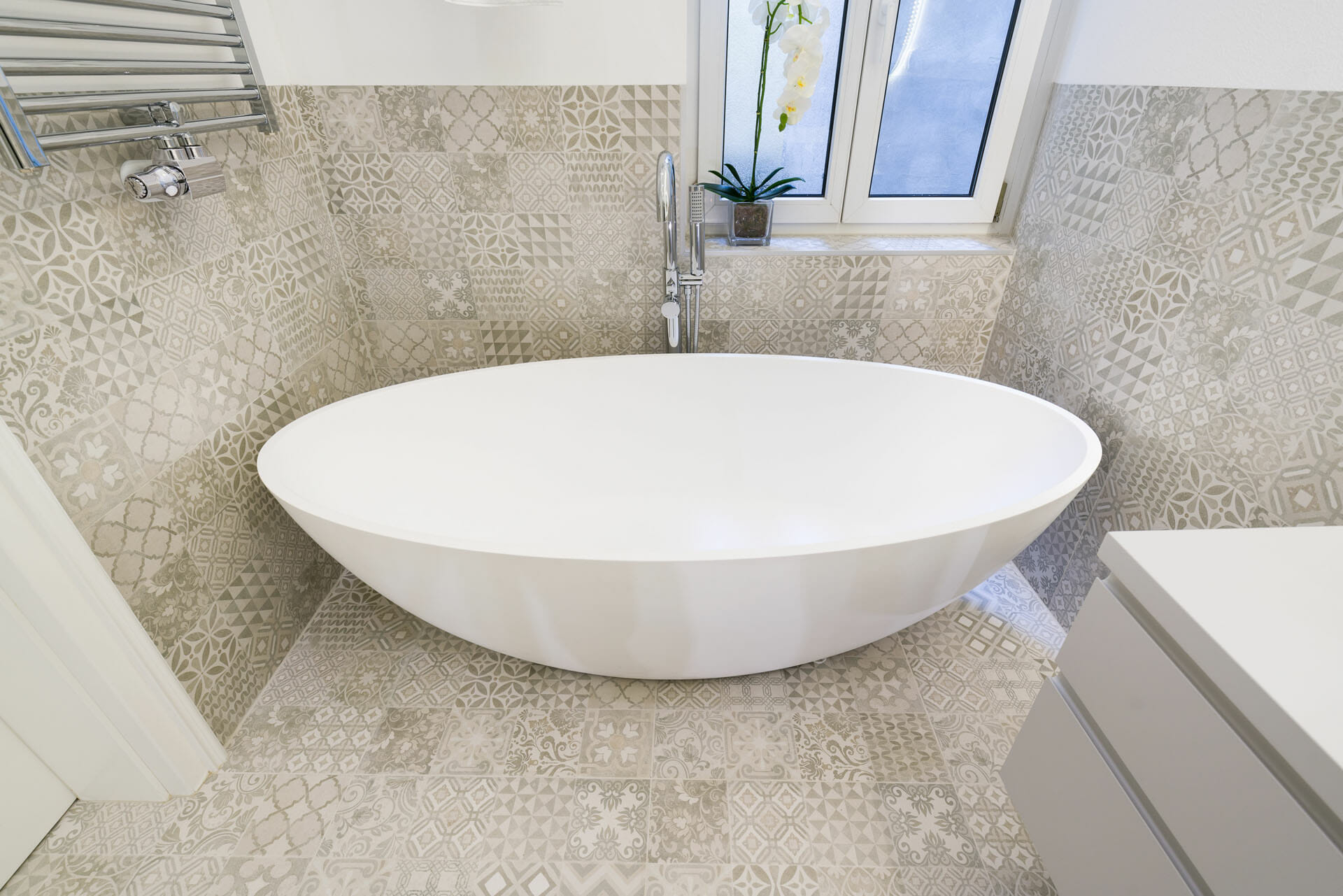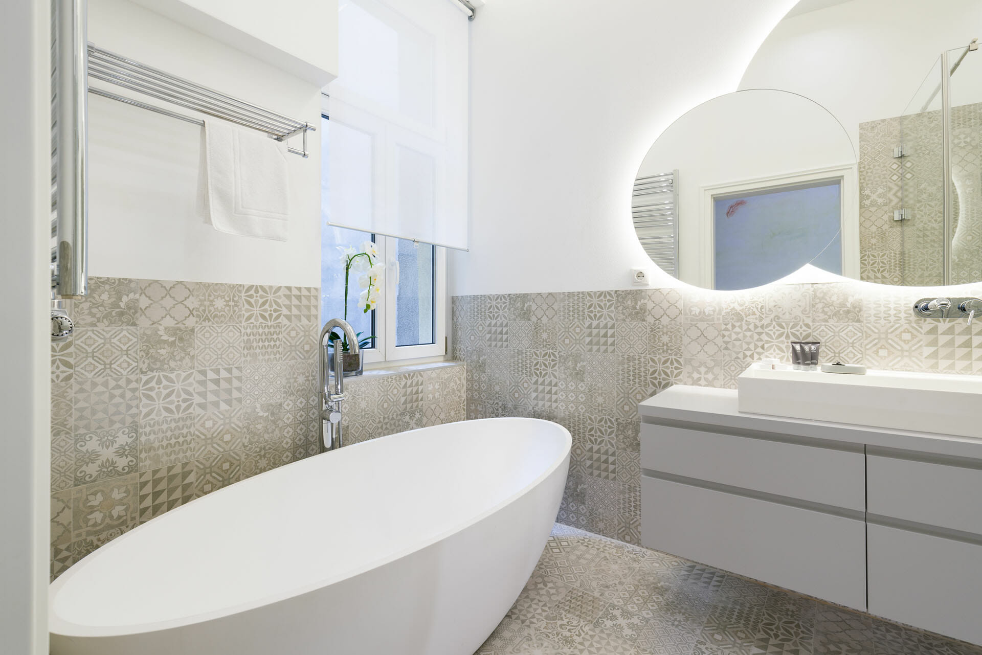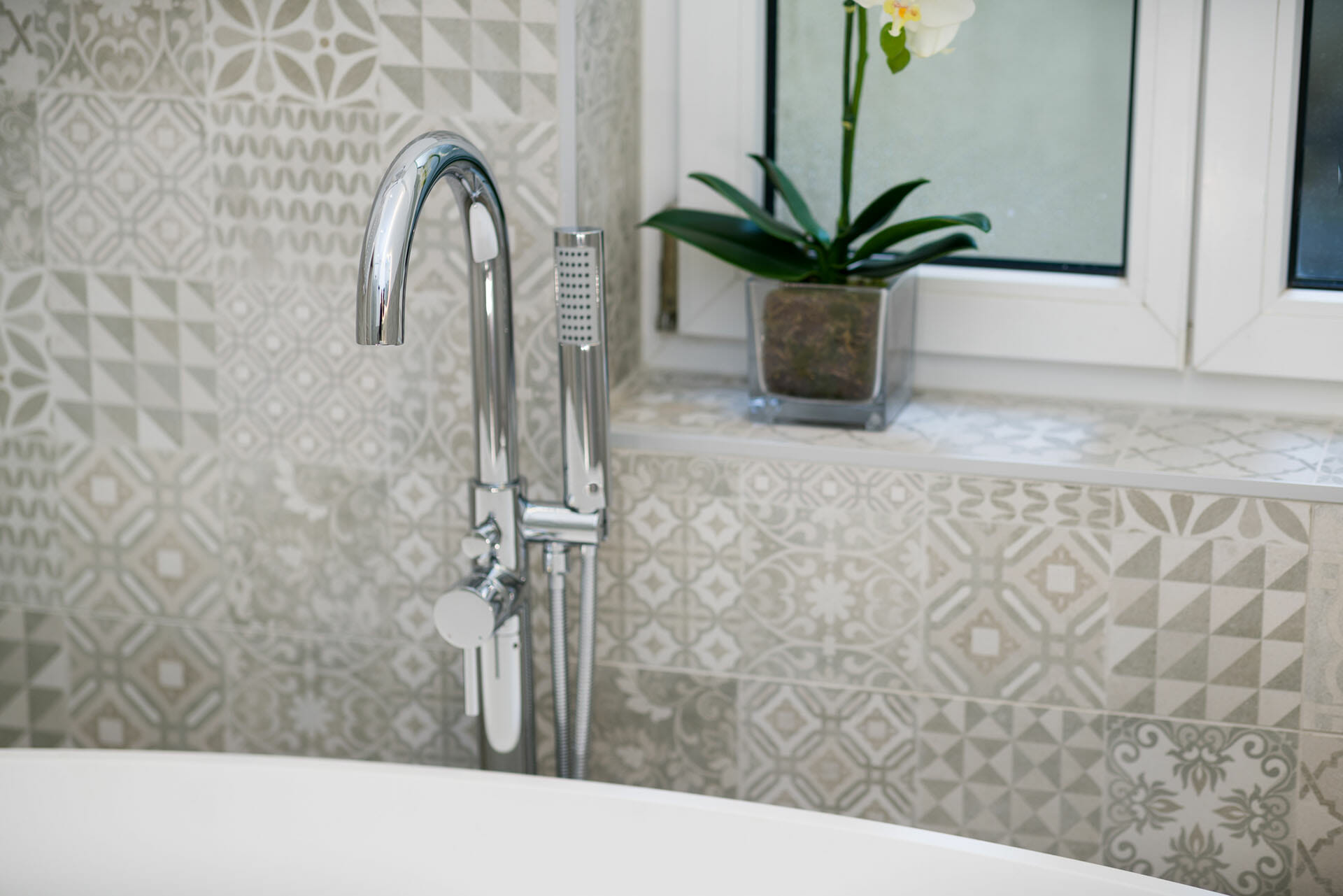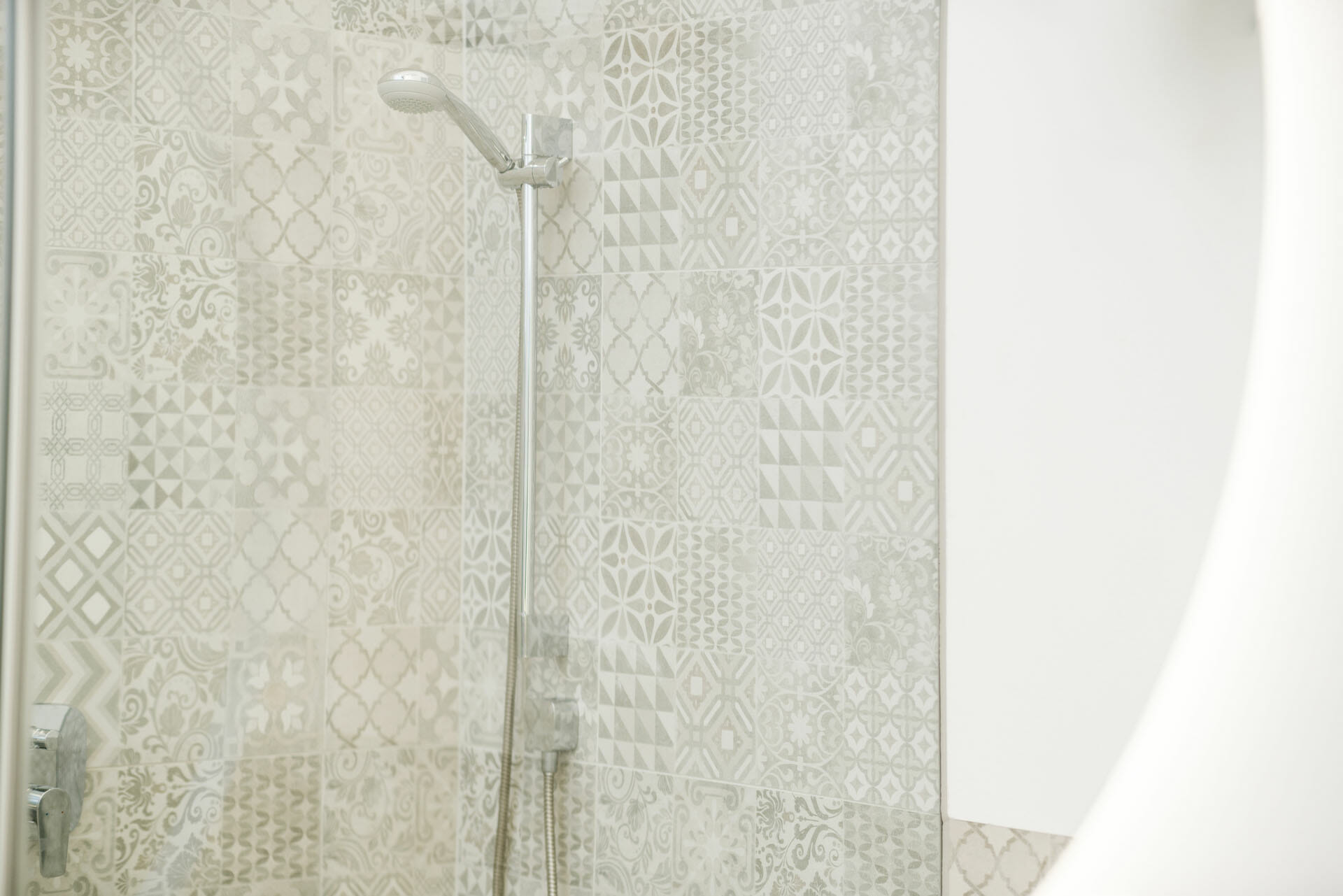 The stylish bathroom is elegantly tiled and equipped with both a shower and a classic roll-top bath. A separate toilet, conveniently located next to the bathroom, includes a washing machine under the sink for added convenience.
