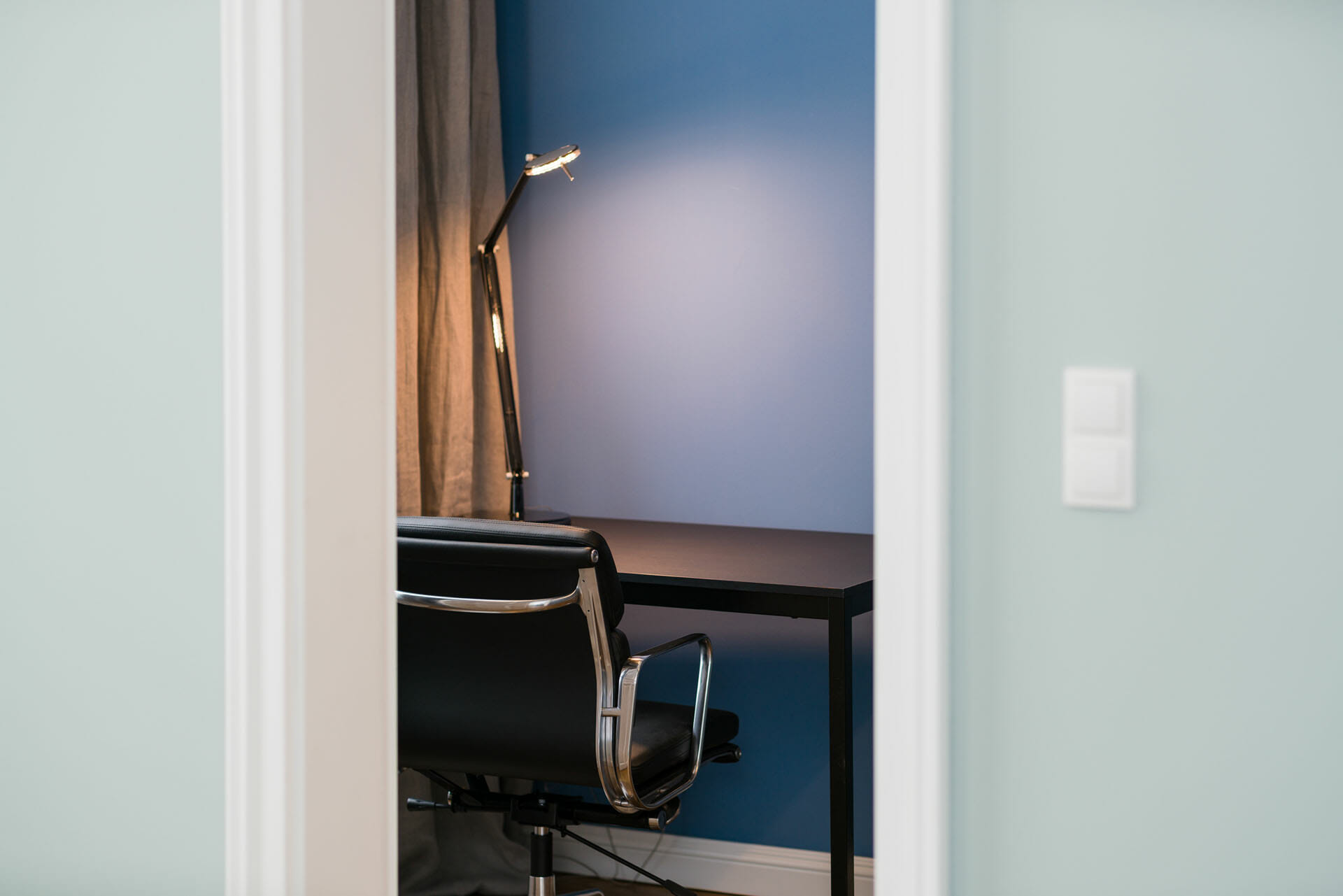 The grand master bedroom is a peaceful retreat, complete with a comfortable bed, flat-screen TV, and a tailored wardrobe. Blackout curtains ensure a restful night’s sleep, providing both comfort and privacy. Adjacent to the master bedroom is an additional room featuring a single bed that extends into a double bed, along with a writing desk. This versatile space can be used as an office, guest room, or a second bedroom, offering flexible options for your needs.