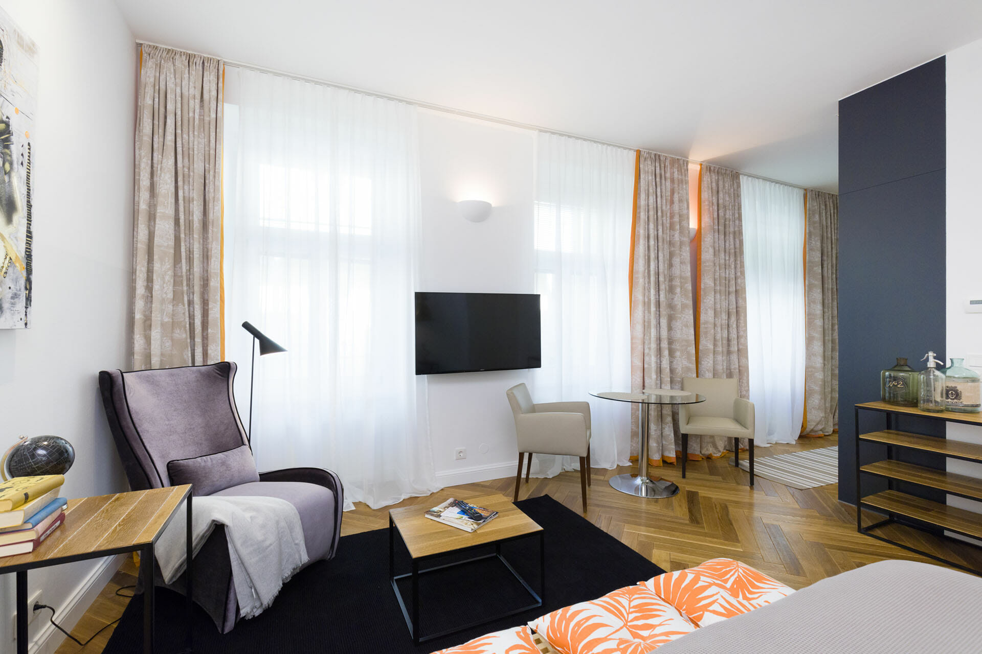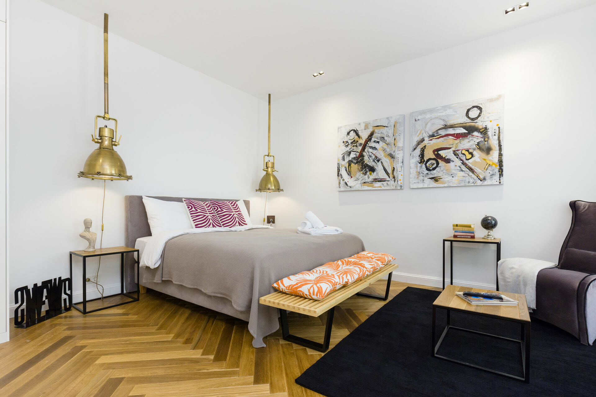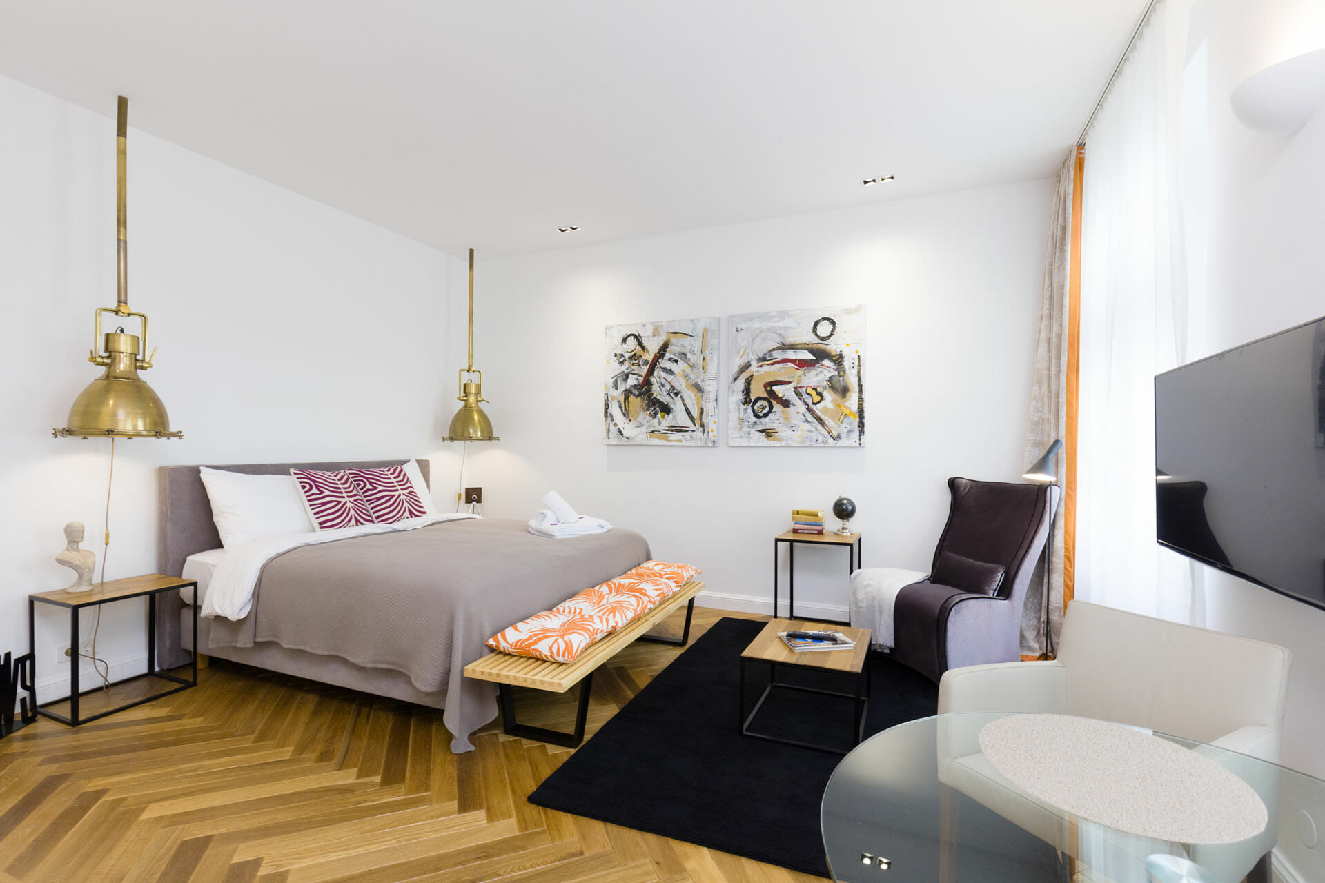 You can expect a luxurious studio of 35 m². The apartment is easily accessible via a lift and has bright rooms. The apartment was modern and high quality. The apartment has a comfortable double bed and a fully equipped kitchen. The living room is equipped with a large couch and invites you to relax. It also has a large flat screen TV.