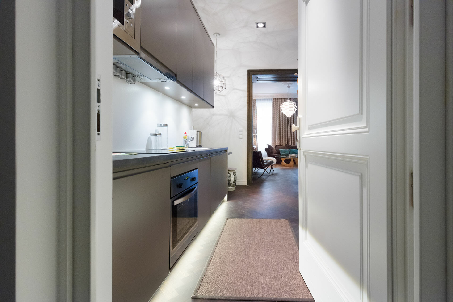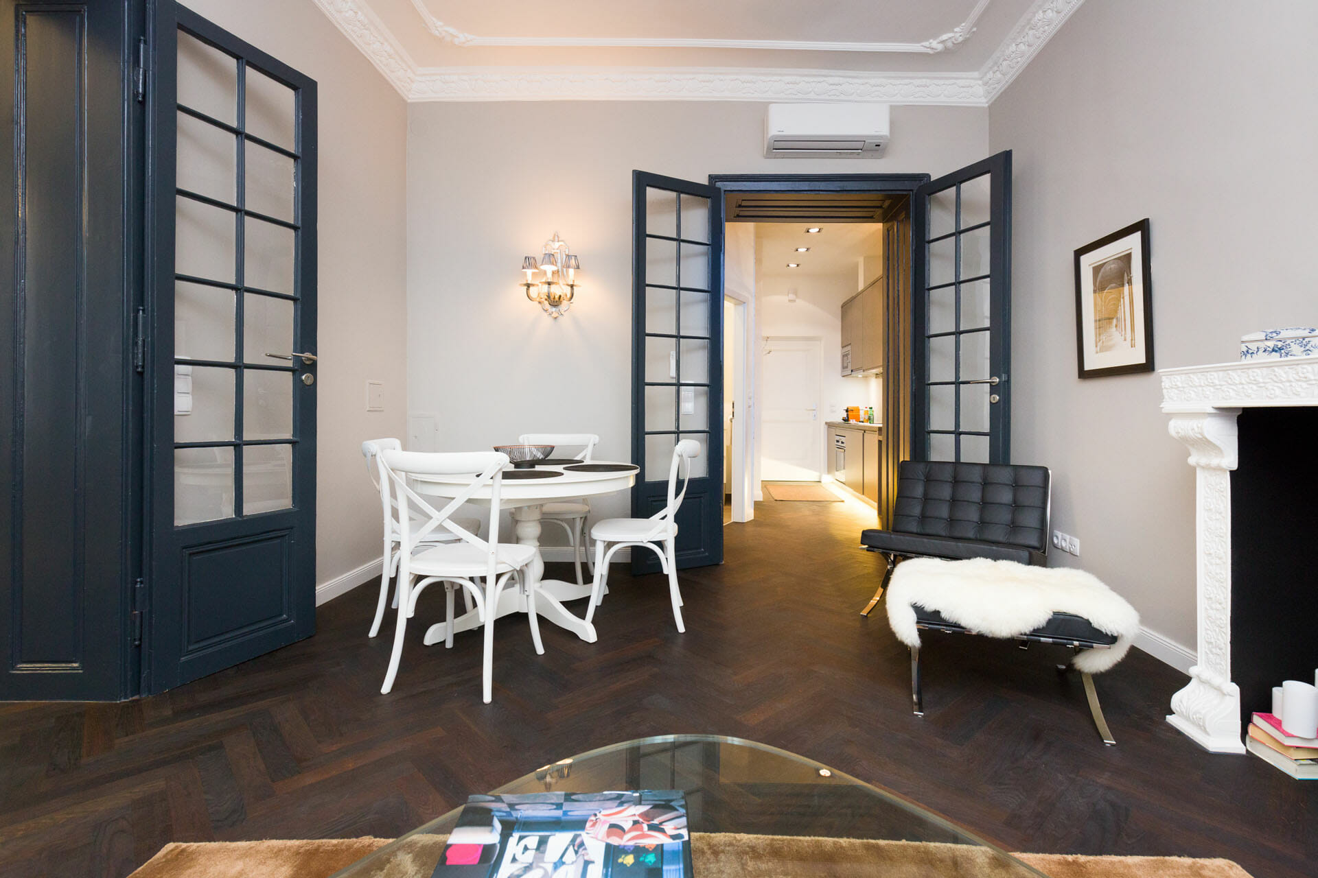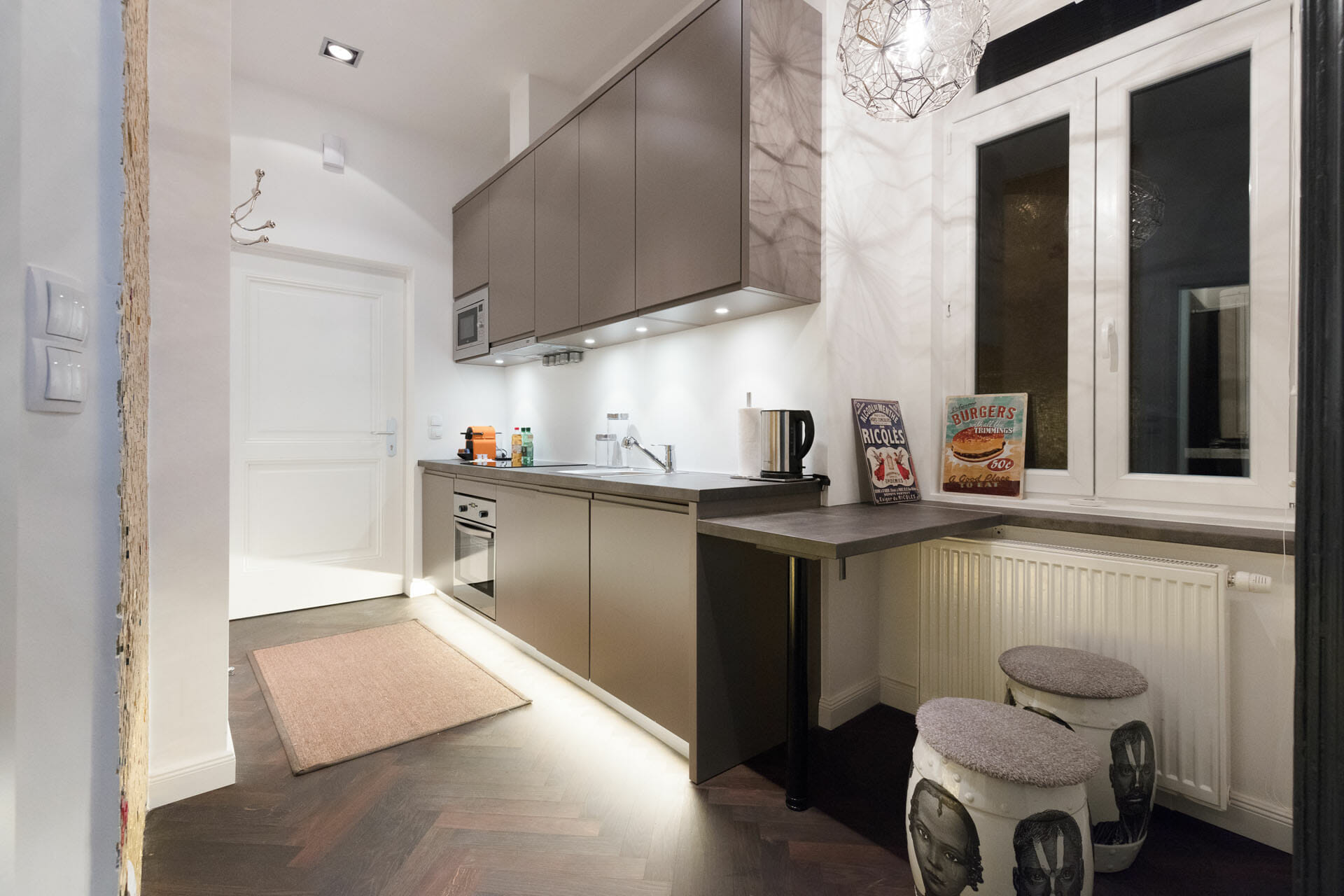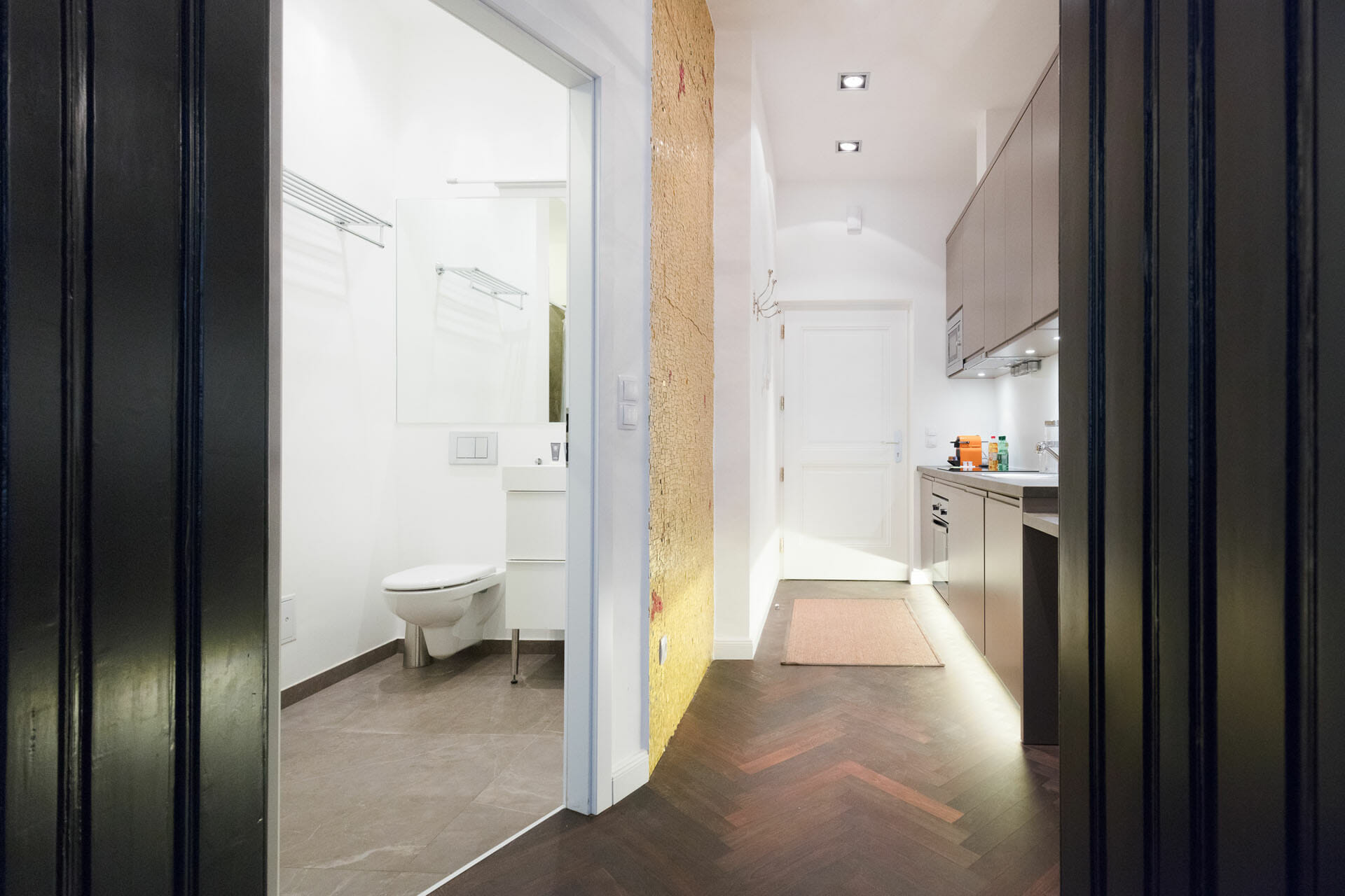 This 50 sqm apartment was recently rebuilt. It is fully equipped including air conditioning (in the old building is not very often). Old building with high rooms. TV in living room and bedroom. Altwien mass building cupboards. The apartment was completely designed with dark solid wood parquet. A modern spacious lift takes you to the 3rd floor of the fully refurbished apartment building in prime location. The attic was developed high quality.